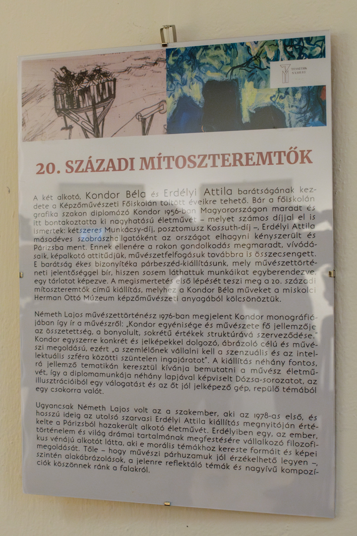A 20. századi mítoszteremtők c. Kondor Béla – Erdélyi Attila kiállítás május 14-ig látható a Ruzicskay Alkotóház nyitvatartási idejében.