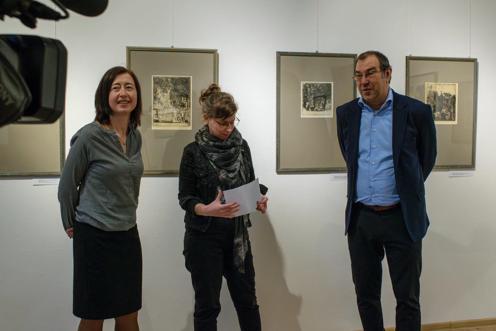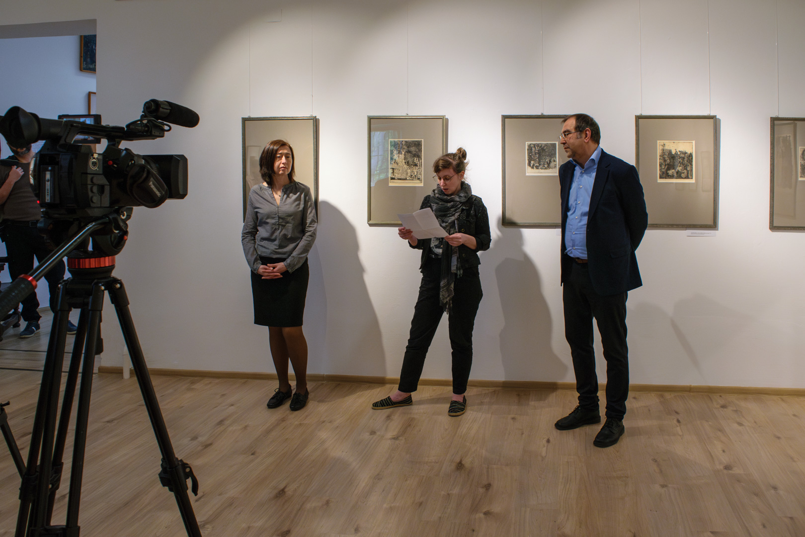 Madár Mária megnyitóbeszédében a Rákosi-korszak legkeményebb évei közül 1955-be kalauzolta a megnyitó közönségét, amikor a képzőművészeti egyetemen Kondor Béla grafikus-, Erdélyi Attila pedig szobrász-hallgató volt. Írásos bizonyíték ugyan nincsen rá, de sok jel utal rá, hogy a két fiatal barátságot kötött. Életük közös és meghatározó pontjai közé tartozott az 56-os magyar forradalom. Útjaik elváltak, mert Erdélyi Franciaországba emigrált, Kondor viszont itthonmaradt. 1957-ben aztán Kondor Derkovits-ösztöndíjjal Párizsba érkezett, ahol valószínűleg találkozott a két barát. Később, 1971-ben Kondor portrét festett Erdélyiről, valószínűleg értesült haláláról. Gondolatviláguk nem állt távol egymástól, technikájuk azonban markánsan különböző – mondta Madár Mária –, eddig soha nem volt közös kiállításuk, úgyhogy nagyszerű alkalom mindenkinek, hogy együtt lássa képeiket.