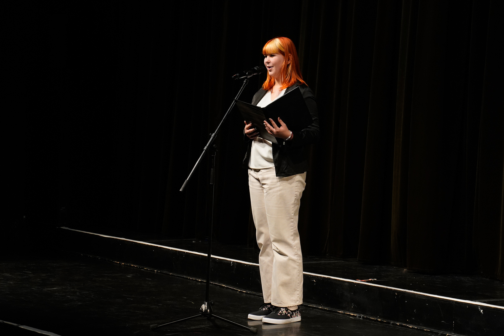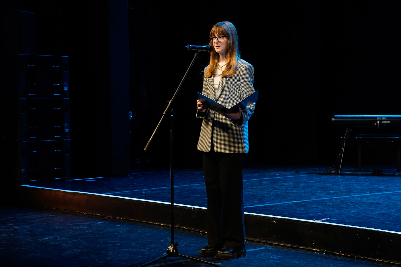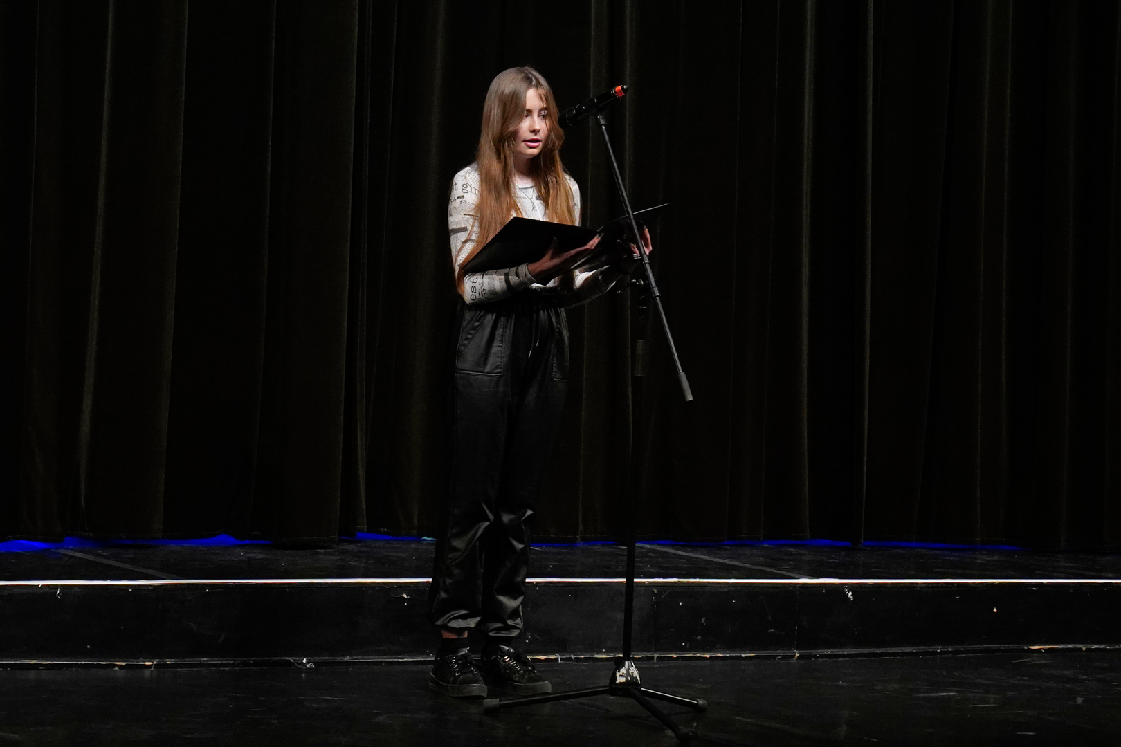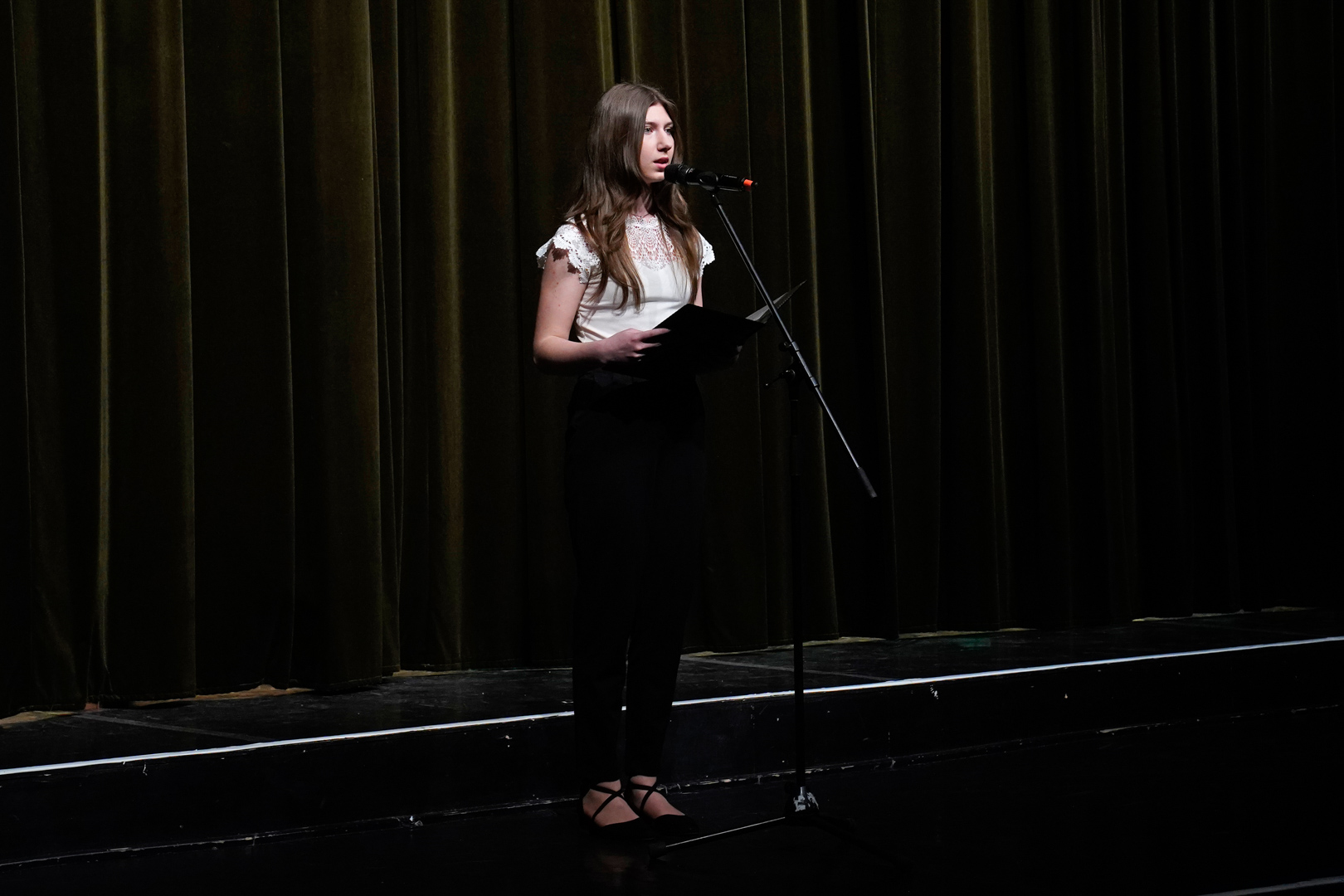 Kasnyik Hédi 11.B osztályos tanulónk a színjátszó szakkör lelkes tagja. Emellett szívesen vesz részt vers- és prózamondó versenyeken is. Most Dürgő Csaba, az előző tanévben végzett vajdás diák versét tolmácsolta a közönségnek.
