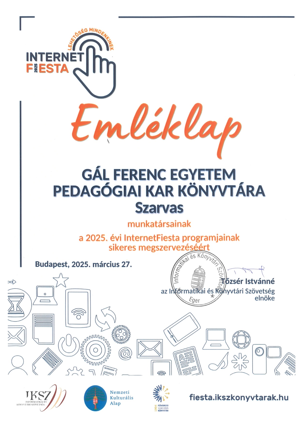 Örömmel osztjuk meg, hogy a Pedagógiai Kar Könyvtára az Internet Fiesta 2025:Lehetőség Mindenkinek keretében megrendezett programok sikeres megszervezéséért elismerésben részesült.