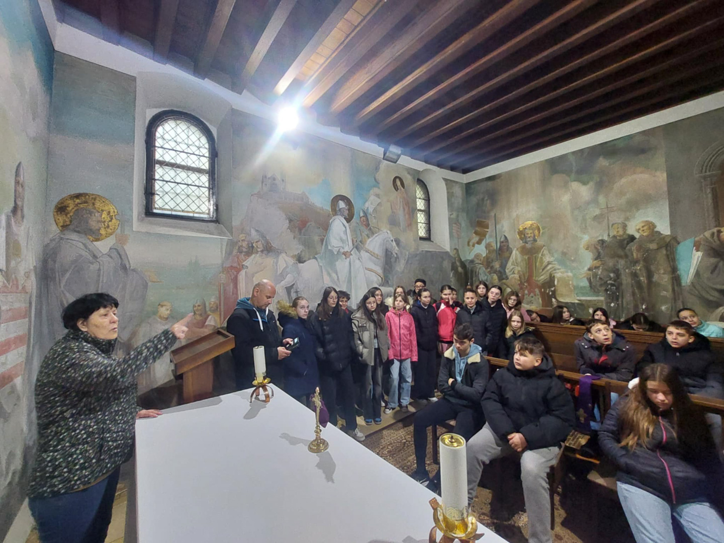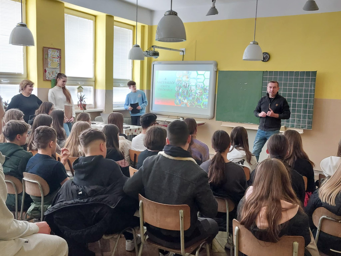 Első megállóként a nagysallói Alapiskolába érkezett a csoport, ahol a magyar iskola szeretettel várt bennünket. Az iskola tanulói a településsel kapcsolatban érdekes előadást tartottak számunkra, majd kötetlen beszélgetést folytattak tanulóinkkal. A találkozás lezárásaként együttesen megkoszorúztuk az 1849-es tavaszi hadjárat emlékművét.