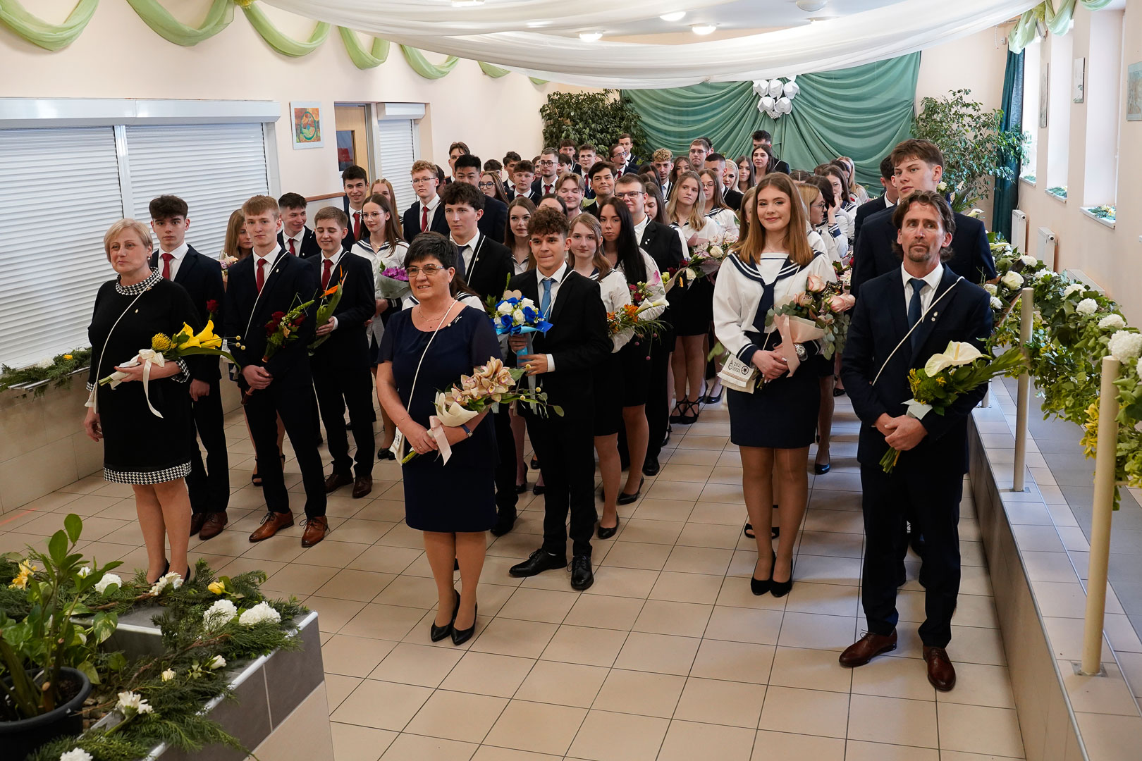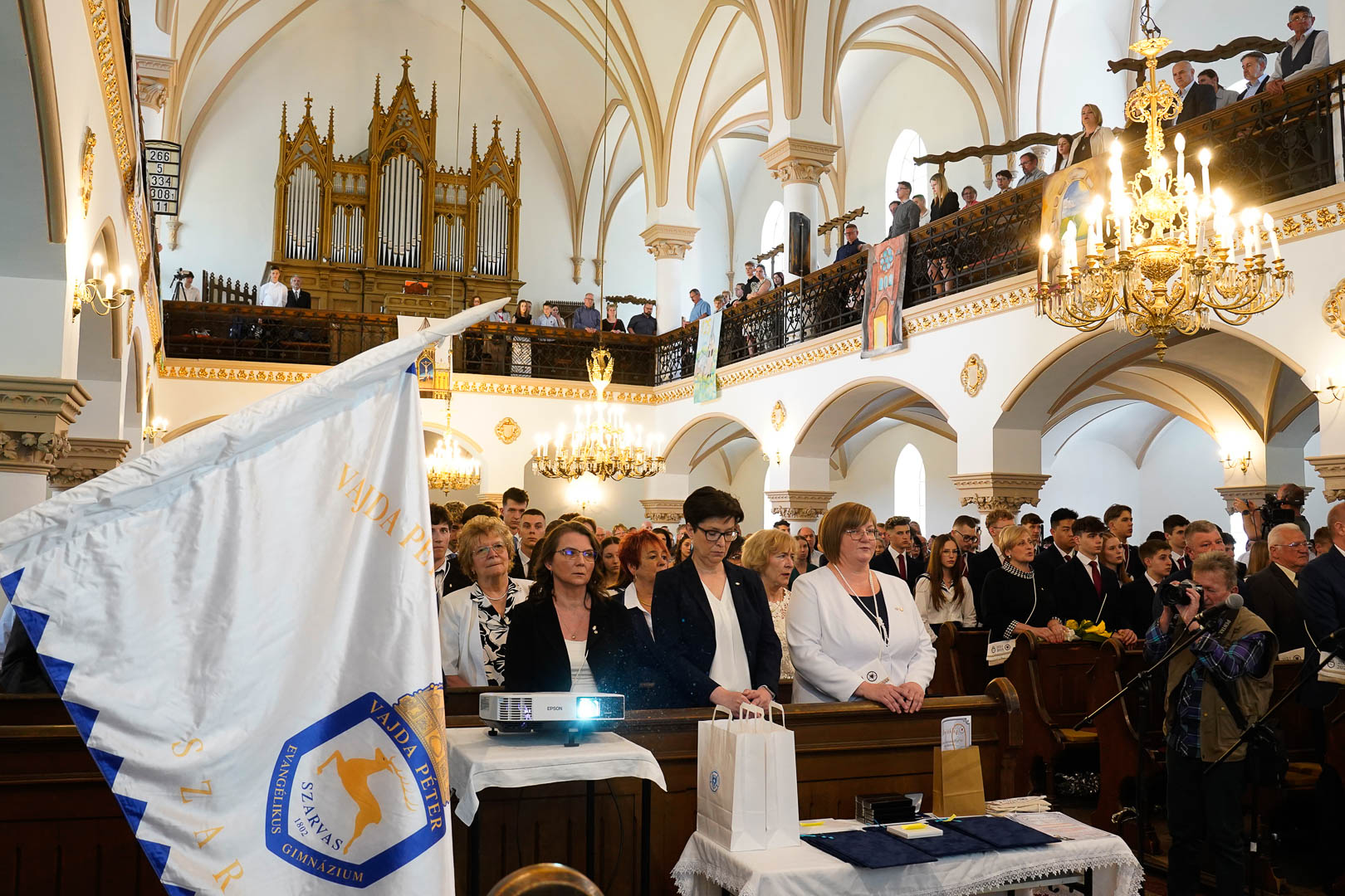 A hagyományokhoz híven idén is a kibocsájtó istentisztelettel indult a hét a Vajda Péter Evangélikus Gimnáziumban, este pedig elkísértük a 12. évfolyamot a fáklyás felvonulás keretében a Vajda-sírhoz, ahol méltóképpen elköszöntek iskolánk névadójától. A ballagás napja ezúttal szerdára esett, ami megmutatkozott ugyan a vendégek számának kisebb csökkenésében, azonban nem befolyásolta az alsóbb évesek lelkesedését, akik rengeteg virággal és nagy gonddal csodaszépre díszítették az épületet. A tarisznyák átvételével minden végzős számára egyértelművé vált, hogy itt ma tényleg egy utolsó közös séta vár rájuk a gimiben, az ünnepélyesség és megilletődöttség jegyében indultak hát el, hogy így együtt elbúcsúzzanak diáktársaiktól, tanáraiktól és az iskolától.