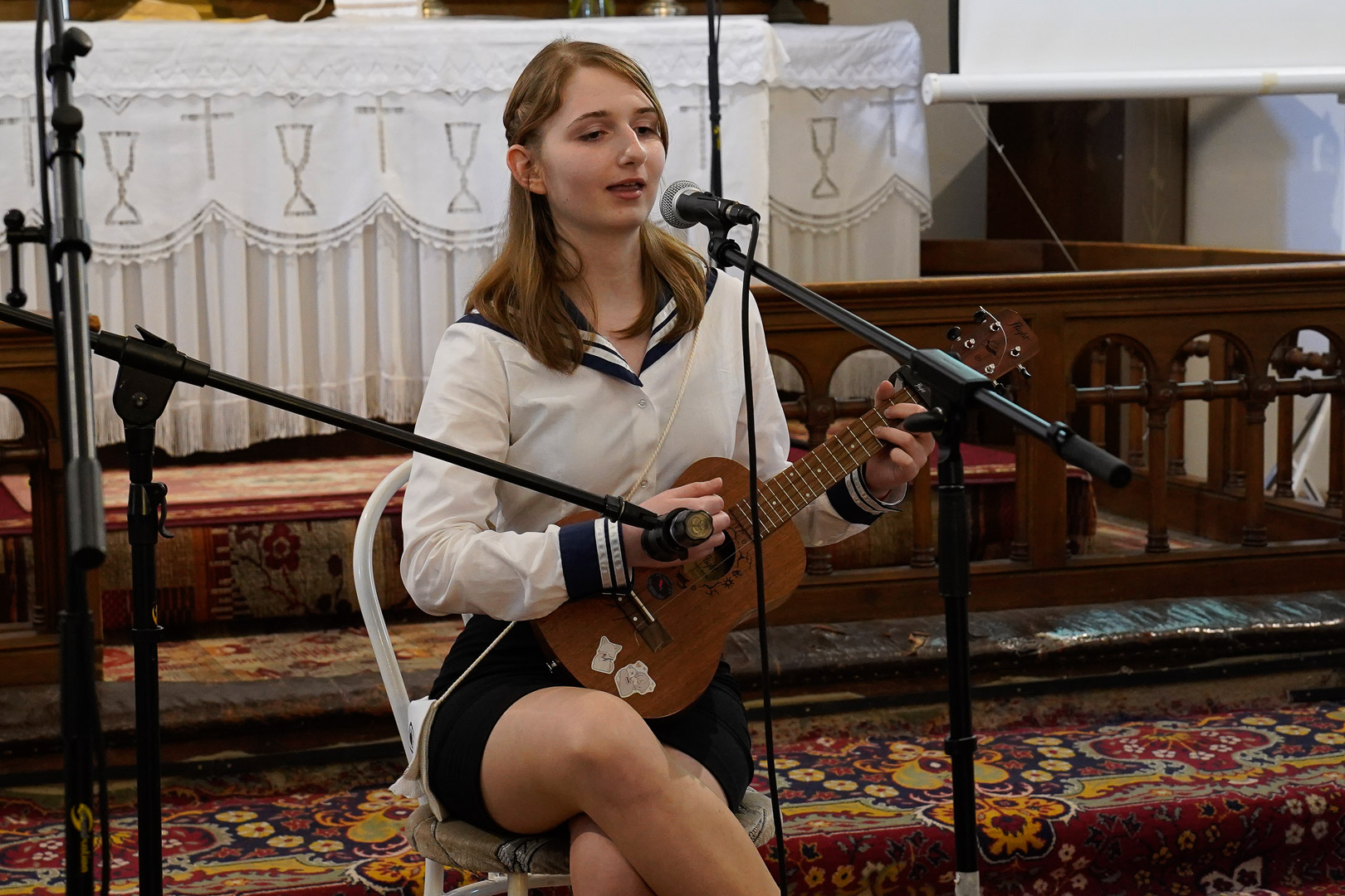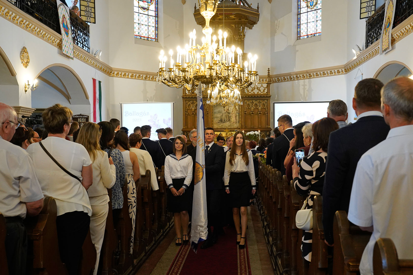 A Vajda-szobor megkoszorúzása és az osztályokat szimbolizáló plakettek a haranglábon való elhelyezése után a templomba vonult az ünneplő sokaság. Itt először az egyházi szertartás zajlott Lázár Zsolt esperes, illetve Horváth Z. Olivér és Zahorecz Pál lelkészek közreműködésével, majd Hodálik Pál polgármester a város, Lázár Zsolt pedig a fenntartó nevében köszöntötte a ballagókat. Az alsóbb évesek képviseletében Nemeskéri-Orbán Fruzsina Szabó T. Anna Útravaló című versével búcsúzott a végzősöktől, majd Nagy Boglárka olvasta fel a 11.-esek búcsúbeszédét.