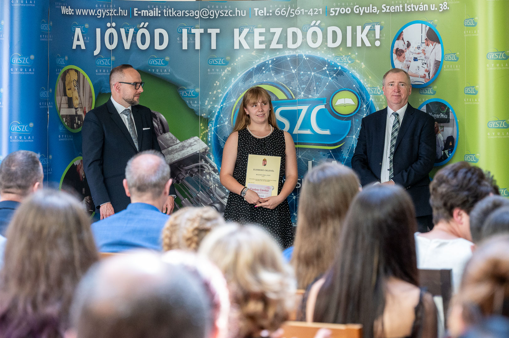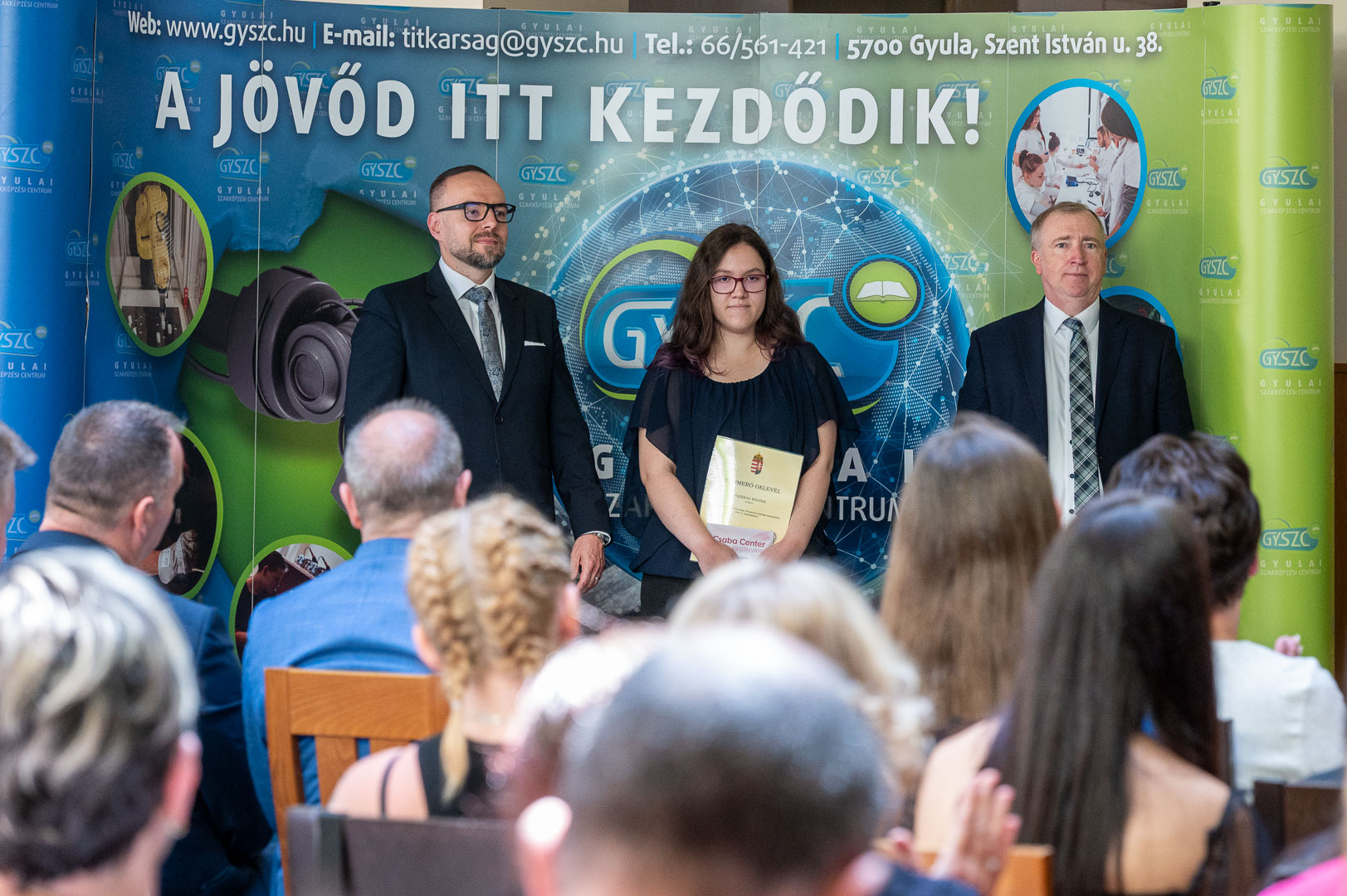 Az iskola gyönyörűen feldíszített aulájában elsőként intézményünk diákjait és tanárait szólították, akiknek Pörneki Attila István Főigazgató Úr és Simon István Tamás Kancellár Úr adta át az okleveleket.