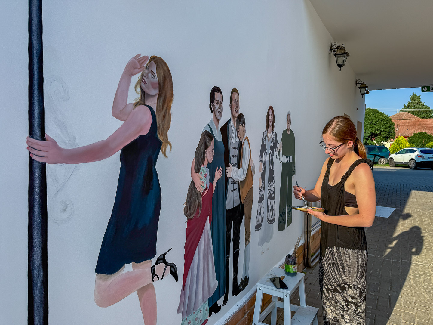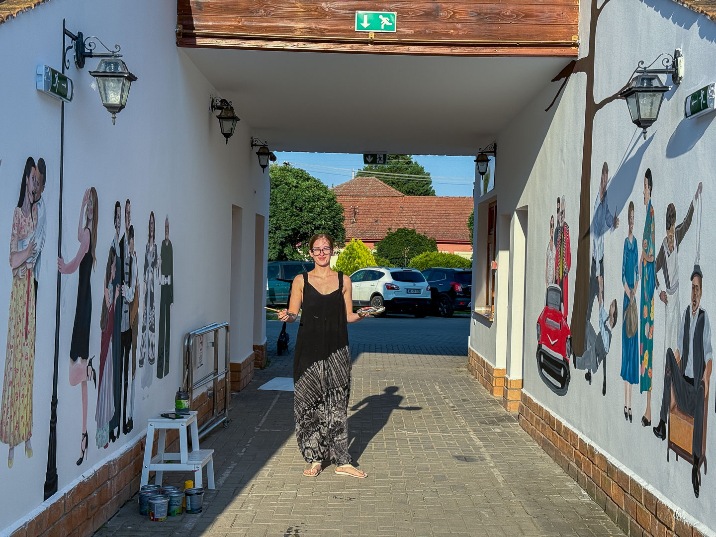 Kérdésünkre válaszolva Emma elmondta, hogy a Szarvasi Vízi Színház szellemiségéhez kapcsolódó jeleneteket szeretne megjeleníteni a falfestményen, ezért a Cervinus Teátrum művészeit és az itteni előadásokból vett részleteket festi fel, amelyeket a teljes falfelületen összefűz majd.