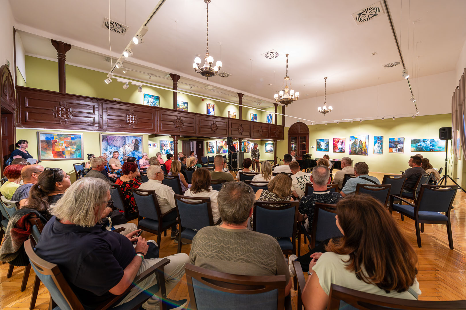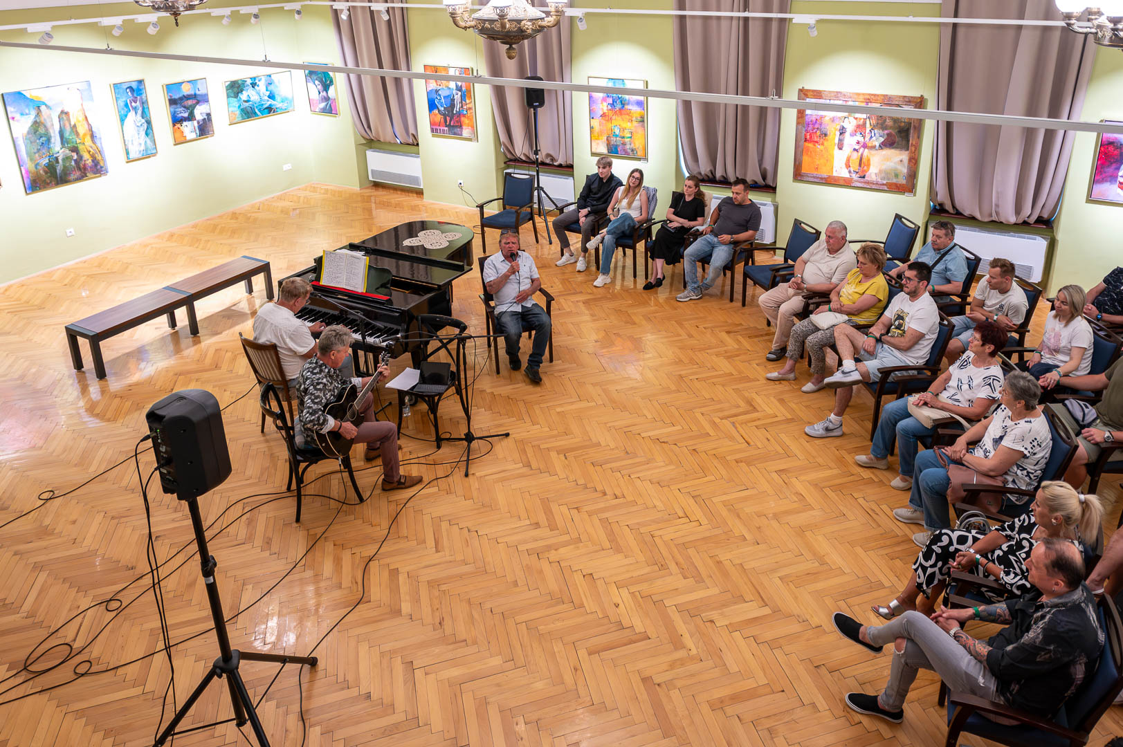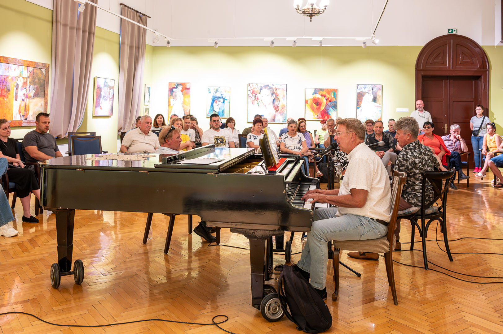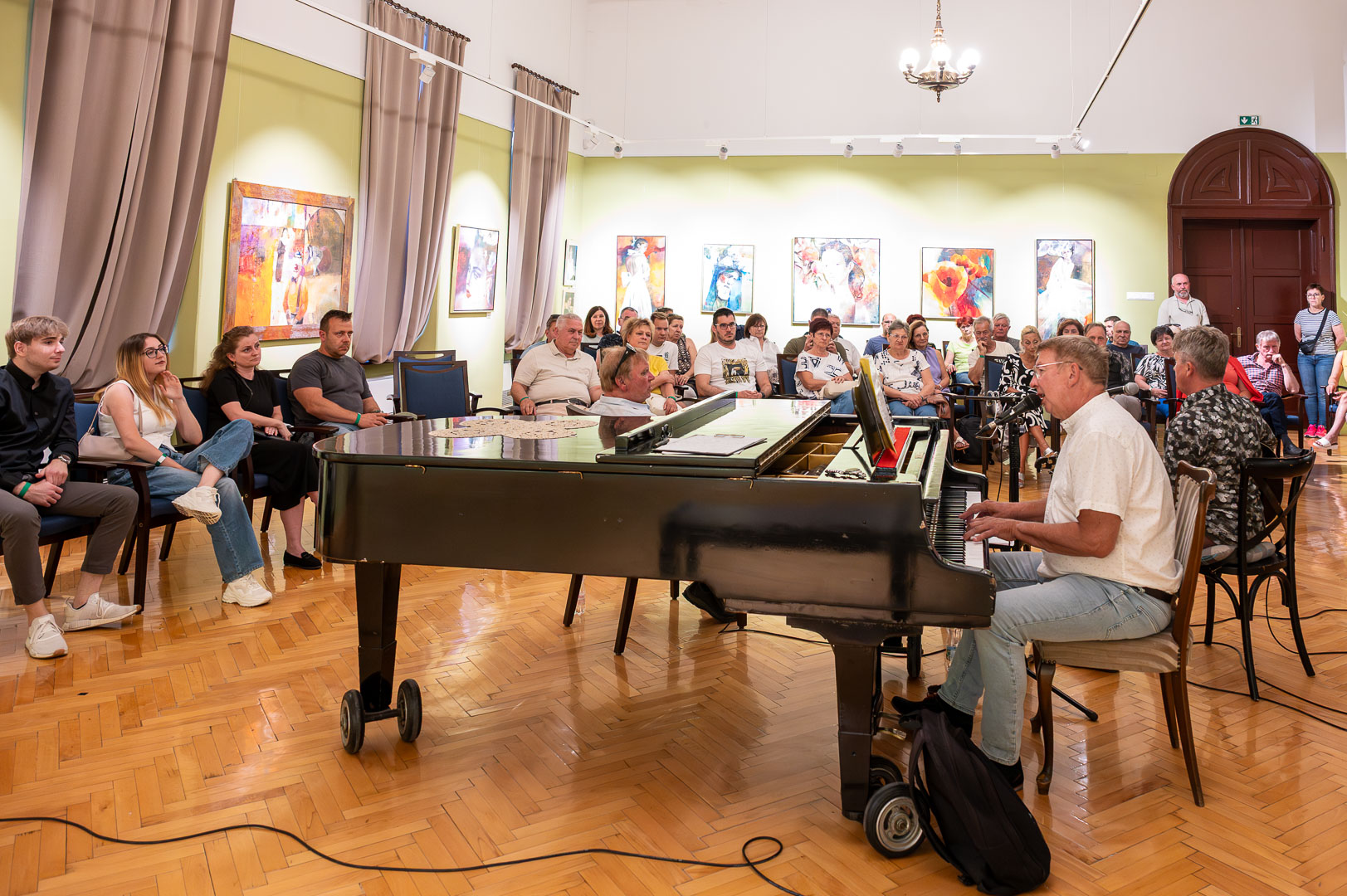 A díszteremben Korbely István festőművész zenész barátaival, Szuromi Zoltánnal (zongora) és Komár Jánossal, Jansival (ének) zenei aláfestés kíséretében mellett vezette végig nemrég megnyílt kiállításán a nagyszámú érdeklődőt.