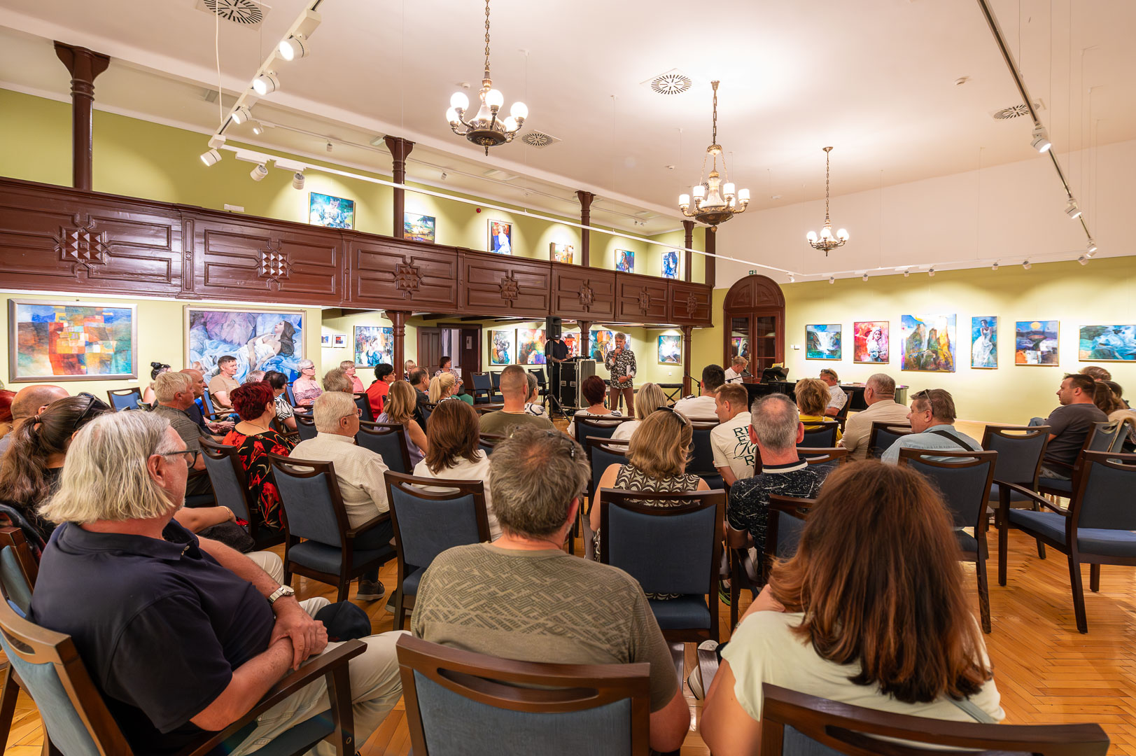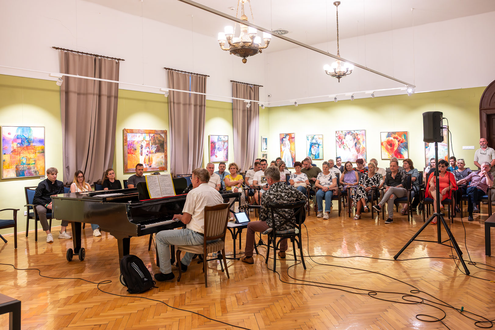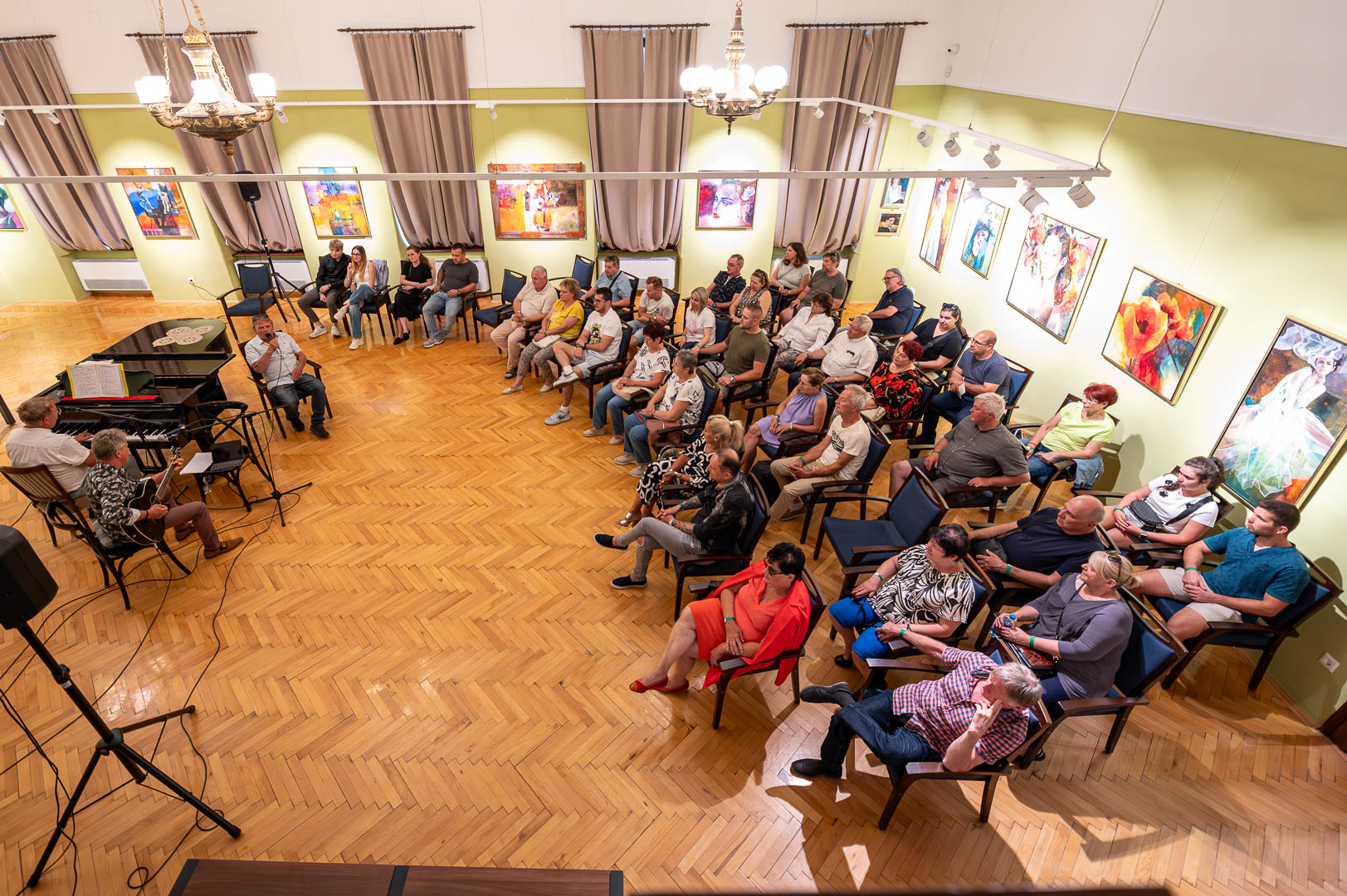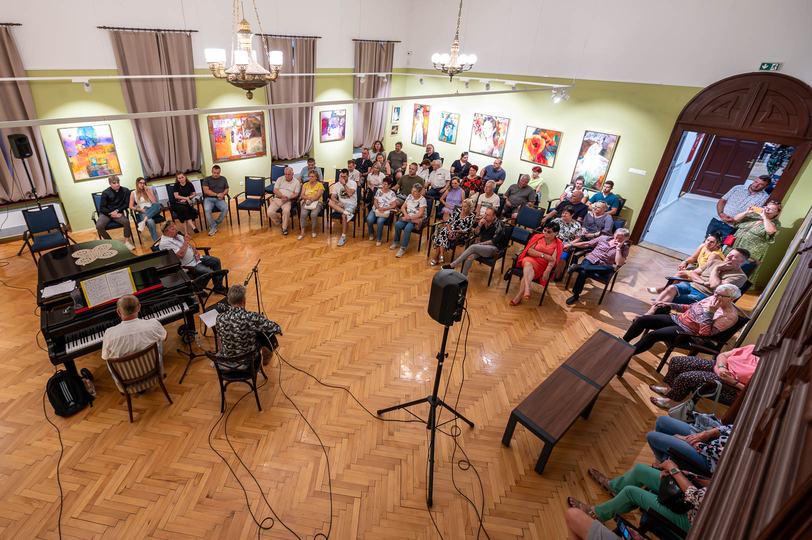 A díszteremben Korbely István festőművész zenész barátaival, Szuromi Zoltánnal (zongora) és Komár Jánossal, Jansival (ének) zenei aláfestés kíséretében mellett vezette végig nemrég megnyílt kiállításán a nagyszámú érdeklődőt.