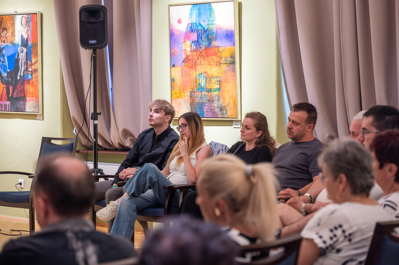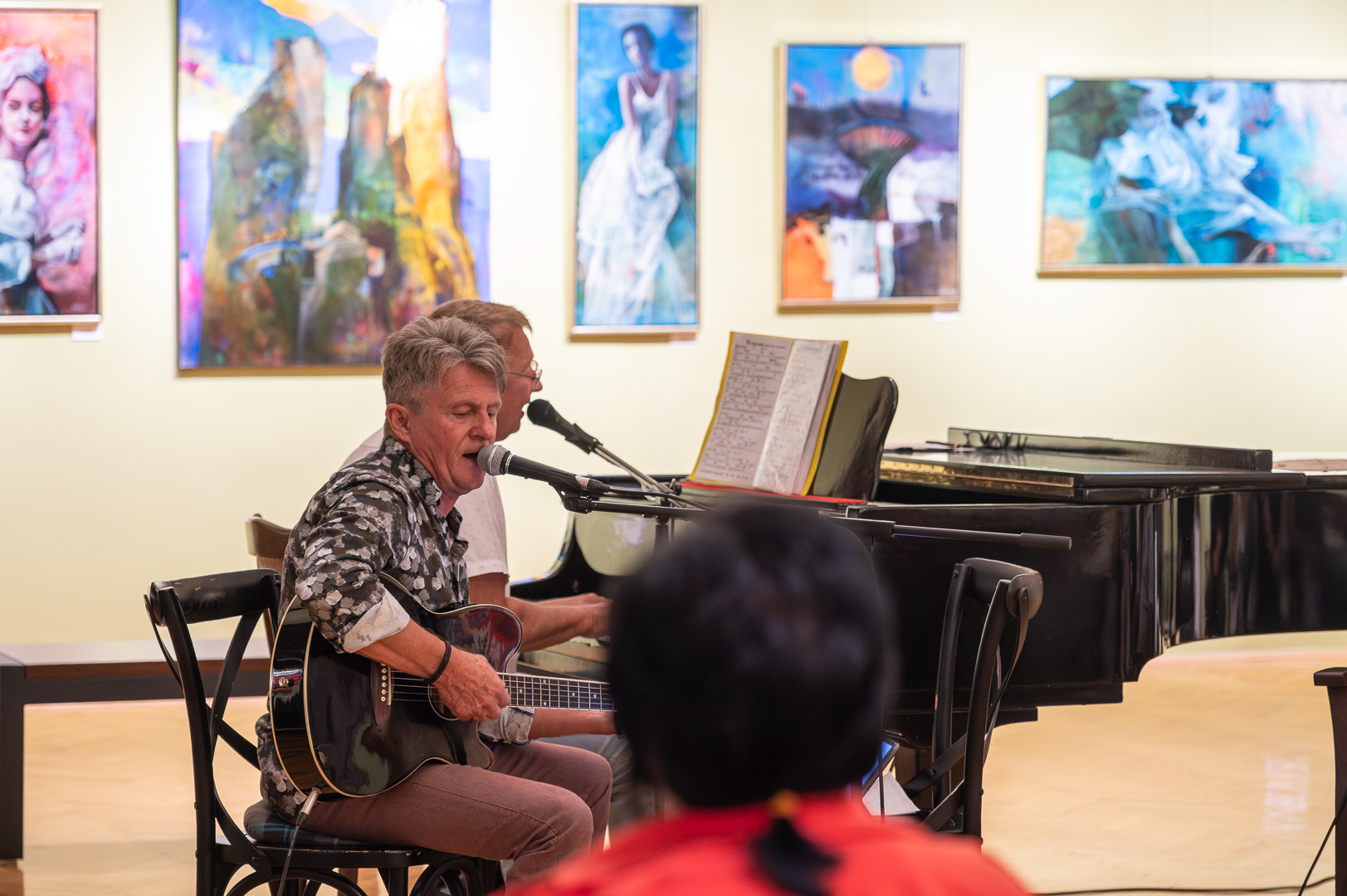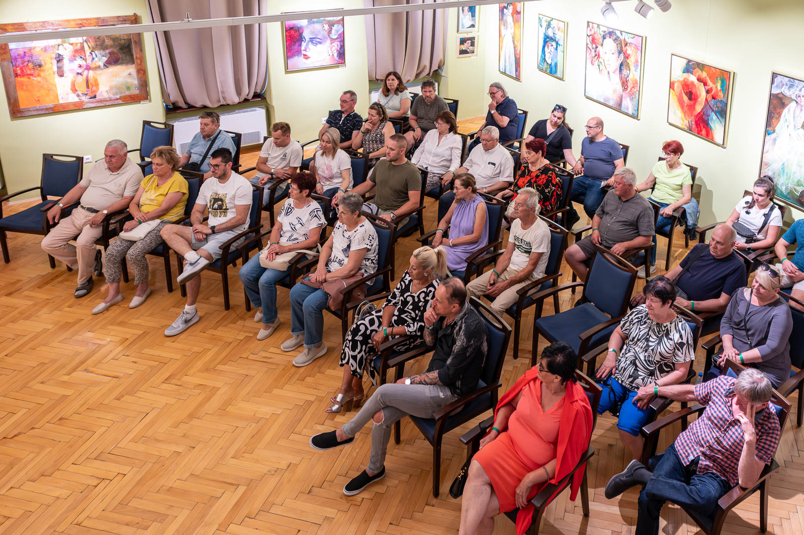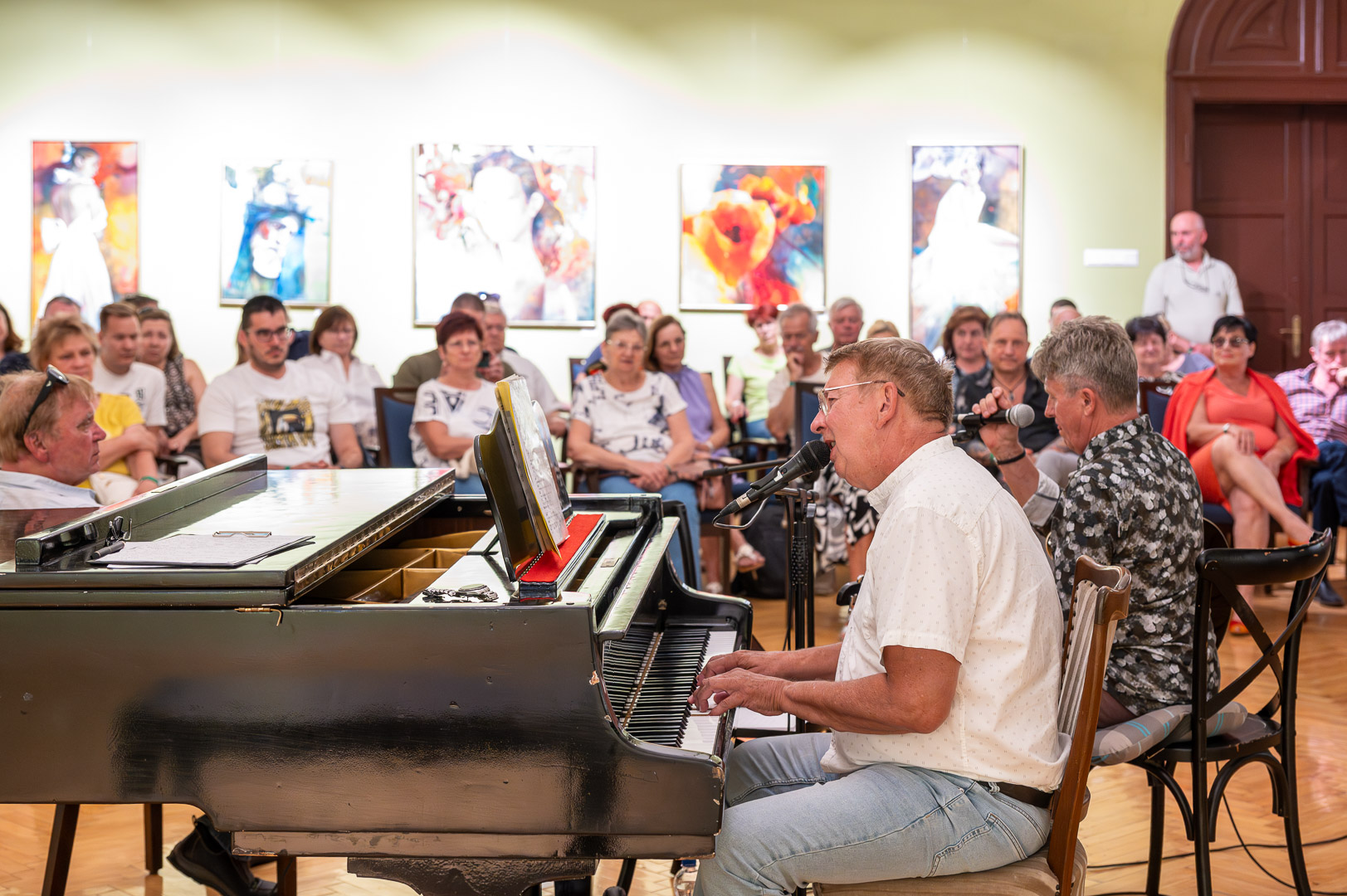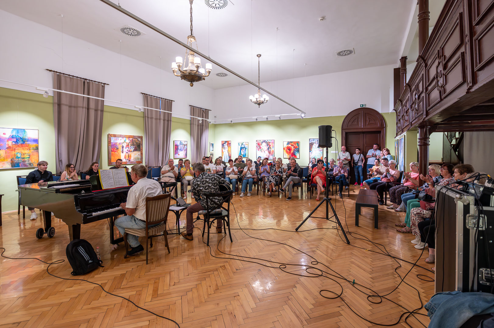 A díszteremben Korbely István festőművész zenész barátaival, Szuromi Zoltánnal (zongora) és Komár Jánossal, Jansival (ének) zenei aláfestés kíséretében mellett vezette végig nemrég megnyílt kiállításán a nagyszámú érdeklődőt.