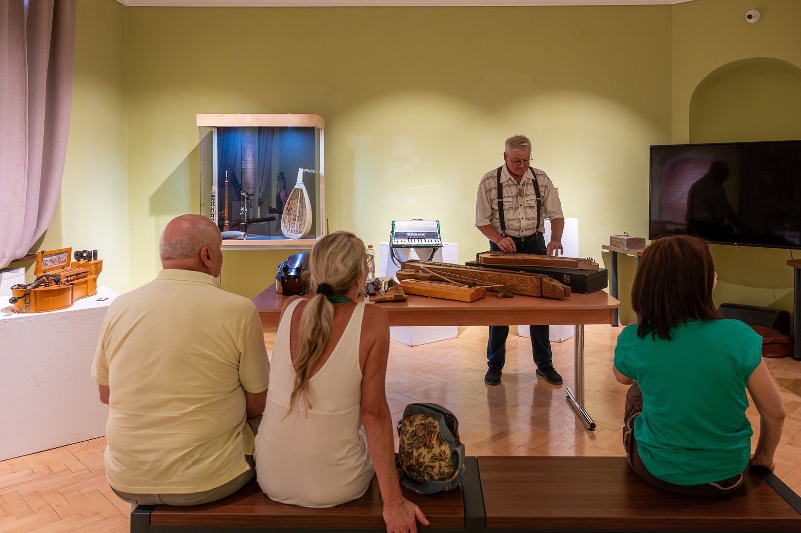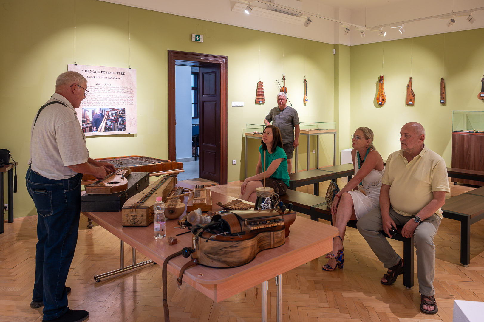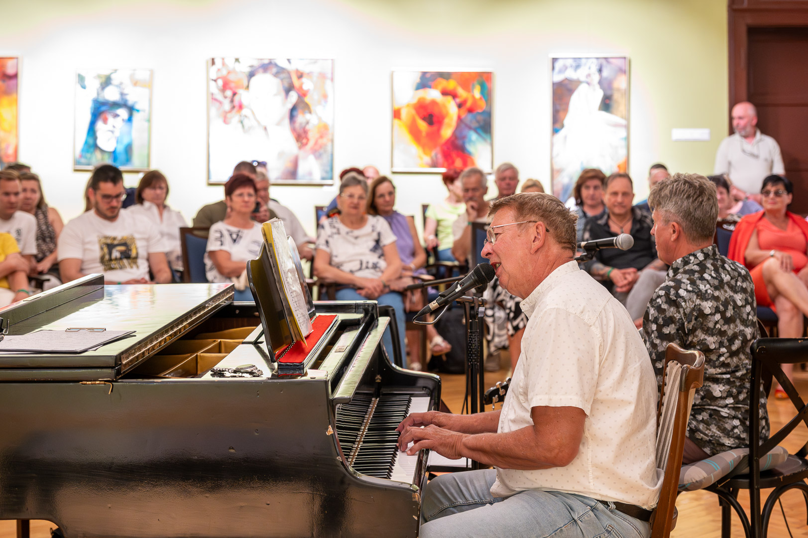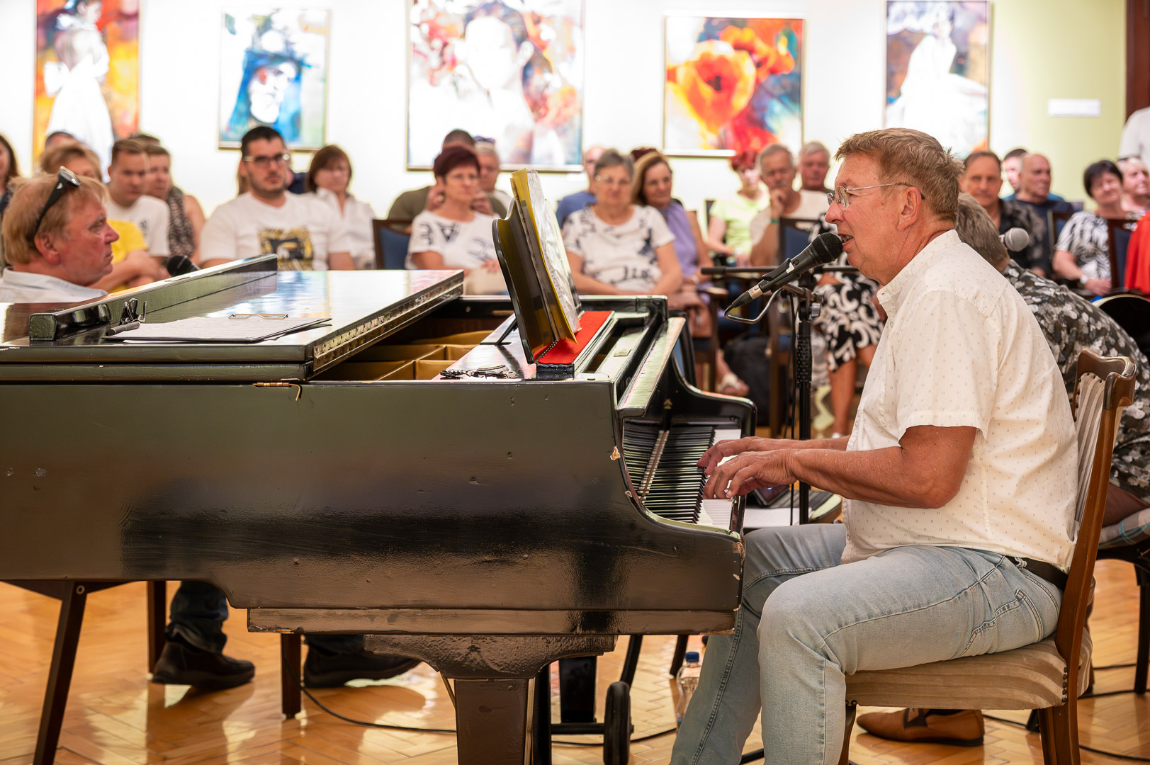 A díszteremben Korbely István festőművész zenész barátaival, Szuromi Zoltánnal (zongora) és Komár Jánossal, Jansival (ének) zenei aláfestés kíséretében mellett vezette végig nemrég megnyílt kiállításán a nagyszámú érdeklődőt.