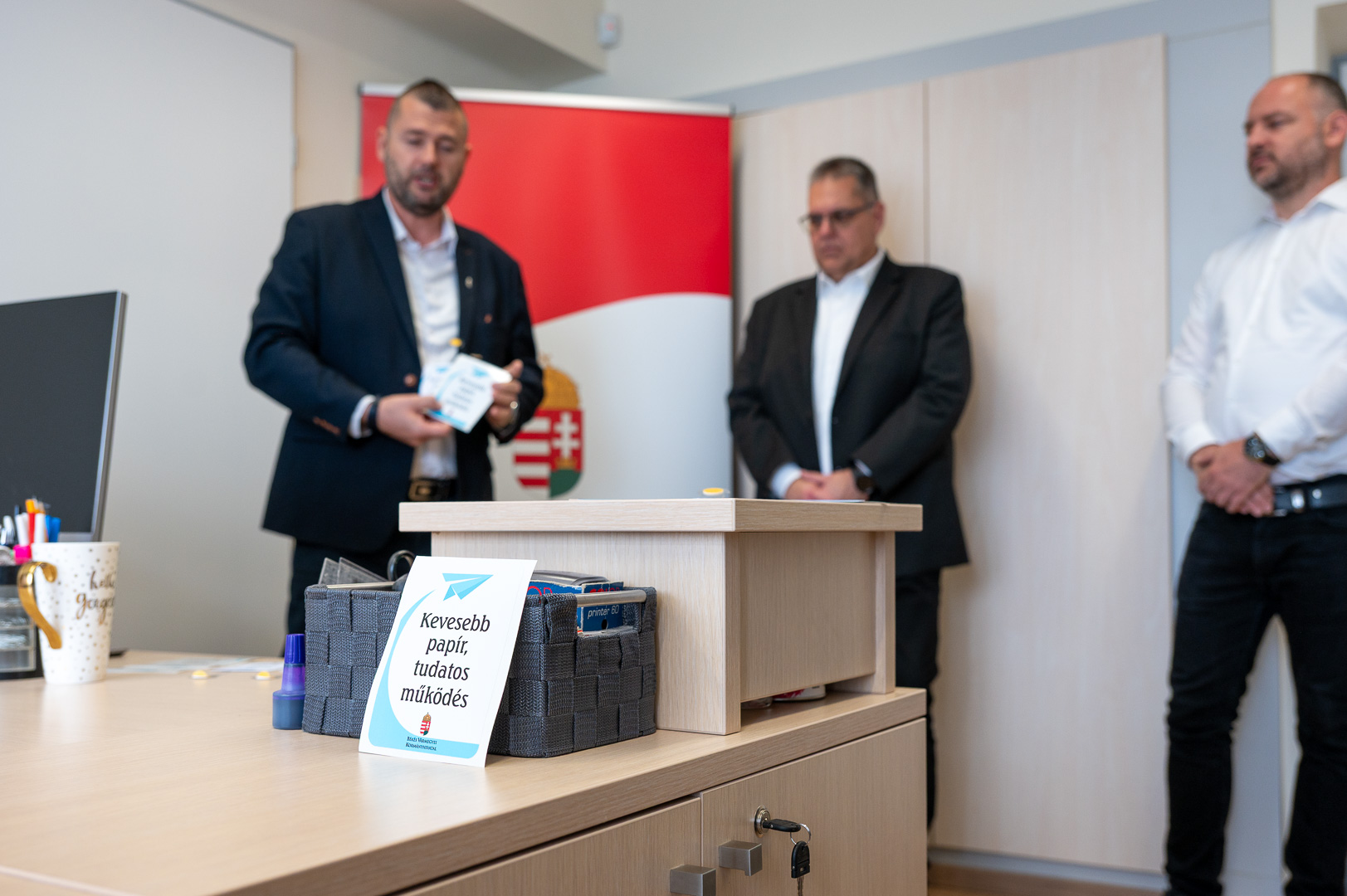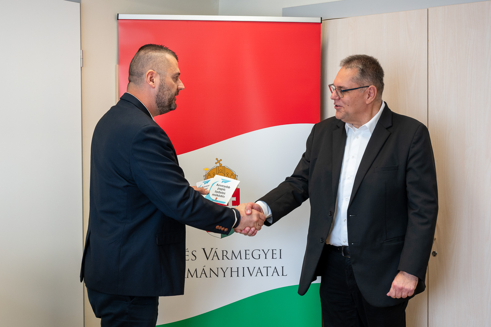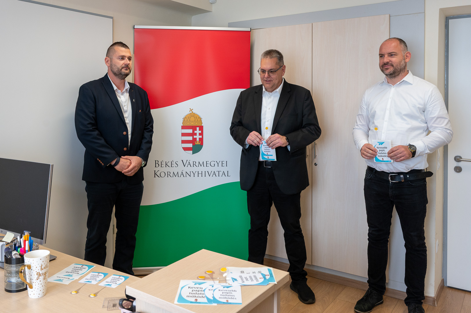A Békés Vármegyei Kormányhivatalban éves szinten nagyjából 1,3 millió ügyfél fordul meg, 1 millió hatósági döntést hoznak a 19 főosztályon, a 9 járási hivatalban, a 18 kormányablakban és az egyéb ügyintézési pontokon. A hatékony, pontos és ügyfélközpontú munkavégzés mellett kiemelt cél a fenntarthatóság is, különös tekintettel a papírfelhasználás csökkentésére. Az elektronikus ügyintézést támogató munkacsoport és az auditáló bizottság is azért dolgozik, hogy a több mint 3000 ügyintézési típusban minél kevesebb papírt használjanak fel, ezzel is védve a környezetet és növelve a költséghatékonyságot, hangzott el ma délelőtt a Szarvasi Járási Hivatal Hatósági és Gyámügyi Osztályán, amikor dr. Rákóczi Attila, a Békés Vármegyei Kormányhivatal főigazgatója a Papírtakarékos iroda program második állomásán átadta az erről szóló tanúsítványt Gaál Roland hivatalvezetőnek, illetve helyettesének, dr. Galó Zsoltnak.