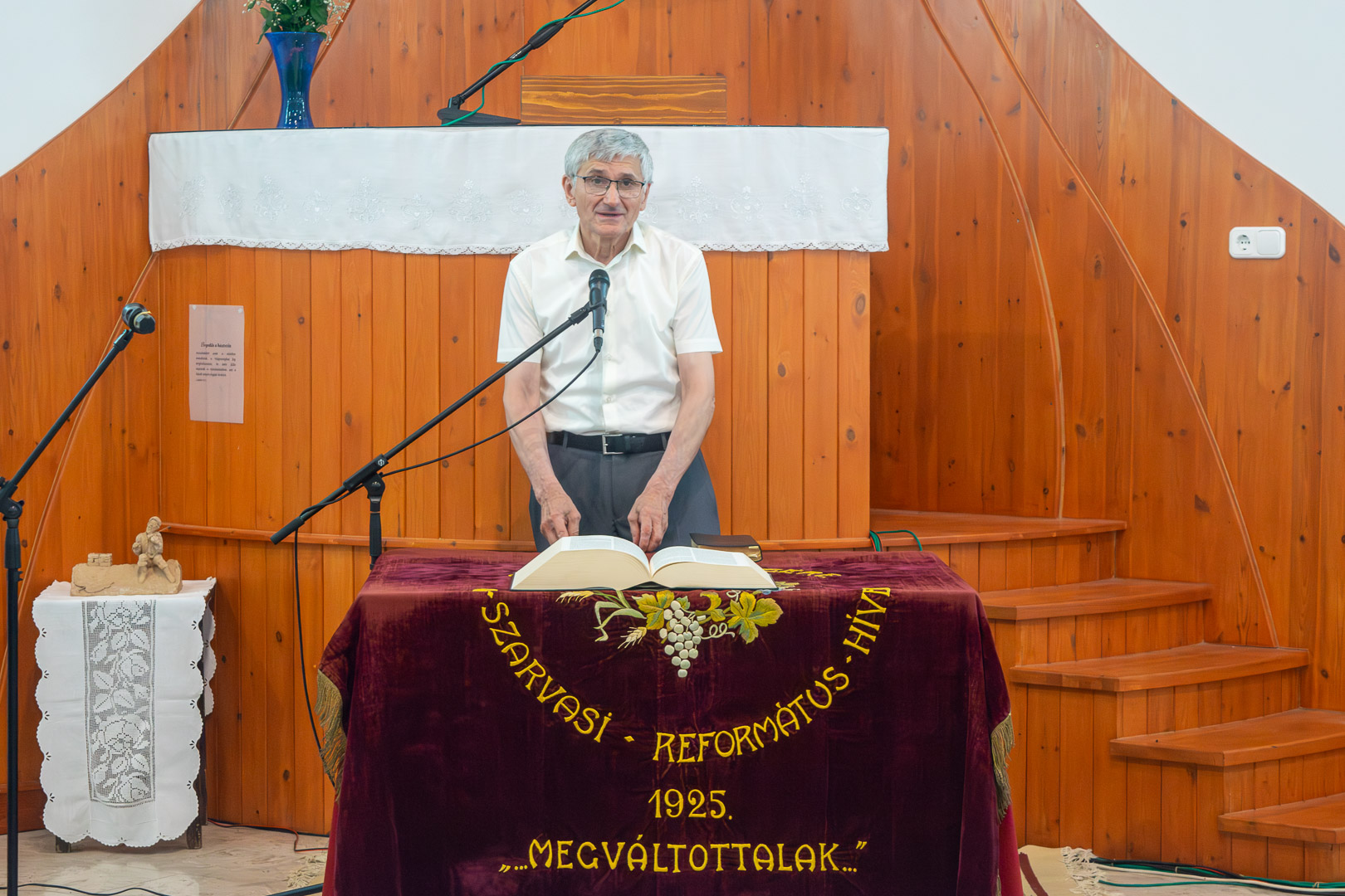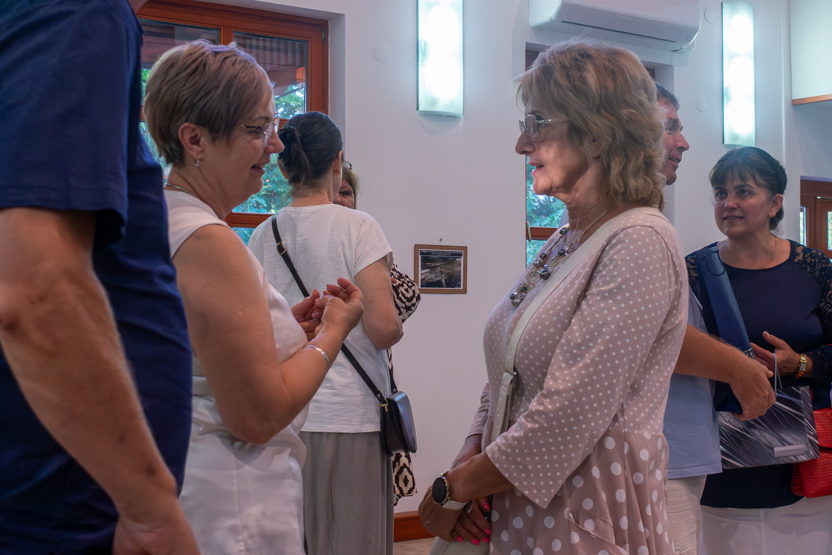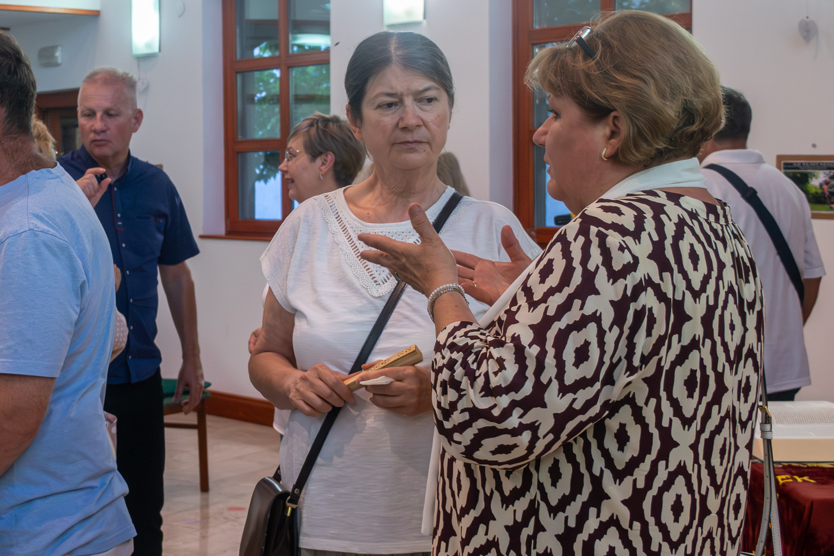 Mielőtt az udvaron megterített asztaloknál megkezdődött a baráti beszélgetés, Pentaller Attila elmondta, hogy a kiállítás július végéig, hétköznapokon 16–18 óra között tekinthető meg a szarvasi református templomban.