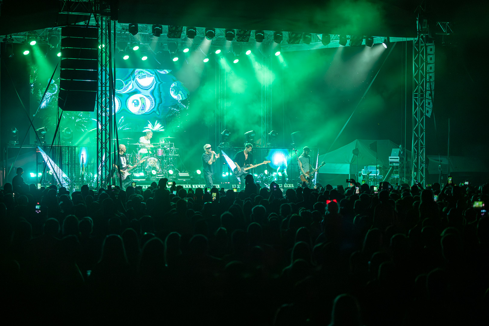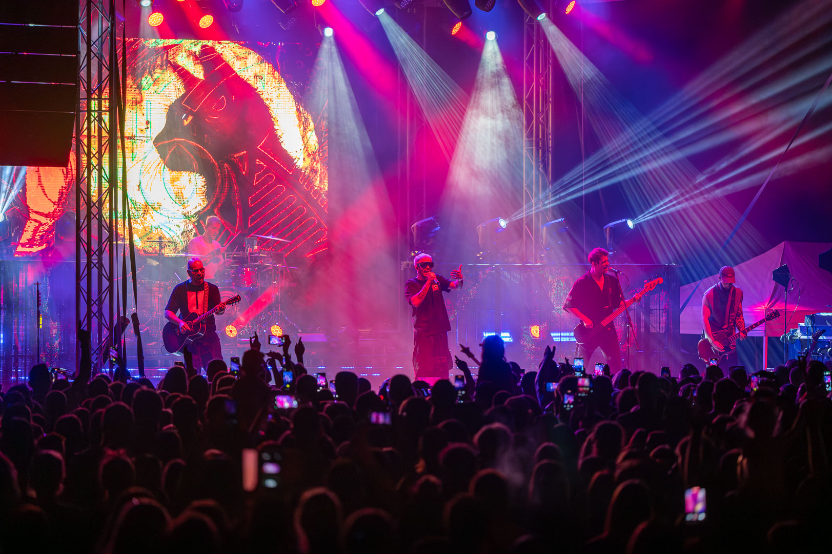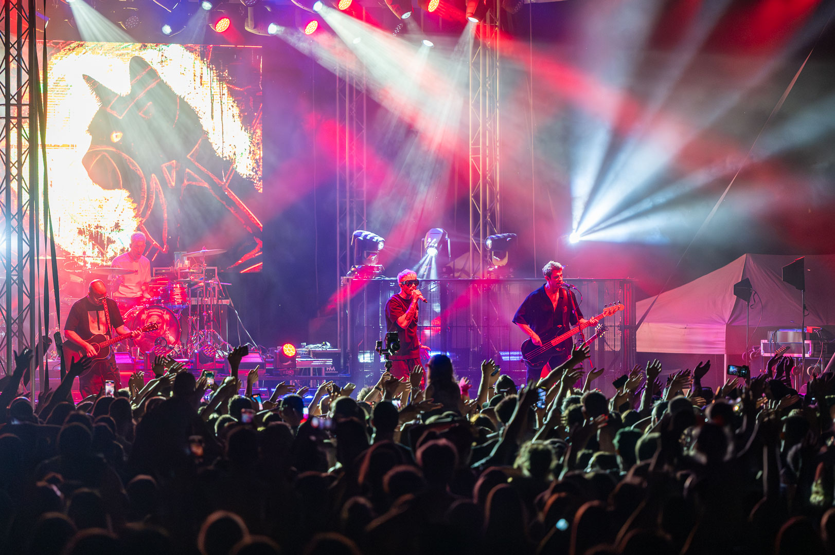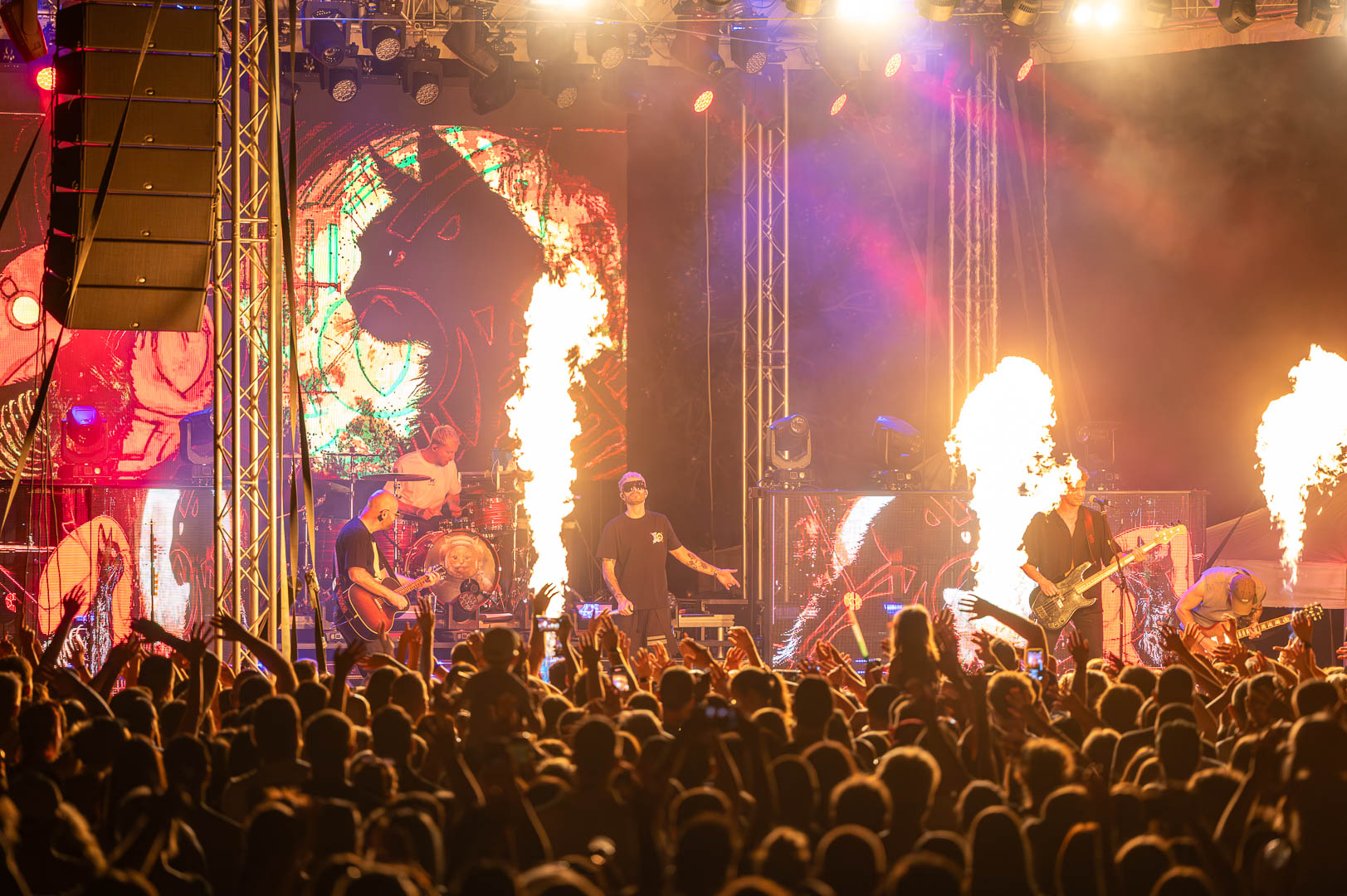 ByeAlex nem is hagyta cserben a kedvéért a faluba érkező közönséget, megénekeltette, megtornáztatta őket a mai könnyűzenei koncertek elmaradhatatlan látványelemei, a macska fadíszek előtt.