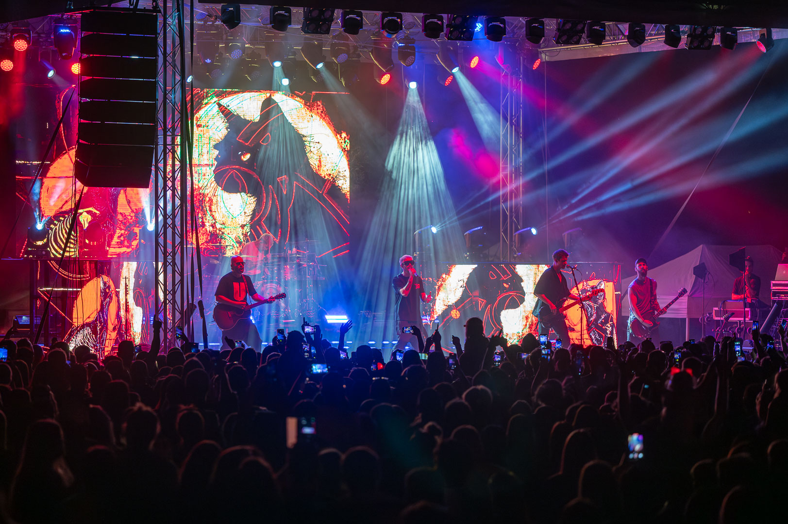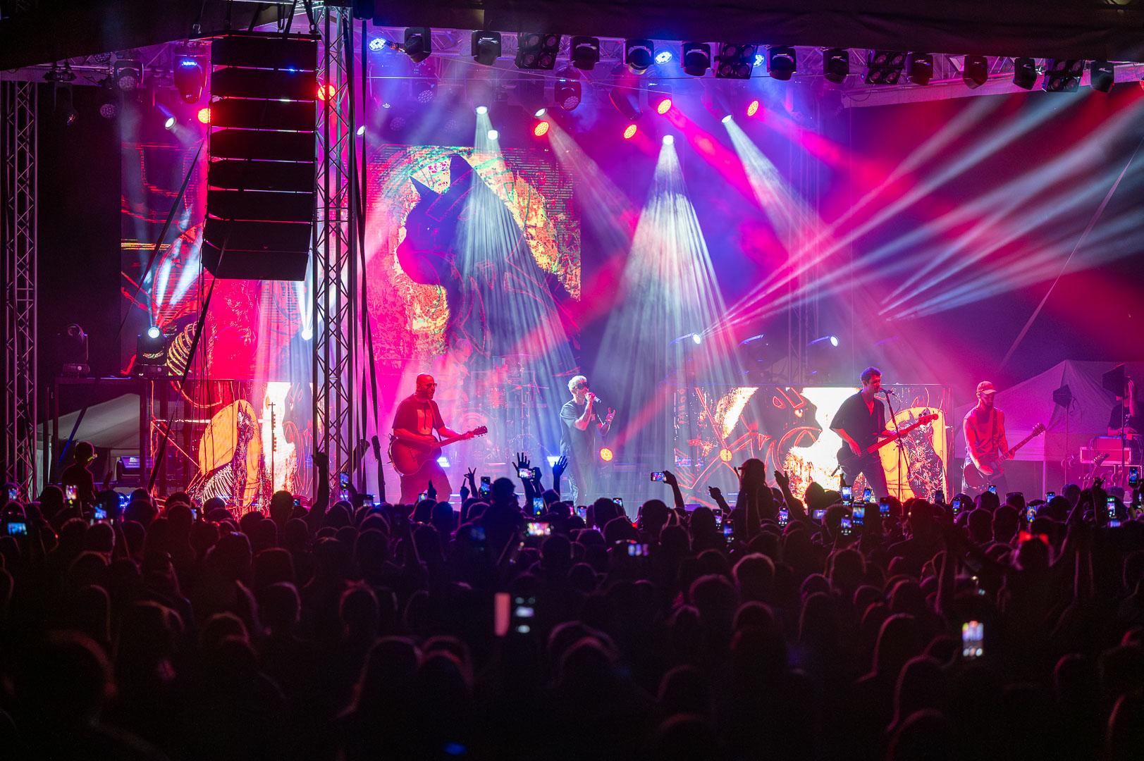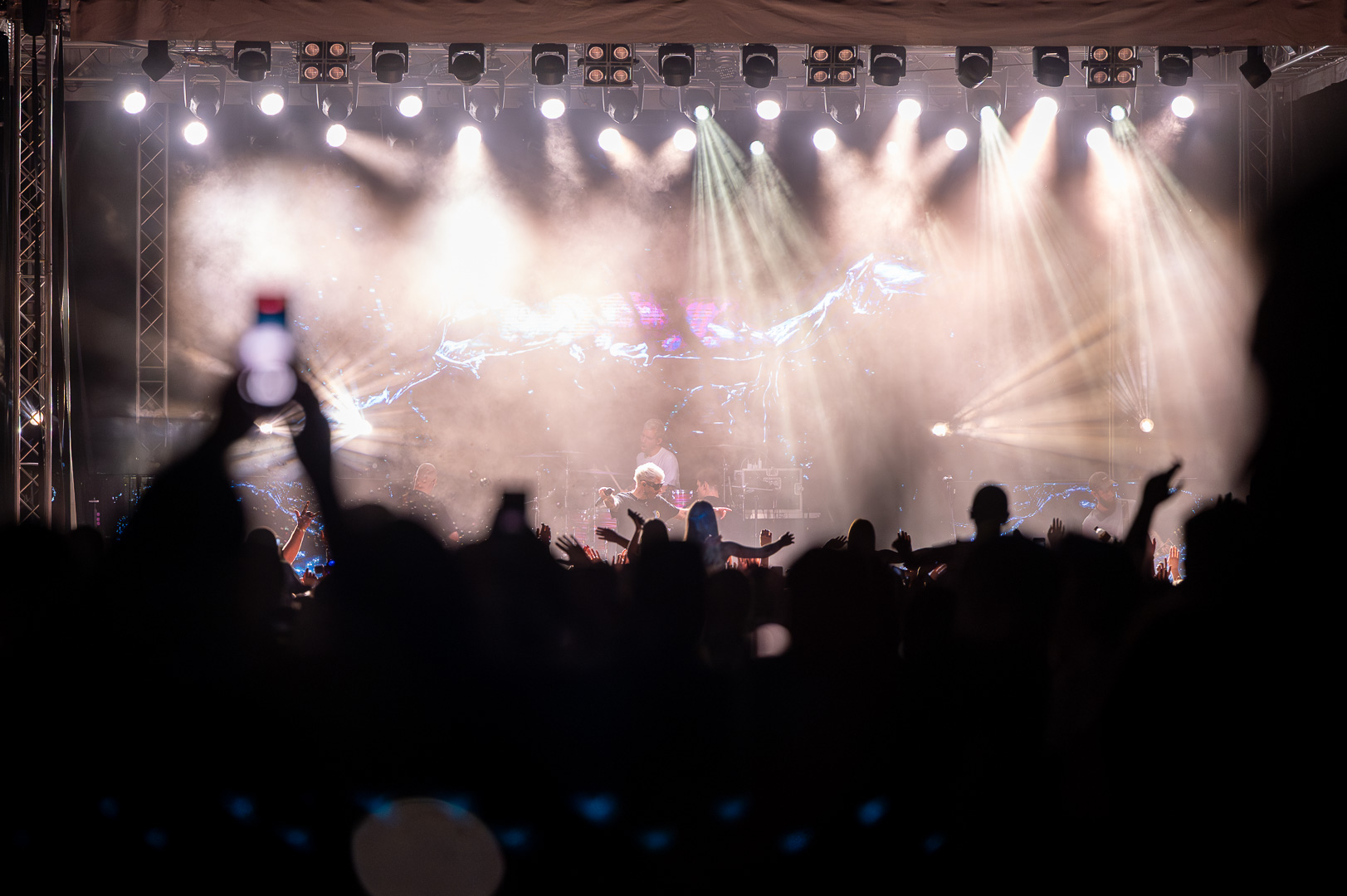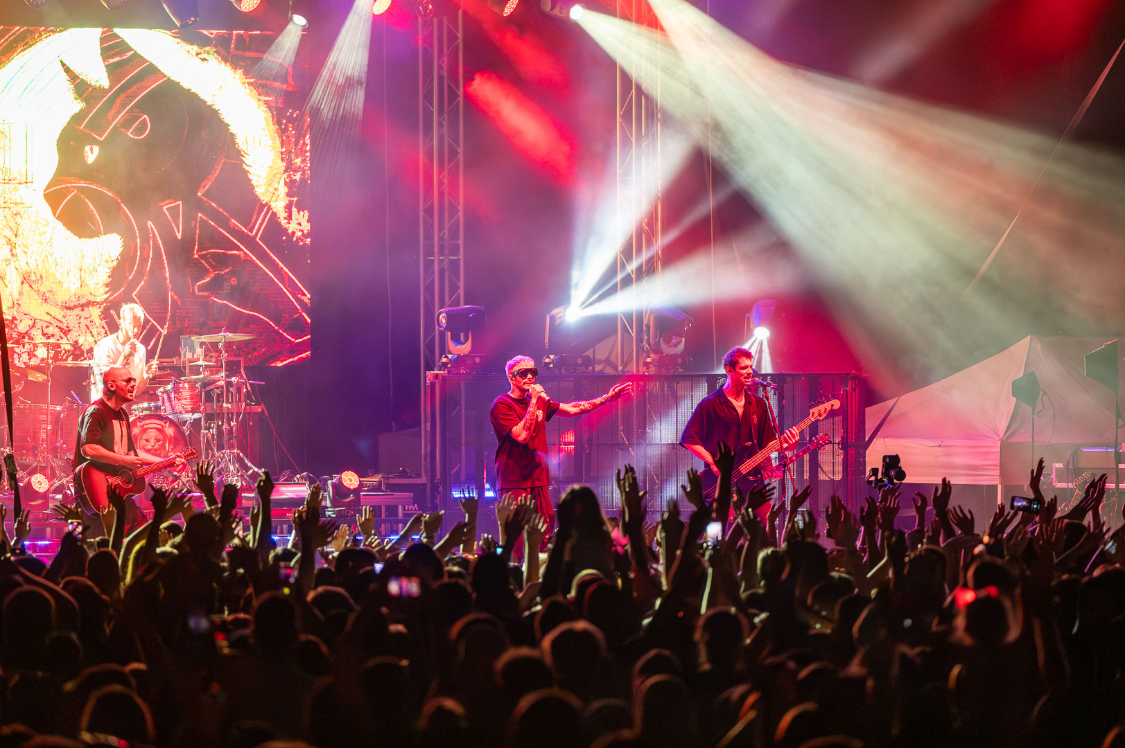 ByeAlex nem is hagyta cserben a kedvéért a faluba érkező közönséget, megénekeltette, megtornáztatta őket a mai könnyűzenei koncertek elmaradhatatlan látványelemei, a macska fadíszek előtt.