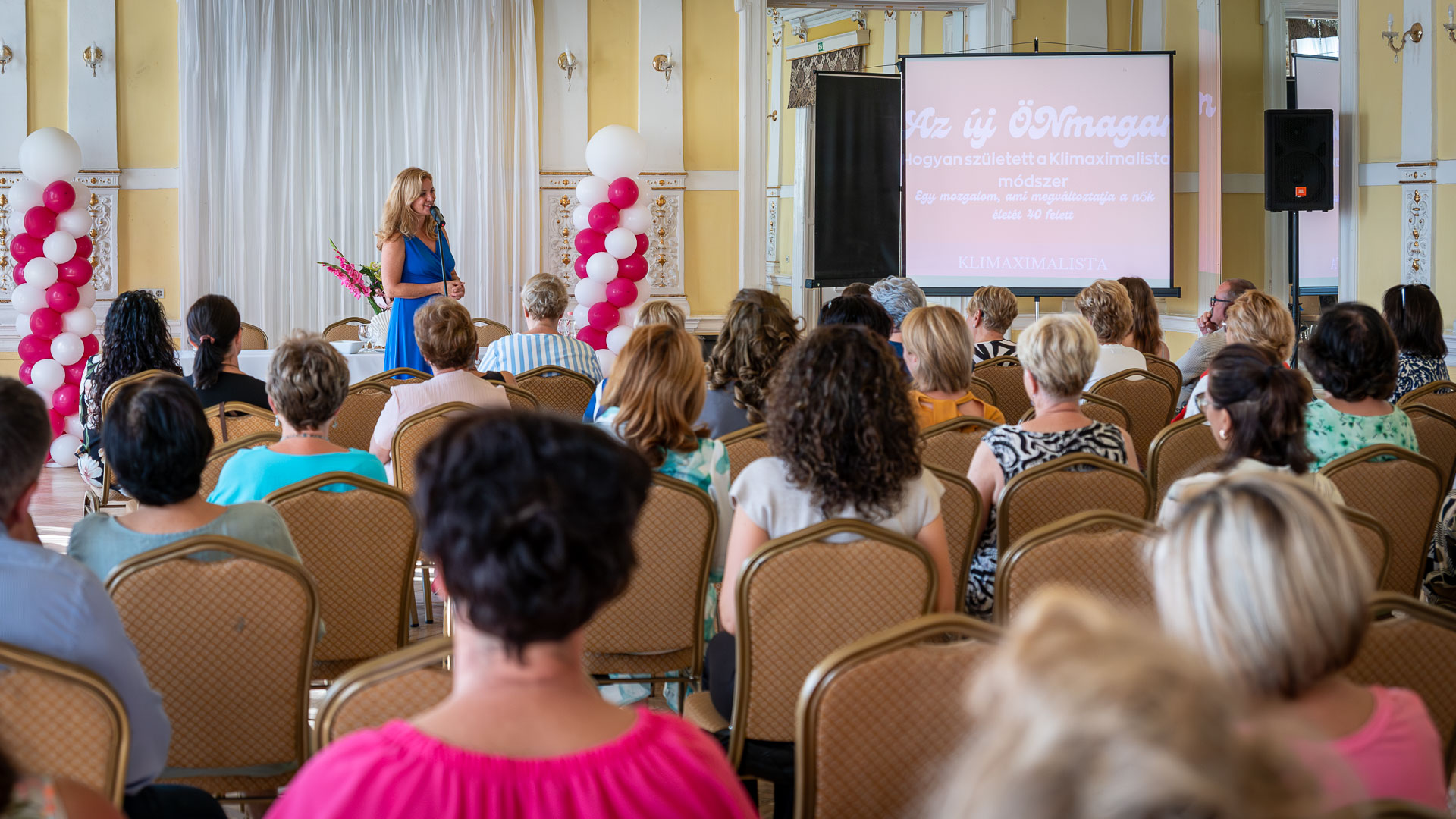 Elsőként ő lépett mikrofonhoz, hogy bemutassa Klimaximalista módszerét, amelyet saját tapasztalatai alapján dolgozott ki a perimenopauza és menopauza nehézségeinek megélése után. Célja, hogy a 40–60 éves nők számára új testben, lélekben és mentális erőben mutassa meg, hogyan lehet a változókort nem teherként, hanem új lehetőségként megélni. A módszer 2025-re díjnyertes felnőttképzési tananyaggá vált. Kiemelte, hogy a nők nincsenek egyedül életük ezen kihívásos időszakában: tapasztalt szakemberek, coachok és közösségek segítik őket átlendülni a mélypontokon. Beszédének végén egy petíció támogatását kérte, amely a menopauza szűrésének TB-támogatásáért küzd Magyarországon, és amely már több mint 200 ezer aláírással halad előre.