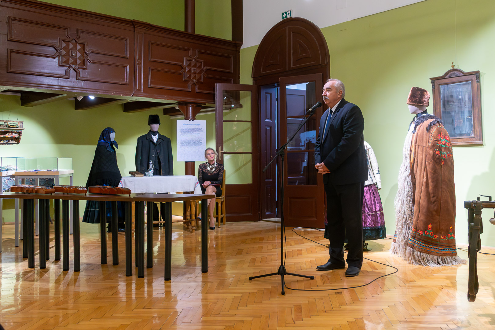 Csasztvanné Vass Edit – szintén citerával kísért – népdalcsokra után dr. Filus Erika beszélt a kiállítás értelméről és jelentőségéről, ami nem más, mint hogy a kiállított bábuk úgy néznek ki, mint az igazi emberek, ami nemegyszer megtréfálta őt a kiskőrösi tárlat alkalmával. Reményét fejezte ki, hogy a hajdani ruházat nem csak a múzeumba kerül vissza – bár az is nagyon fontos –, hanem az ünnepnapi/mindennapi használatba is népdalkörösök, néptáncosok, magángyűjtők jóvoltából. – Mutassuk meg, hogy ez egy élő kultúra! – szólította fel a közönséget Filus Erika.