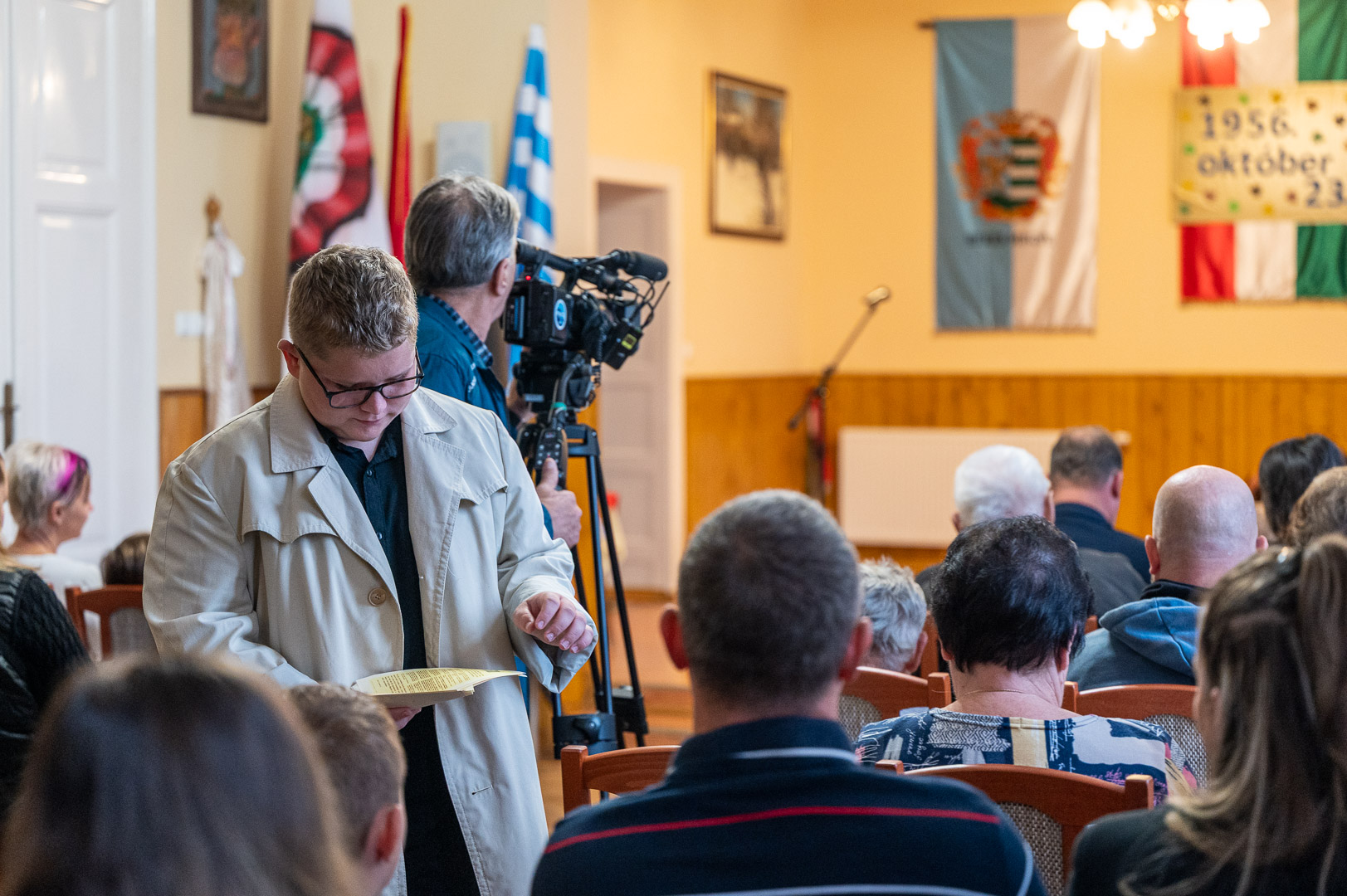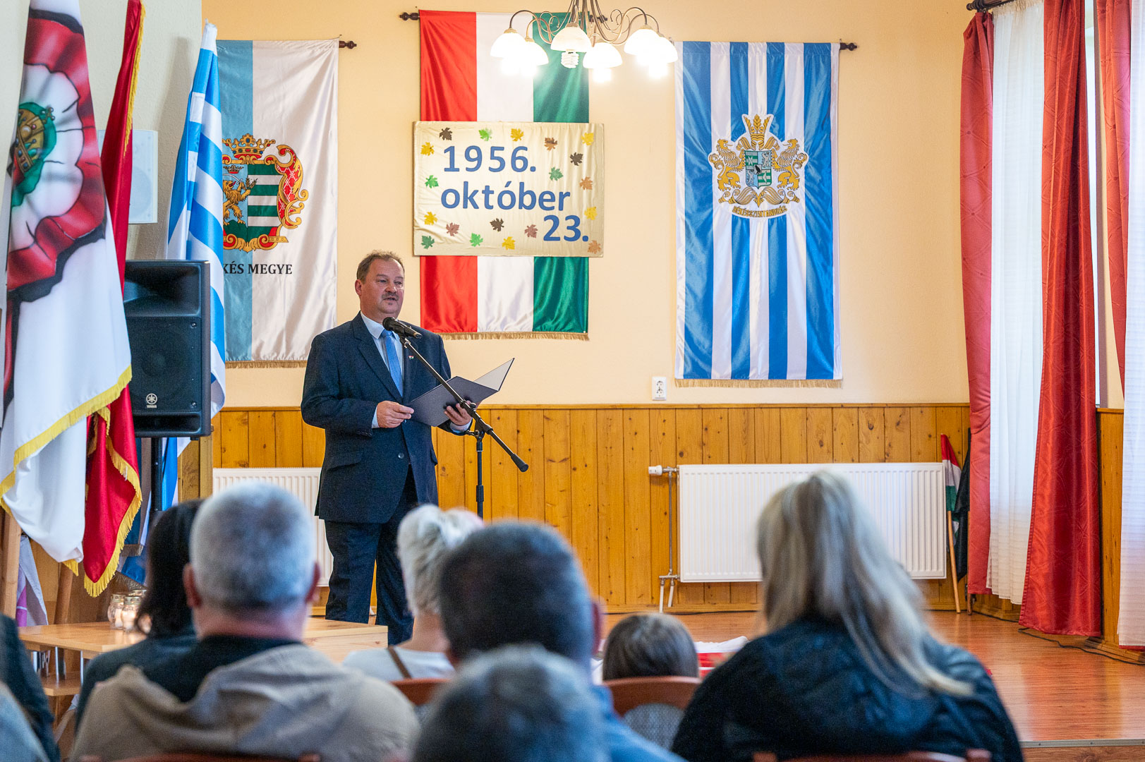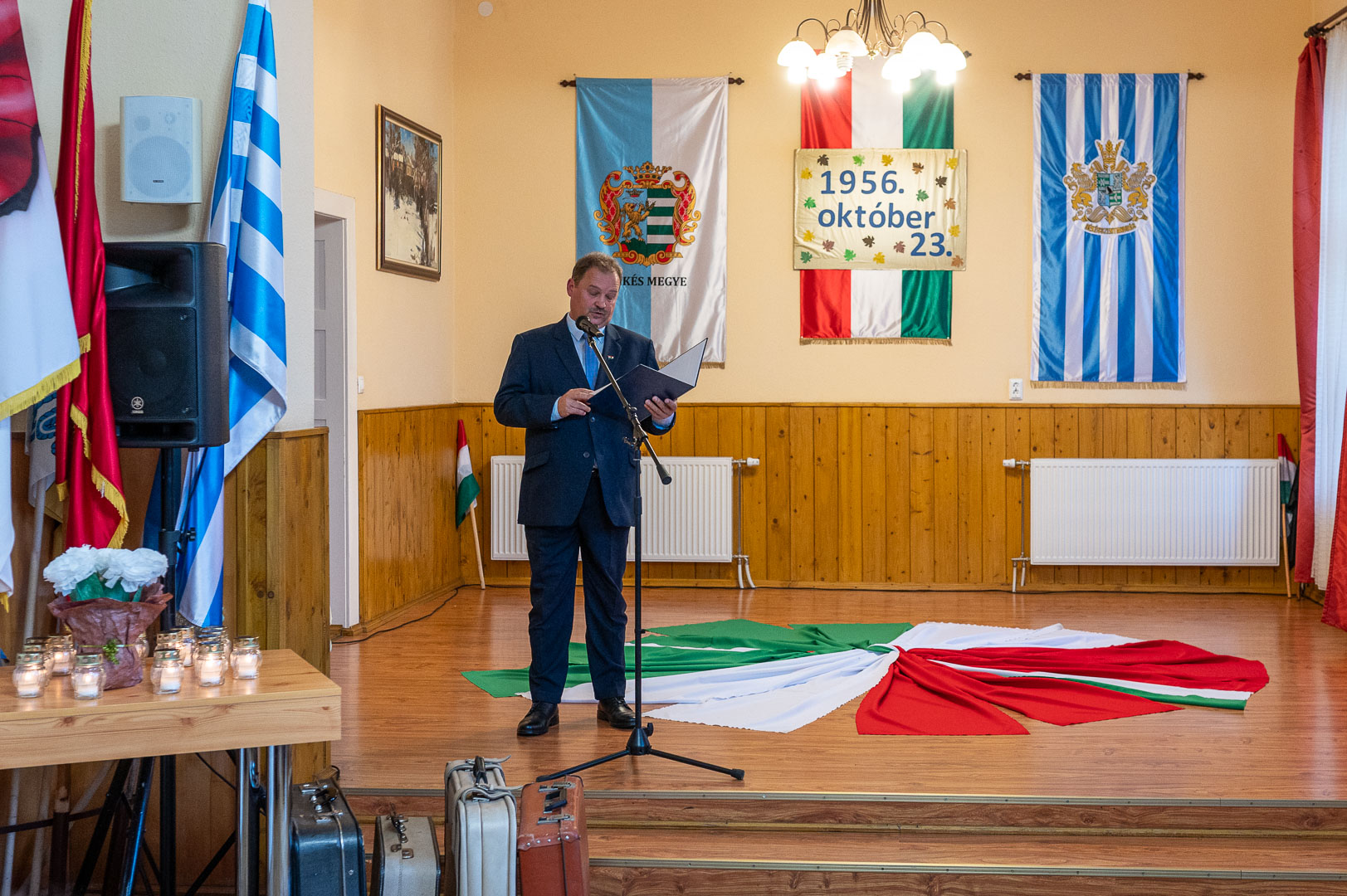 Őket a Békéssy János Helytörténeti és Hagyományőrző Egyesület elnöke, Hévizi Róbert követte, aki a hallgatóságot köszöntve hangsúlyozta, hogy az 1956-os forradalom nem véletlenül robbant ki: a sztálinista diktatúra elnyomása, a gazdasági nehézségek és a szabadságjogok hiánya már az ötvenes évek elejére elviselhetetlenné vált a magyar nép számára. Rákosi Mátyás uralma, a kollektivizálás és az irracionális iparosítás súlyos társadalmi feszültségeket okozott. Sztálin halála után Nagy Imre került a miniszterelnöki székbe, aki reformjaival – a személyi kultusz felszámolásával, a mezőgazdaság és lakásépítés fejlesztésével – reményt adott a nemzetnek. Az engedmények azonban belső ellentéteket szültek a kommunista párton belül, és végül a keményvonalas vezetés ismét hatalomra tört.