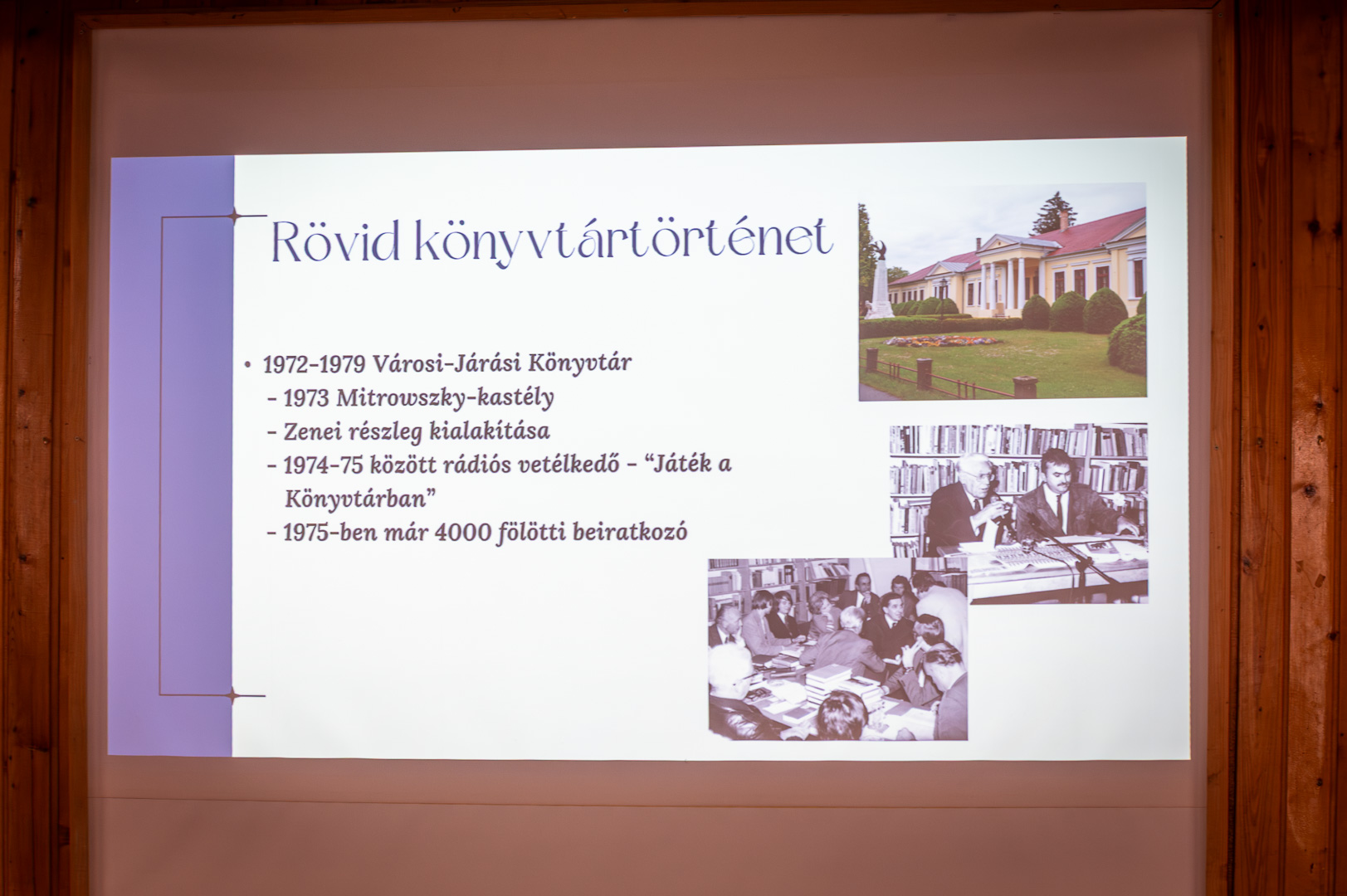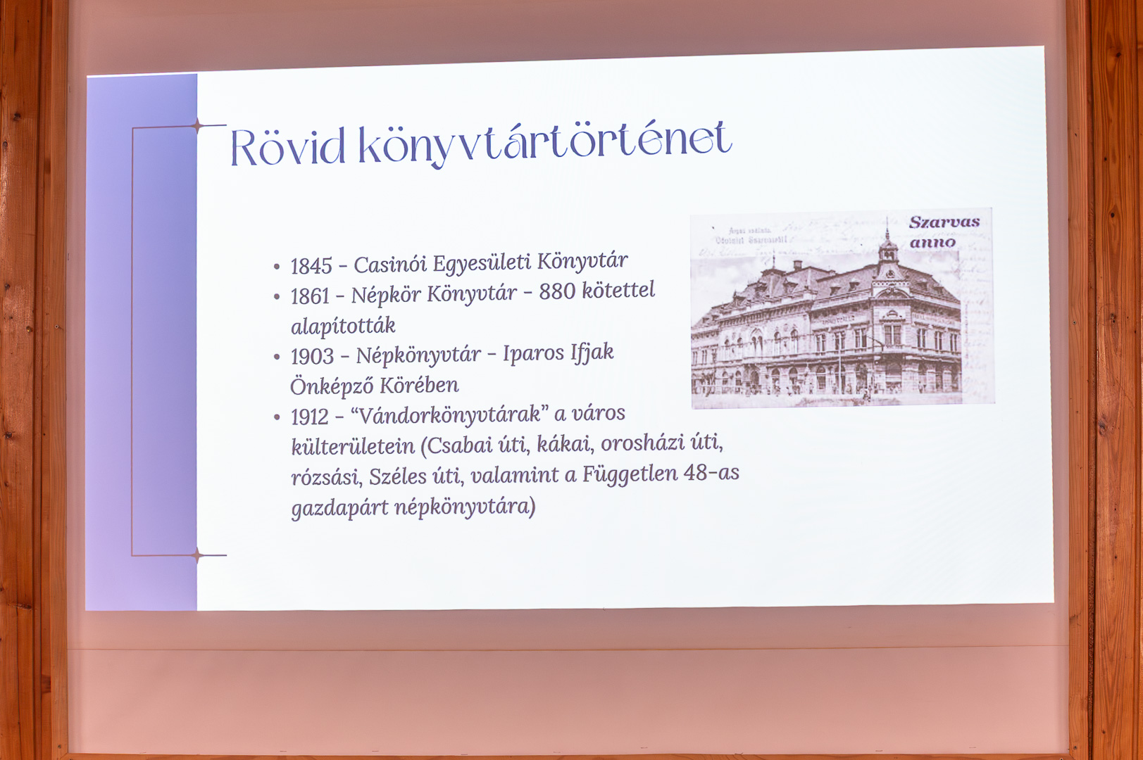A szakmai nap előadásainak sorát a házigazda könyvtárigazgató, Molnárné Pető Beáta nyitotta, 70 éve az olvasókért című prezentációjával. Ebből elsősorban kiderült, hogy Szarvason már 1845-ben volt a Casino Egyesületnek könyvtára, ők alapításukat az első tanácsi fenntartású népkönyvtár 1955. november 3-án megnyitott leltárkönyvében tett bejegyzésre vezetik vissza. Szó volt ezt követően a könyvtár különböző korszakairól, amikor sokszor változtak a körülmények, a feltételek, az igazgató személye, egy valami nem változott, hogy a könyvtárosok az olvasók kiszolgálását tartották mindig elsődleges feladatnak. Bemutatta a könyvtár szolgáltatásait, klubjait, állandó rendezvényeit és honlapját, a social médiában való jelenlétét. Végezetül a legutóbbi felújítási programról szólt, aminek következtében 2025. május 27-én nyitott ki ismét, megújult és modernizált Szarvasi Városi Könyvtár.