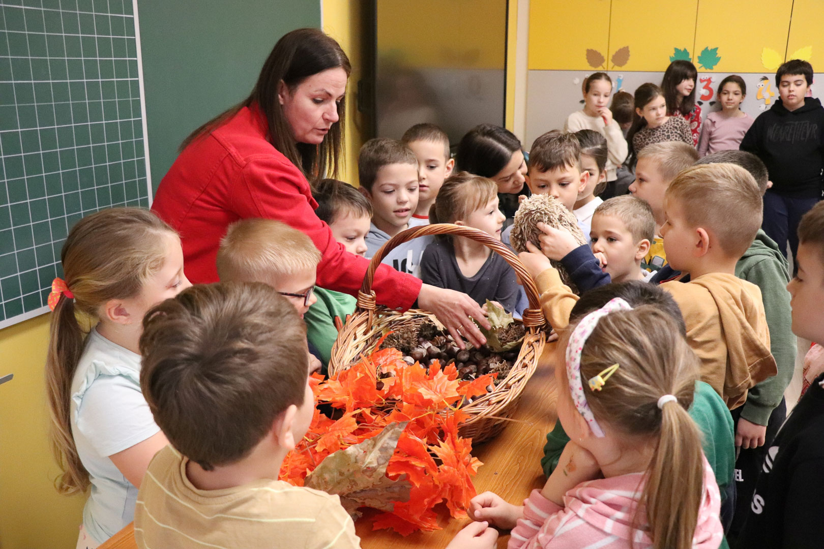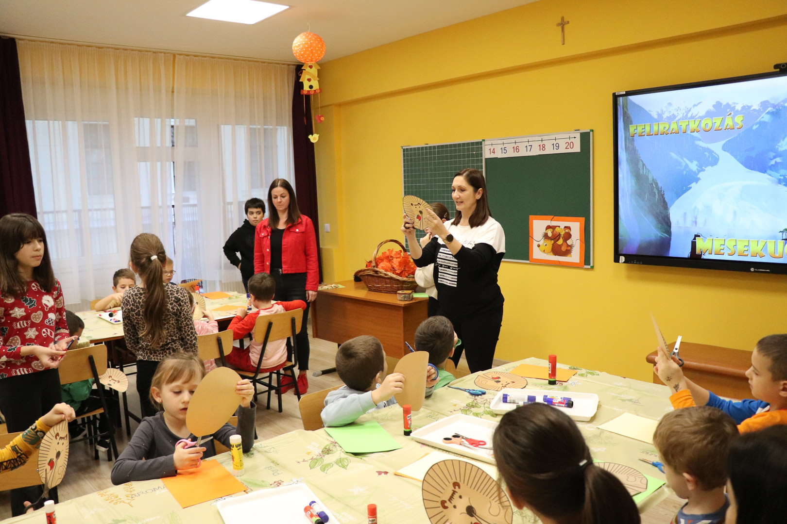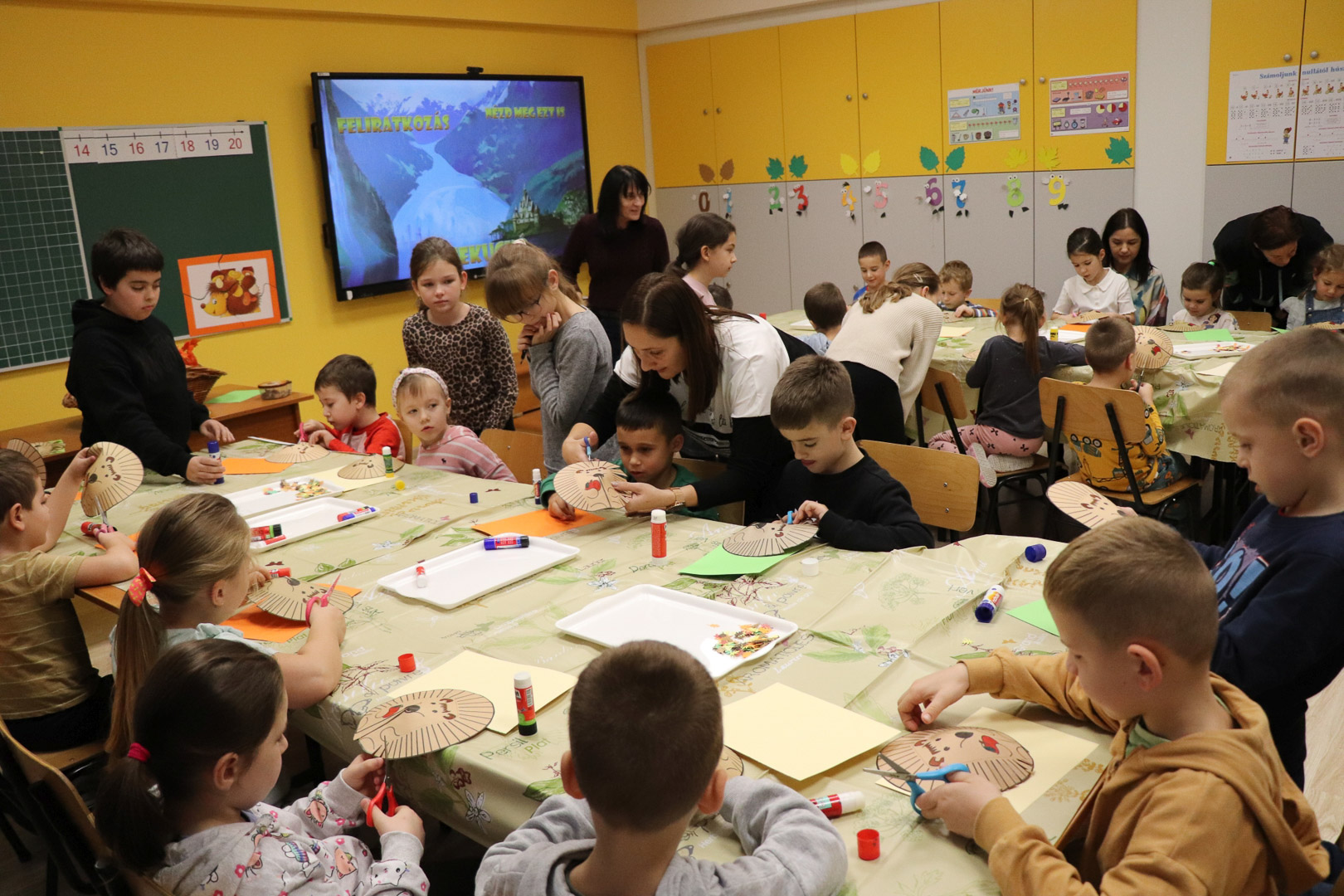 Már csak pár hét és vége lesz az ősznek. A természet most készül fel a hosszú, hideg télre. A színes, lehulló levelek és termések kupacaiban azonban megbújik valaki! November 18-án, idei első iskolára hangoló játszóházunkban a kíváncsi gyerekekkel közösen kutattuk, kerestük, hogy ki lehet az?!  A levelek, termések alatt meleget kereső kicsi állatot gyorsan megtaláltuk! Egy kis szúrós gombóc lapult a levelek alatt! Hosszú téli álma előtt még egy jó nagy kalandra indult velünk. Így rögtön megismerkedtünk vele is, és egymással is. Memóriajátékban a párját is megtaláltuk az interaktív táblán, majd pihenésképpen meghallgattuk Sün Balázs történetét. A mese után sok-sok ügyes kis kézre volt szükség, hiszen mindenki elkészíthette saját sünijét.