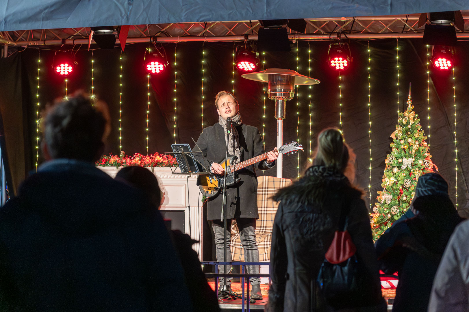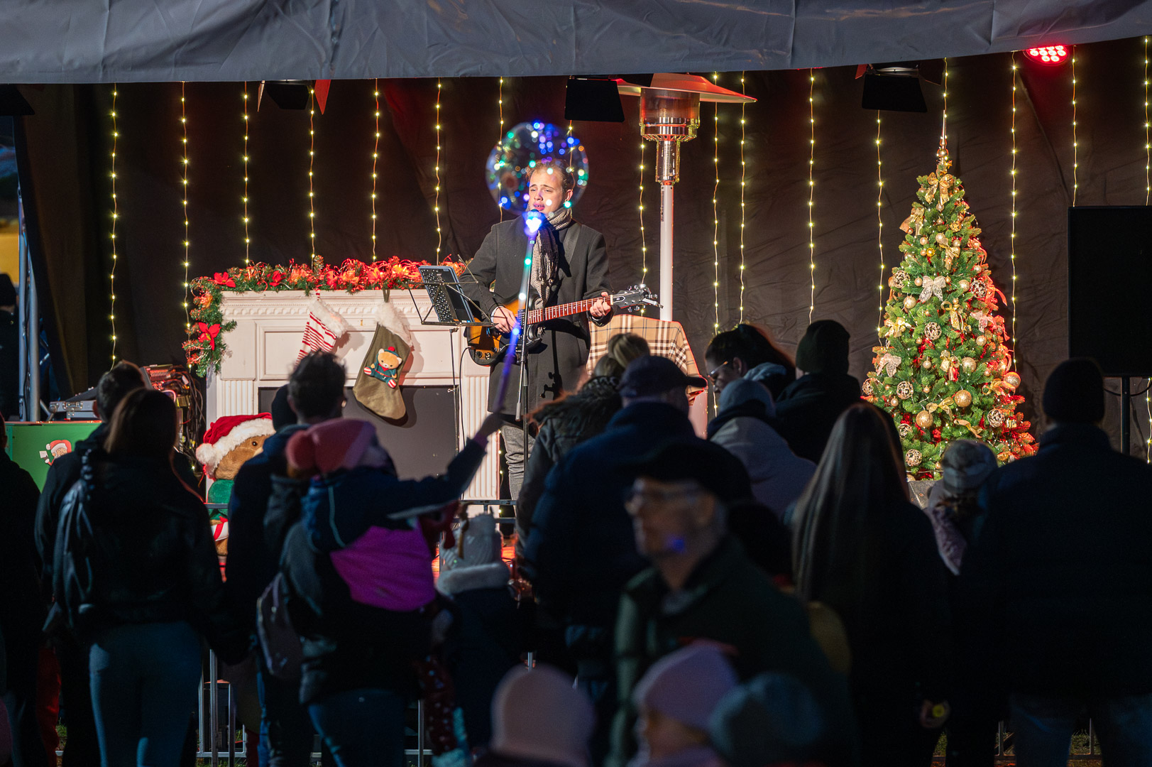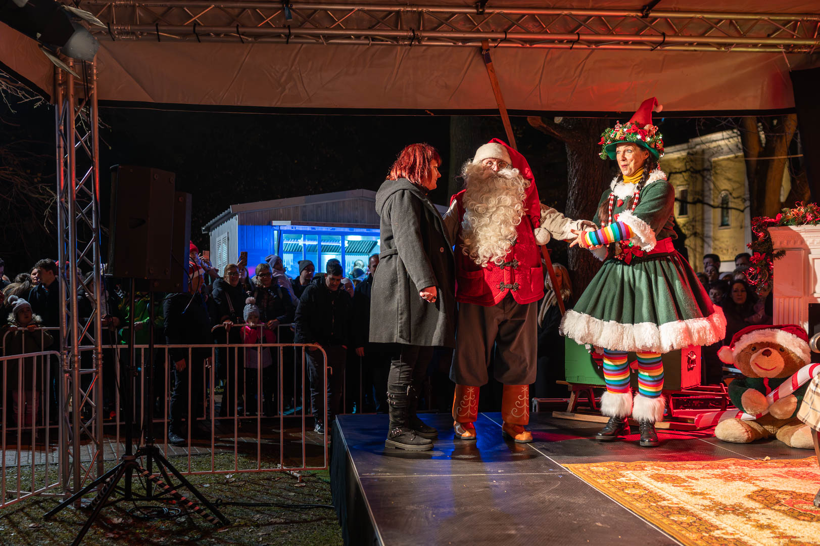 Onnan sétálva tette meg az utat a színpadig. Közben integetve üdvözölte a rá várókat, illetve a betlehemi jászolban a kis Jézust és családját.