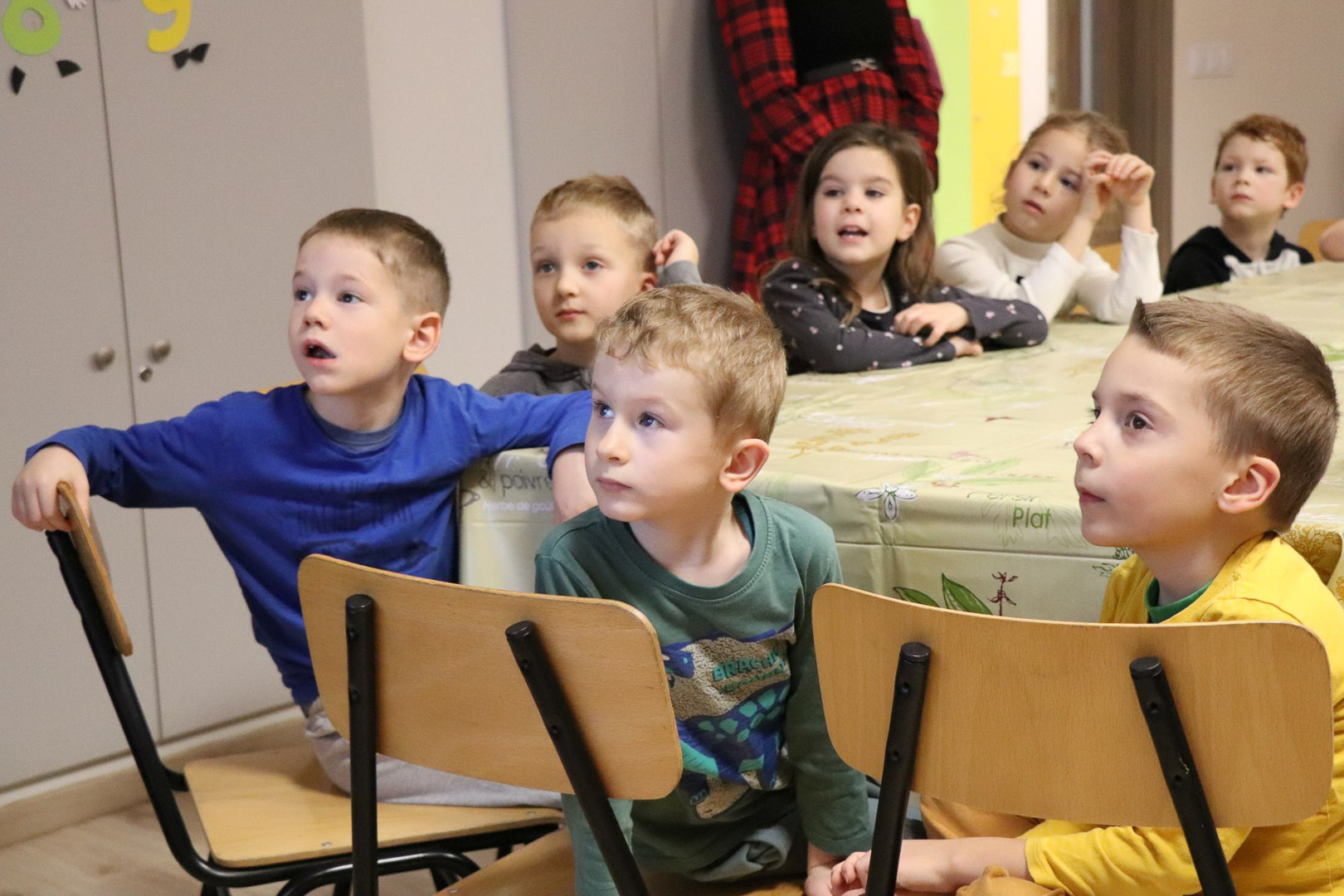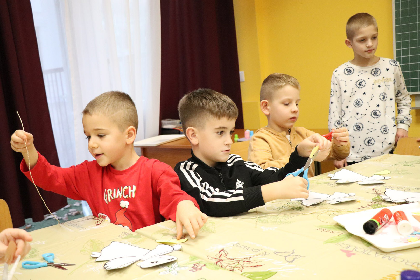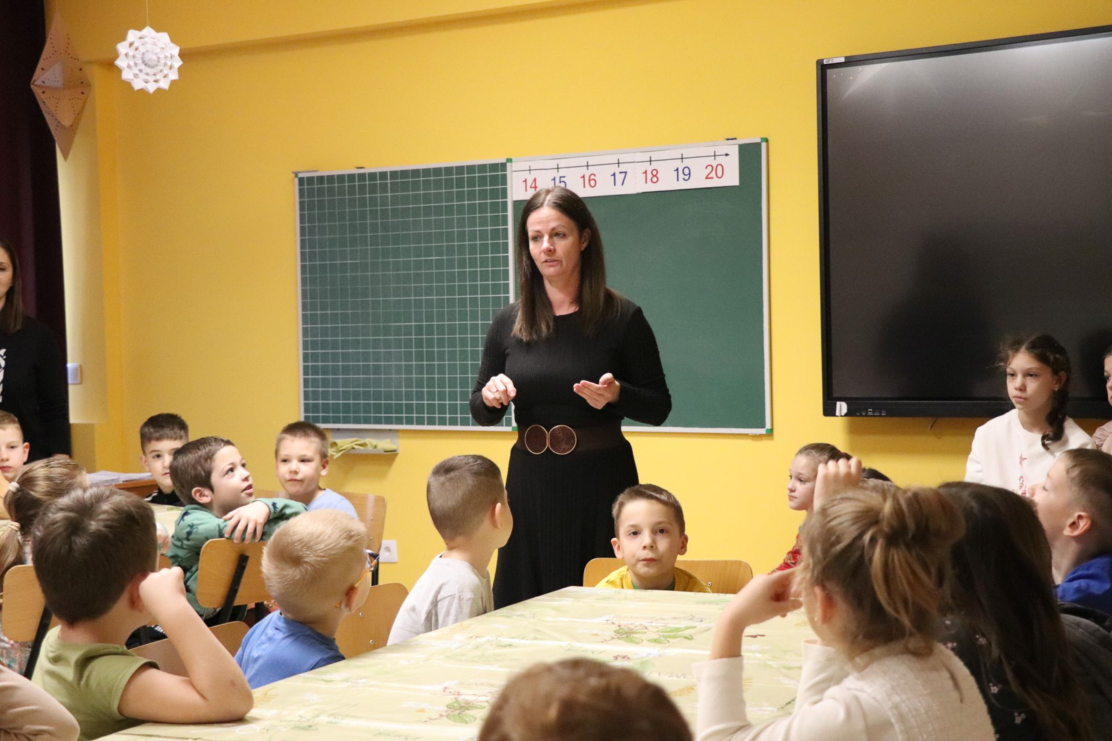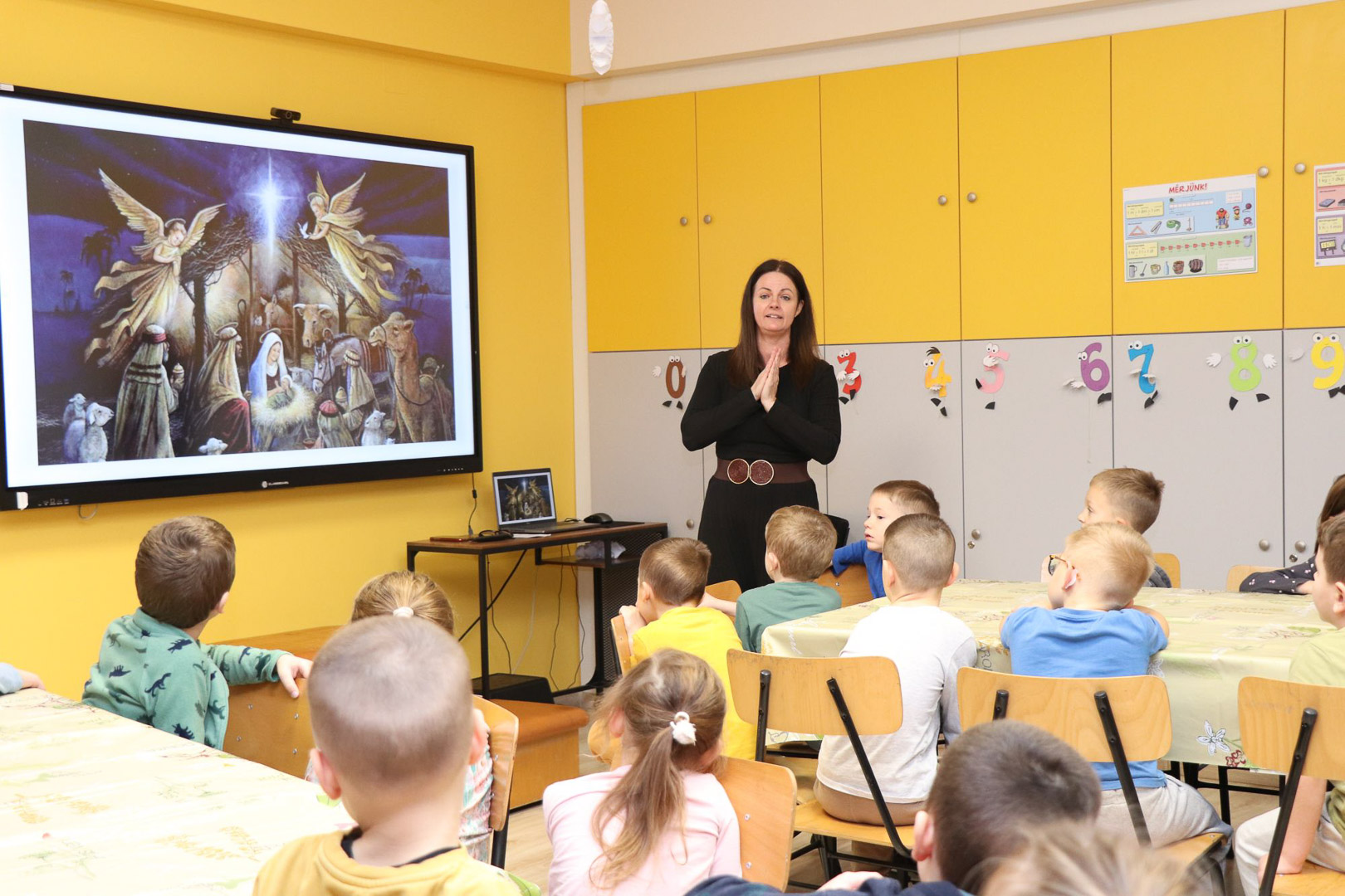 Hogy az idő gyorsabban teljen az angyalok érkezéséig, a modern technikát hívtuk segítségül: az interaktív táblán egy izgalmas képkereső játékkal hangolódtunk. Ám alighogy megtaláltuk a kis képkockák helyét, a távolból finom, csilingelő hangot hallottunk. A csengőszó egyre közeledett, míg végül… négy angyal lépett közénk!