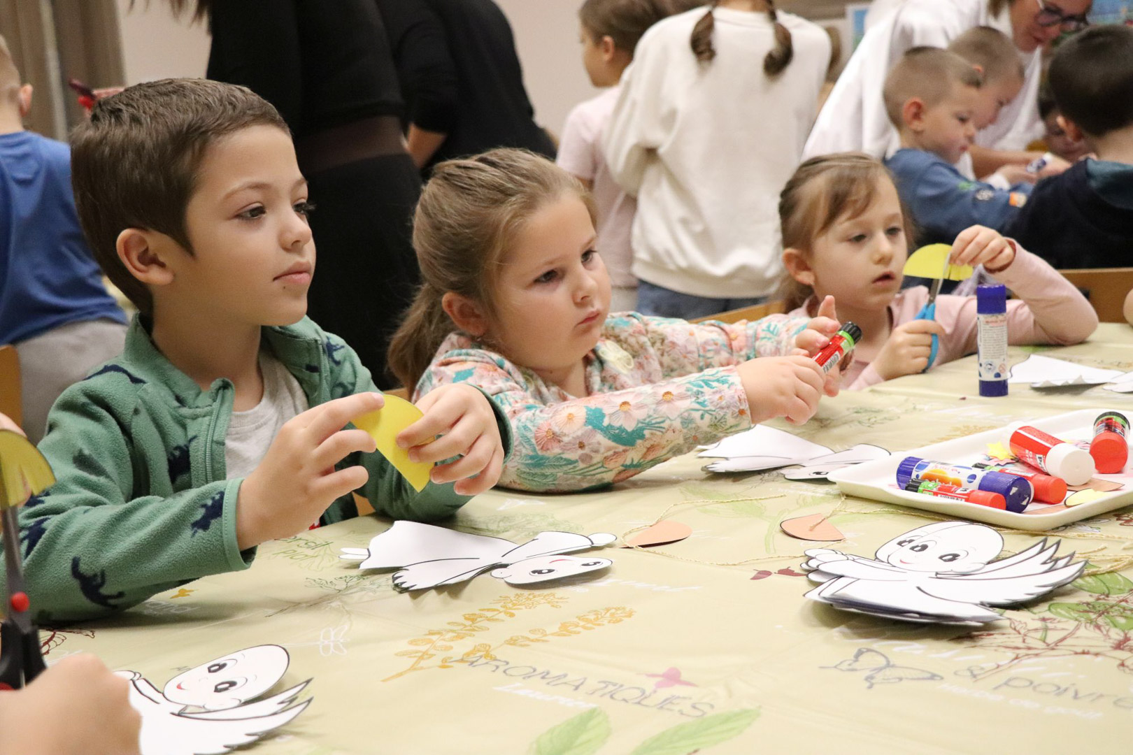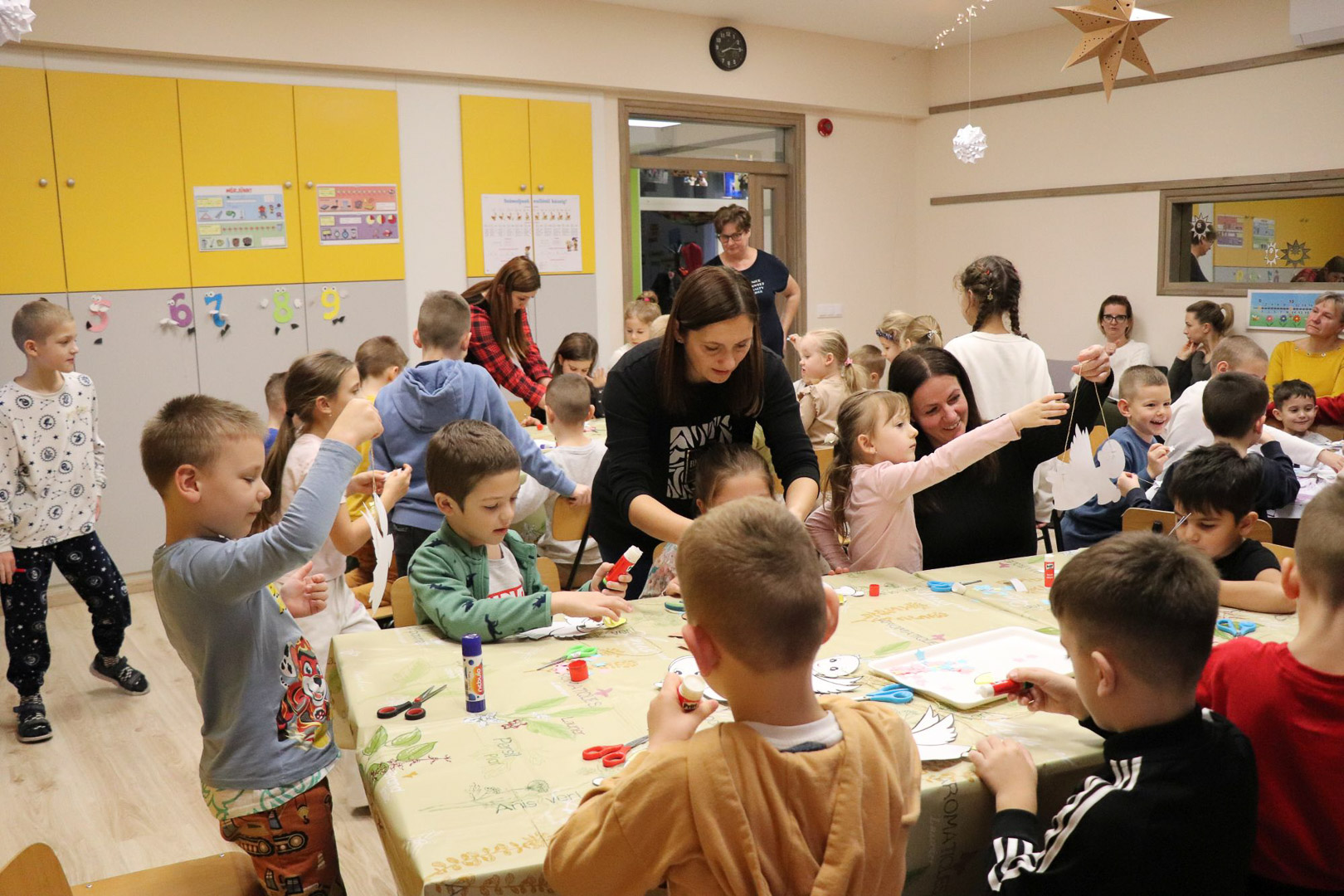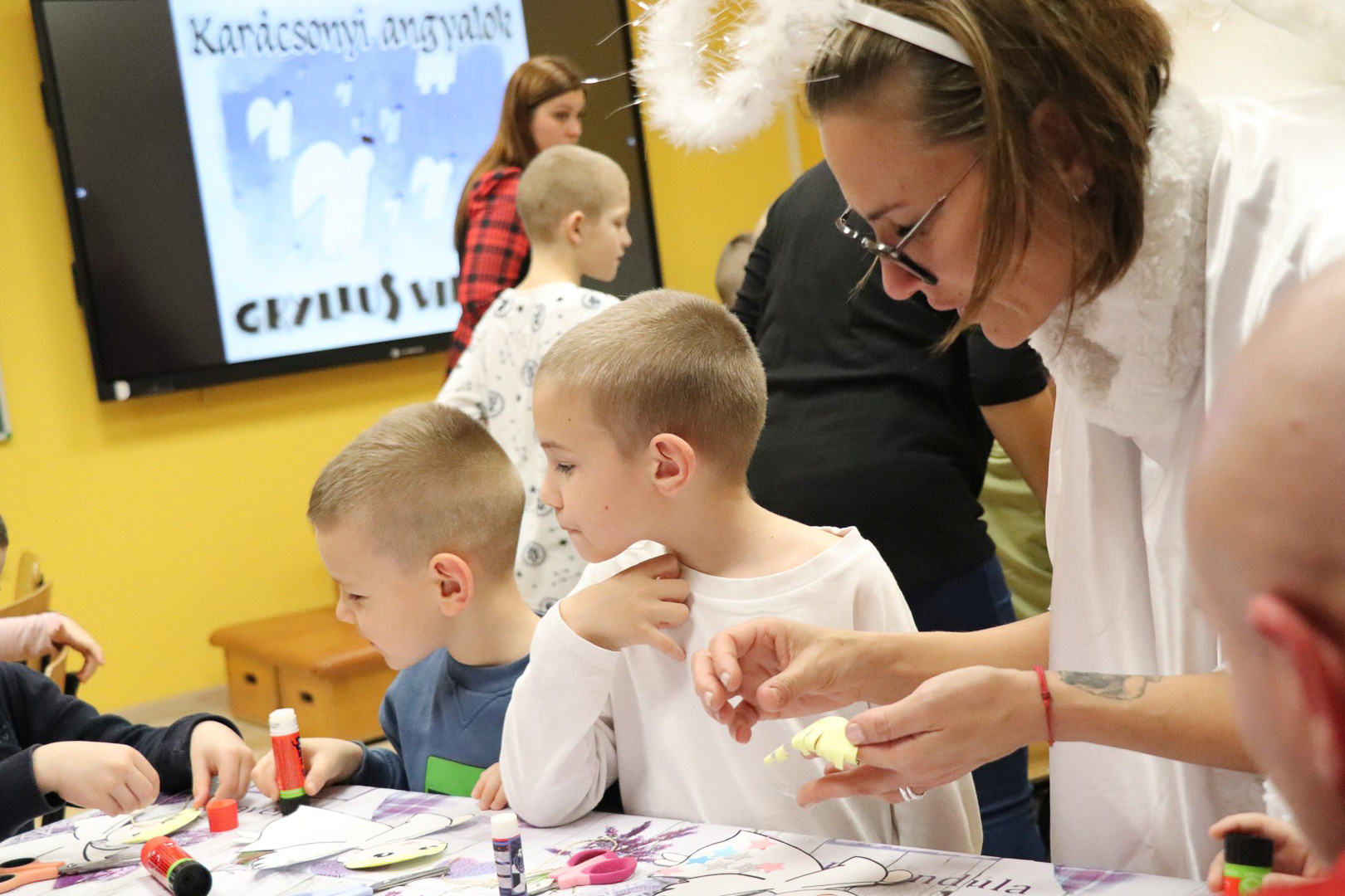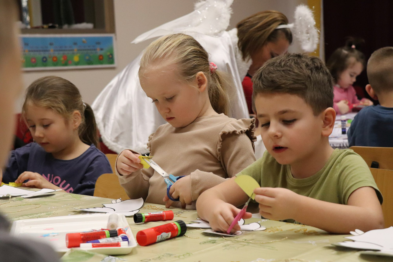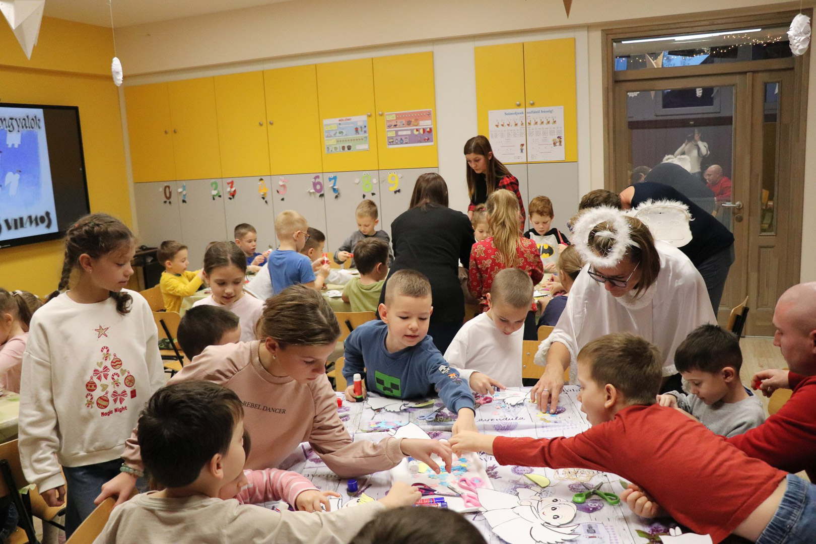 A karácsonyi angyalok énekkel is megajándékoztak bennünket, majd a varázslat alkotássá szelídült: minden pici óvodás kéz aprólékos munkával elkészítette saját kis papírangyalkáját. A játszóház végére így sok-sok kis angyal „repült” vissza a gyerekekkel a csoportszobákba, hírül víve az ünnep közeledtét.