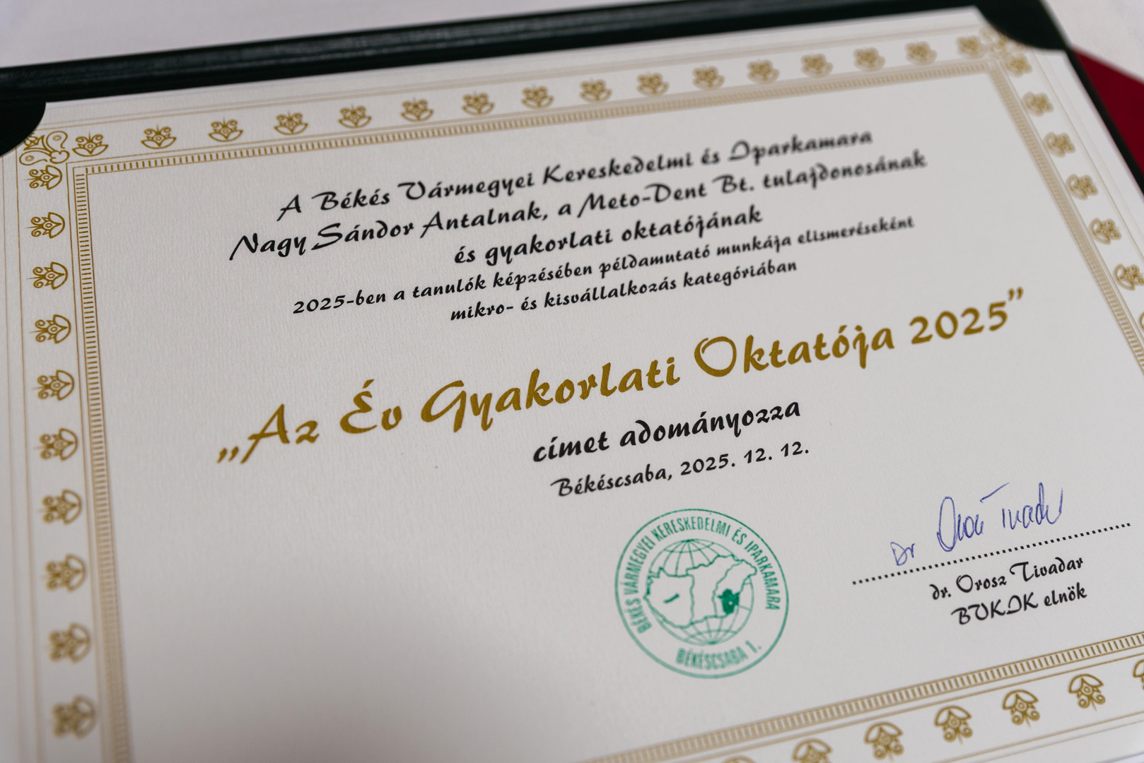A Békés Vármegyei Kereskedelmi és Iparkamara 2025. december 12-én ünnepélyes keretek között adta át a „Kiváló Duális Képzőhely 2025” és az „Év Gyakorlati Oktatója 2025” díjakat a Rokka Rendezvényházban. A díjátadó célja idén is az volt, hogy elismerje azokat a vállalkozásokat, szervezeteket és oktatókat, akik kiemelkedő munkájukkal hozzájárulnak a térség szakmai utánpótlásának biztosításához, a képzés színvonalának emeléséhez és a duális rendszer folyamatos erősítéséhez.