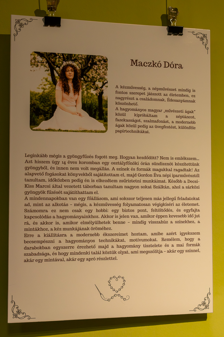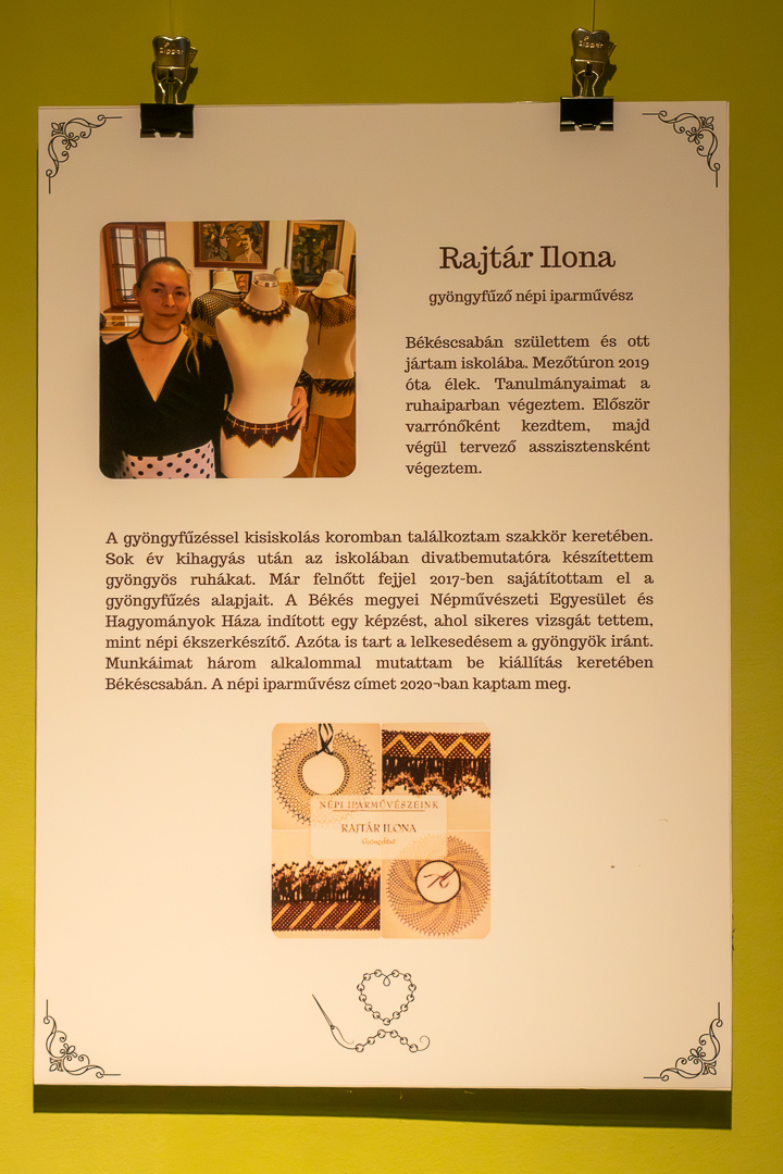 Örömének adott hangot Szarka József igazgató a Tessedik Sámuel Múzeum legutóbbi kiállításmegnyitóján – január 10-én, szombaton –, miért nem látja a kiállítás tárgyait, mert olyan sokan voltunk a teremben, hogy eltakartuk. Pedig érdemes volt megnézni, és meg is nézték aztán a látogatók Maczkó Dóra és Rajtár Ilona gyöngyből fűzött ékszereit. Üdvözölte a megnyitó vendégeit Farkas Tamás önkormányzati képviselő, aki a város önkormányzata és a kulturális bizottság nevében kívánt tartalmas időtöltést a látogatóknak. Kiemelte, hogy a kiállított tárgyak nem csupán használati eszközök, hanem műalkotások is, amelyek méltó helyet kaptak a múzeum falai között.