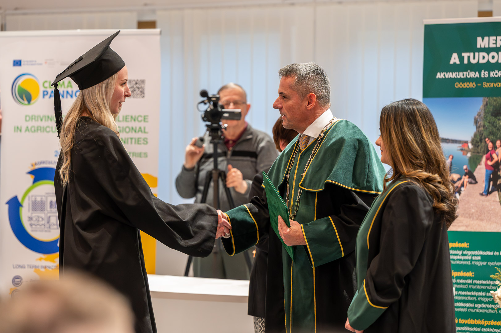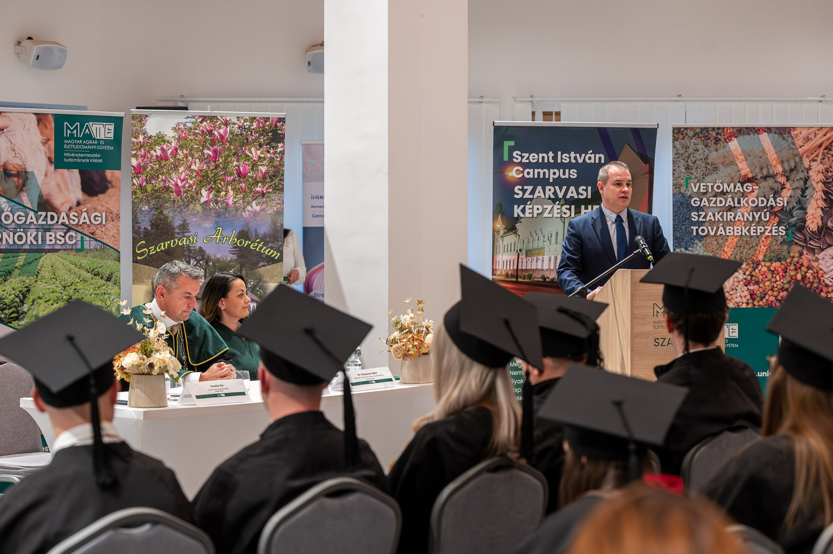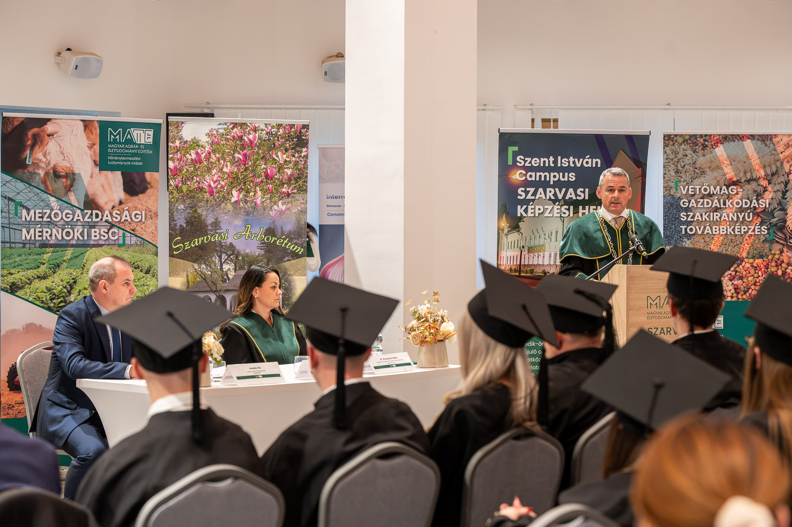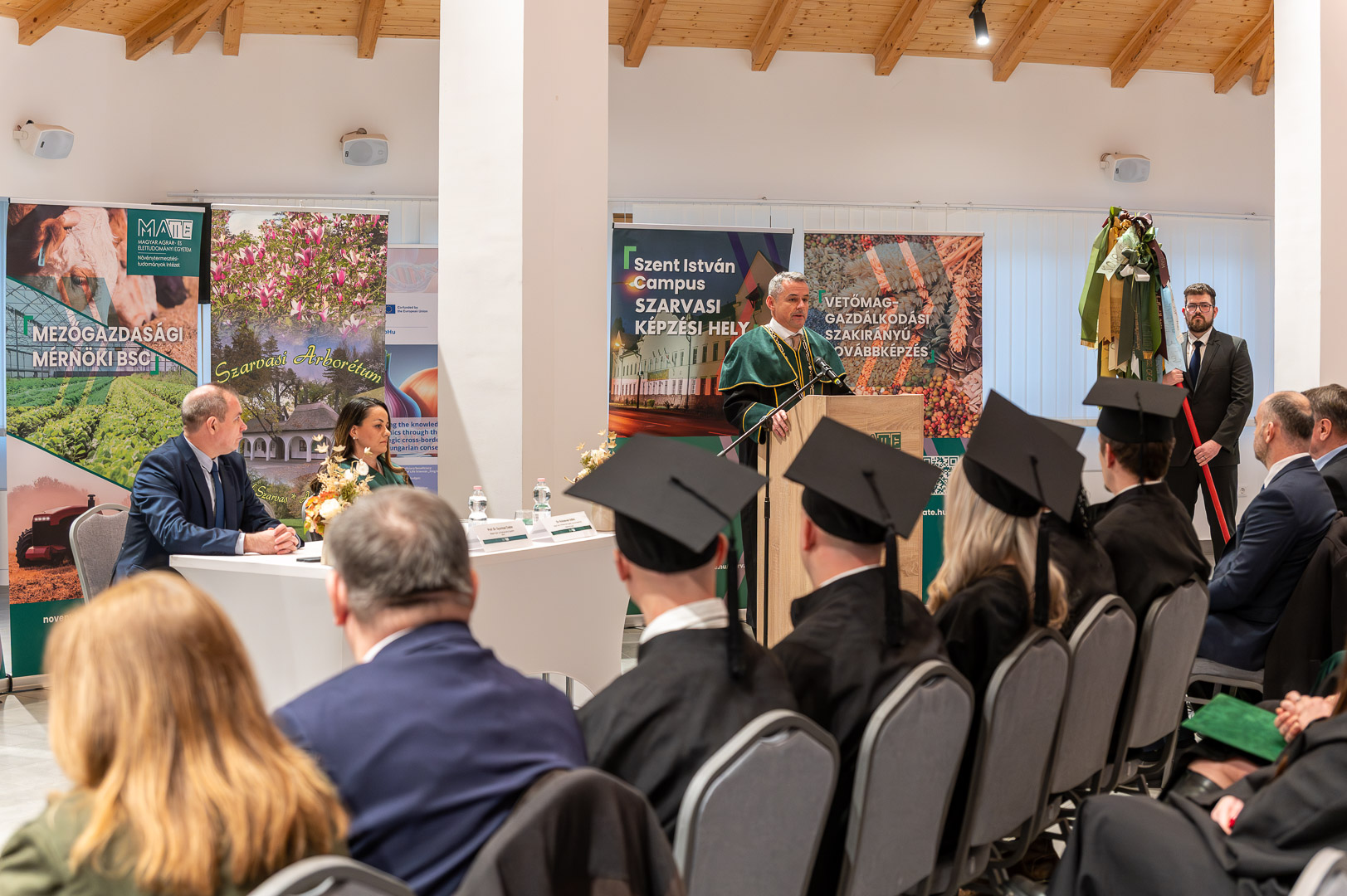 A Magyar Agrár- és Élettudományi Egyetem (MATE) Szarvasi Campusának az Erzsébet-ligeti Pavilonban péntek délután tartott diplomaátadóján Gyuricza Csaba rektor köszöntötte a végzősöket, kiemelve az agrárképzés stratégiai jelentőségét a gyorsan változó világban. Rámutatott, hogy a háborúk és globális válságok idején felértékelődött az élelmezésbiztonság és az önellátás képessége, ezért kulcsfontosságú, hogy hazánk jól képzett agrárszakemberekkel rendelkezzen. A mezőgazdaság technológiai fejlődése – különösen a digitalizáció, a robotika és a mesterséges intelligencia alkalmazása – új tudást és állandó megújulást követel, miközben hazánkban továbbra is hiány van felsőfokú képesítéssel bíró szakemberekből.