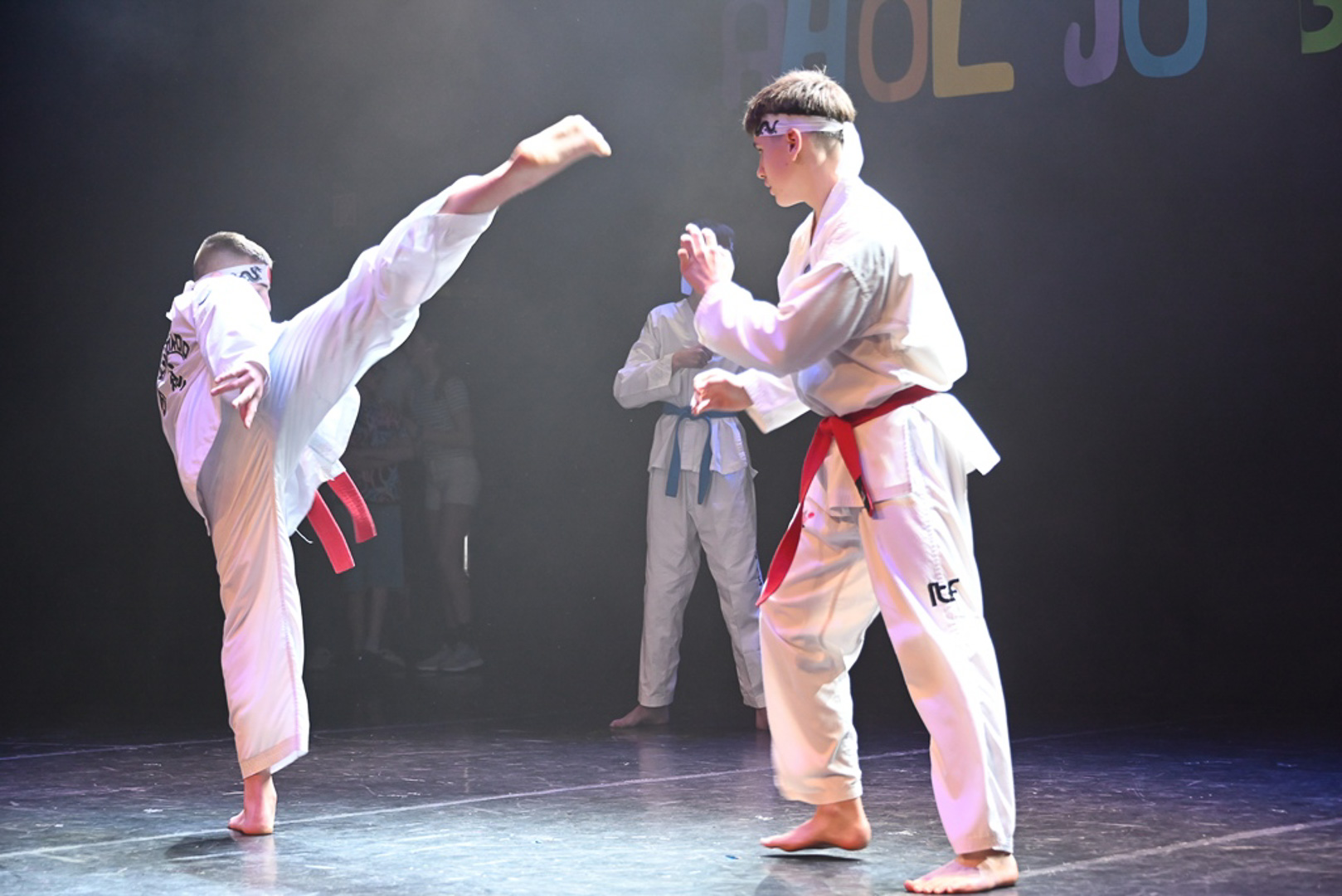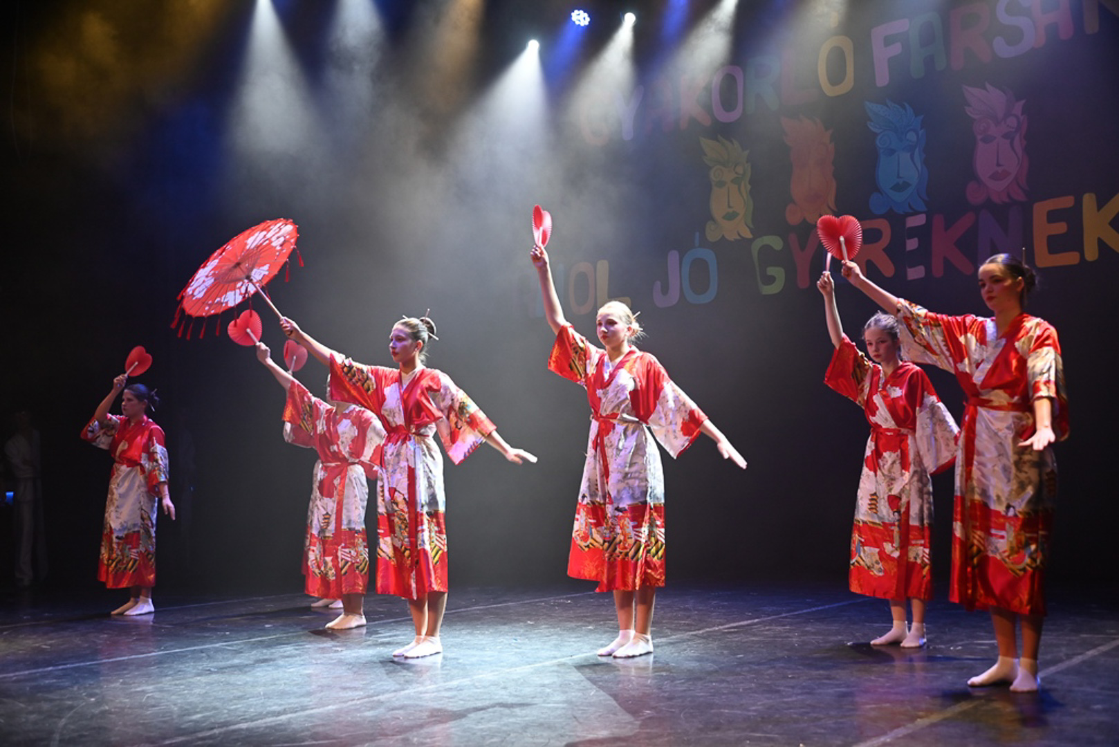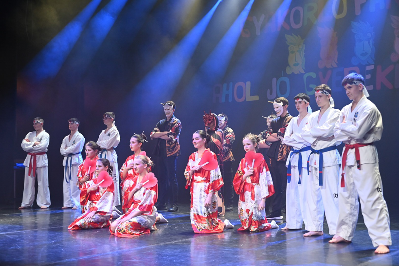 A misztikum és a fegyelem világába a 8. b osztály kalauzolt el minket, akik Japán tájaira vittek: sárkány-nindzsák, fehér harcosok és kimonós lányok látványos küzdelmét láthattuk. A produkció Stafira-Lovas Ilona és Farkas Boglárka munkáját dicsérve Gyula egy stílusos „Induljon a bánszáááááj!” felkiáltással indította útjára. A csodálatos produkció méltó utolsó farsangi gála fellépése volt a 8.b-seknek, rengeteg feledhetetlen élményt szereztek az elmúlt években a nagyérdemű közönségnek. A sportrajongók örömére az 5. b osztály a színpadot sportarénává alakította, ahol a „farsangi vándorkupa” és a házi feladat mentesség volt a tét. A Piros Renáta és Kugyela Tímea által edzett csapat gólörömmel és pompom-tánccal zárta a rangadót, miközben Gyulabá emlékeztette a közönséget: a büfé bezárt, senki ne menjen sehova. „Kegyetlen” életérzés lett úrrá a színpadon és a nézőtéren egyaránt. Egyként mordult a Cervinus Aréna… Csumbóka! – üzenet innen is Fradinak a Premierbe. Várjuk a nyári „kegyetlent!”