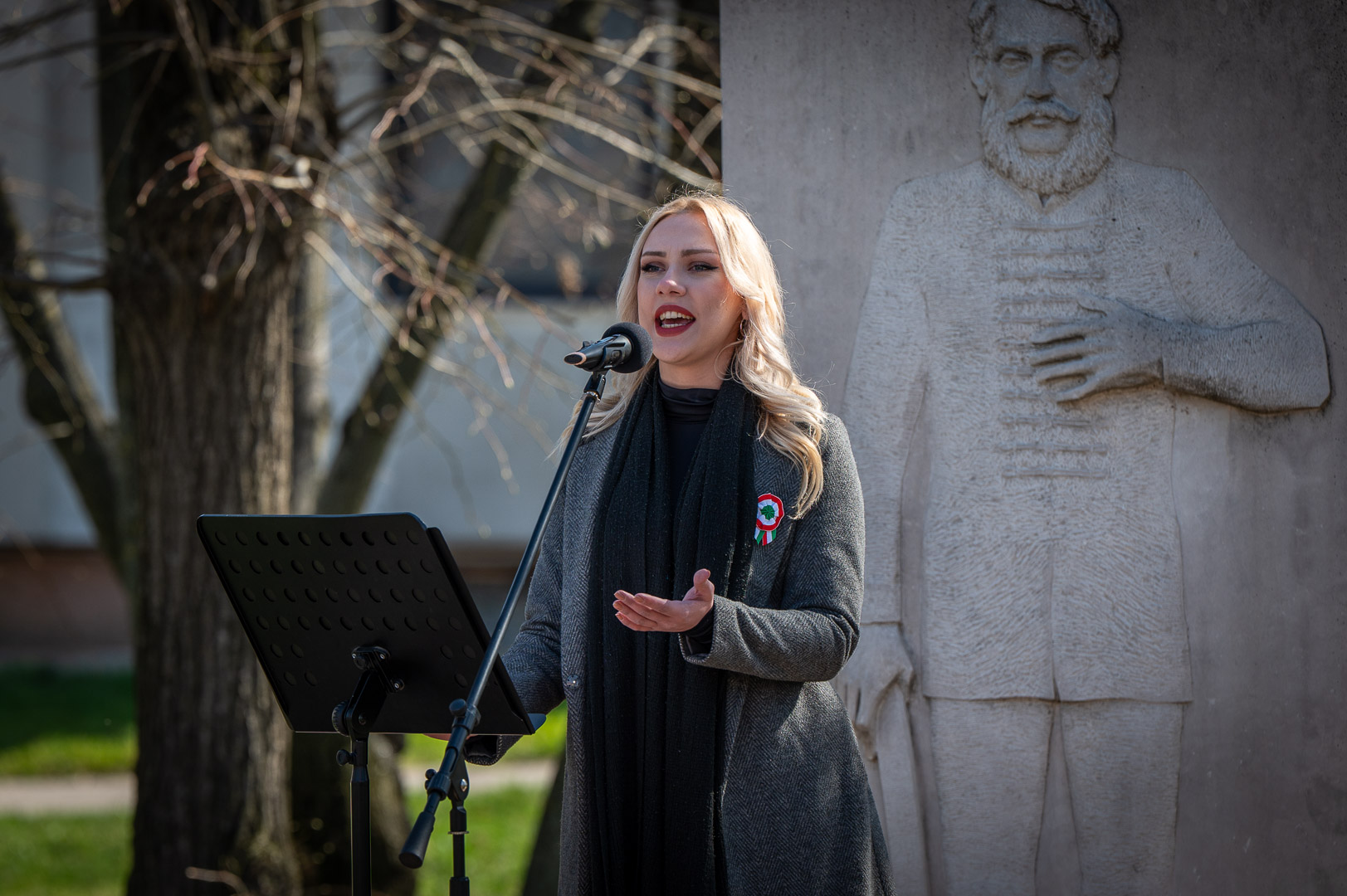Az őt követő Gaál Zsófi énekes színművész nemcsak mint előadó, hanem első sorban mint magyar köszöntötte az ünneplőket. Versekkel, prózával és dalokkal átszőtt előadásában összefoglalta, mit jelent számára, számunkra ez a nap: Március 15-e a magyar nemzet számára nem csupán egy történelmi dátum, hanem a szabadság, az igazság és a méltóság iránti örök vágy szimbóluma, amely generációkon átívelve lüktet a szívekben. Az 1848-as forradalom eszméje szoros egységet alkot a múlt hősies küzdelmeivel, például II. Rákóczi Ferenc jelmondatával, összekötve a Pilvax kávéház lelkes ifjait a hazáért és szabadságért vívott korábbi harcokkal. Ez a nap a közös örökségről szól, amelyben a szavak ereje, a 12 pont követelései és a Nemzeti dal buzdítása egyetlen elszánt nemzetté kovácsolta a magyarságot. Az ünnepi emlékezésében ugyanakkor a frontvonalak mögötti csendes hősök, az édesanyák és feleségek áldozatvállalása előtt is tisztelgett, akik hittel és reménnyel őrizték az otthont, miközben szeretteiket a csatába engedték. Március 15-e üzenete így válik teljessé: a nemzet ereje nemcsak a harctéri helytállásban, hanem a családok összetartásában és a Kárpát-medencei közös gyökerekben rejlik. Ez a nap arra emlékeztet bennünket, hogy a magyar nép mindaddig él és létezik, amíg képes bízni a jövőben és megőrizni kulturális és lelki egységét.