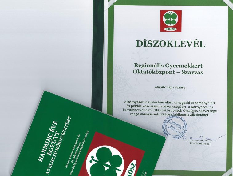 A Környezet- és Természetvédelmi Oktatóközpontok Országos Szövetsége (KOKOSZ) fennállásának 30. évfordulója alkalmából rendezett ünnepi ülésén díszoklevéllel ismerte el a szarvasi Regionális Gyermekkert Oktatóközpont alapító munkáját és kimagasló szakmai tevékenységét.