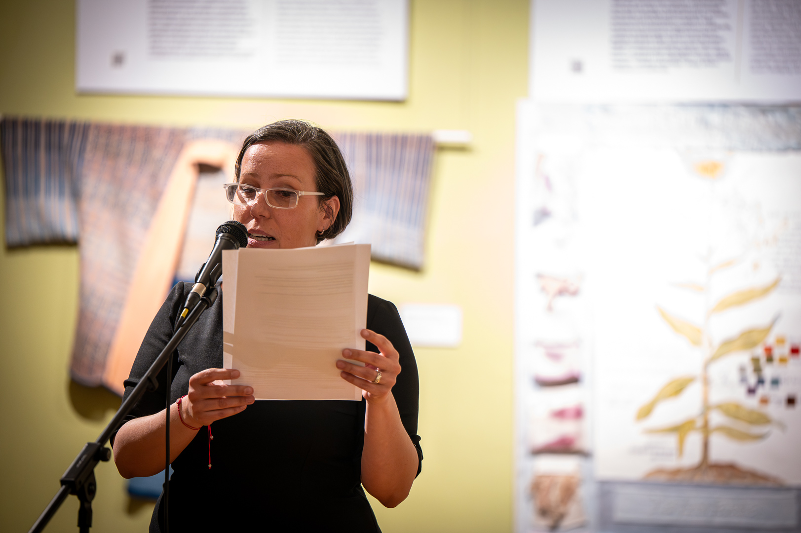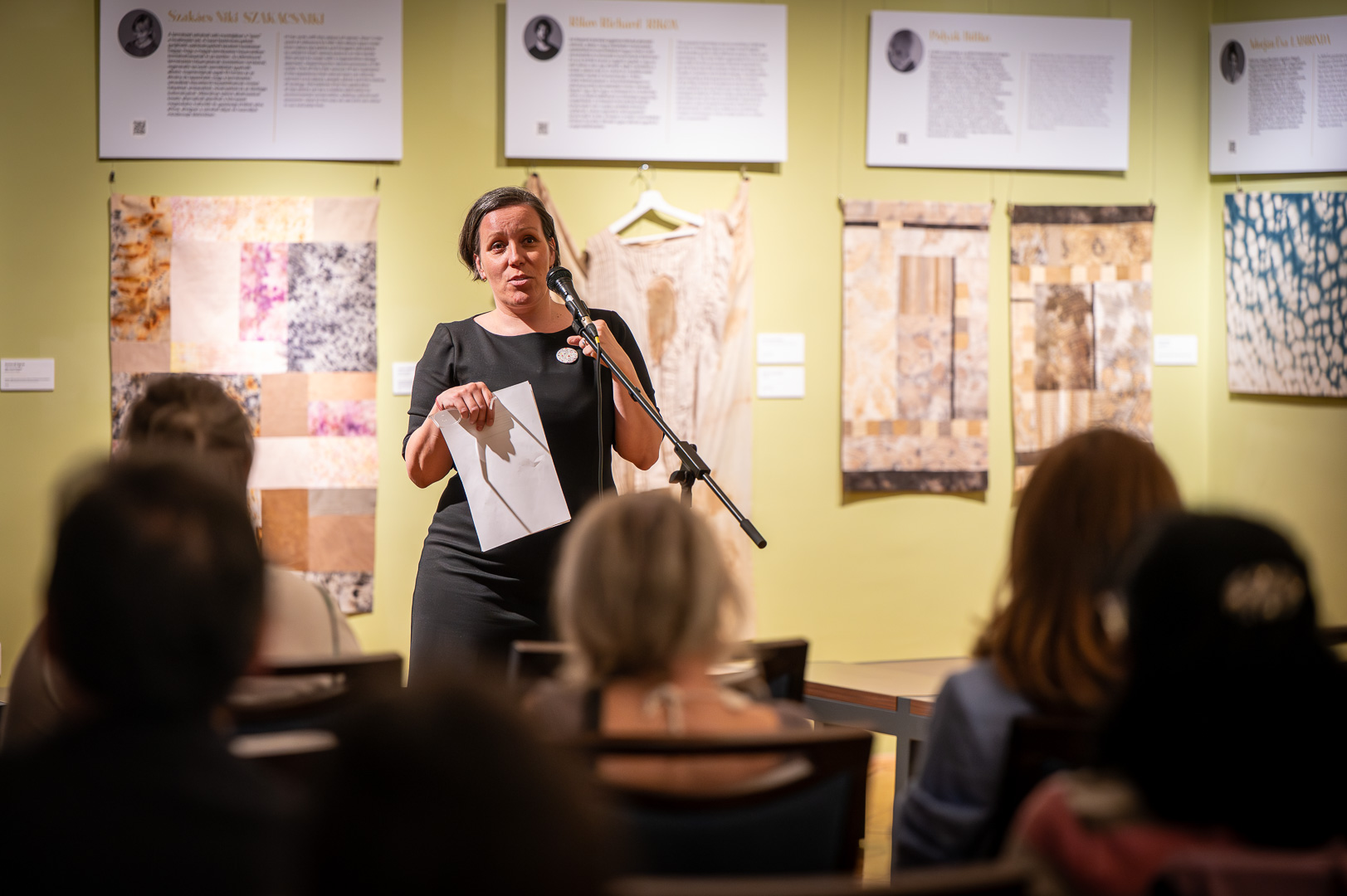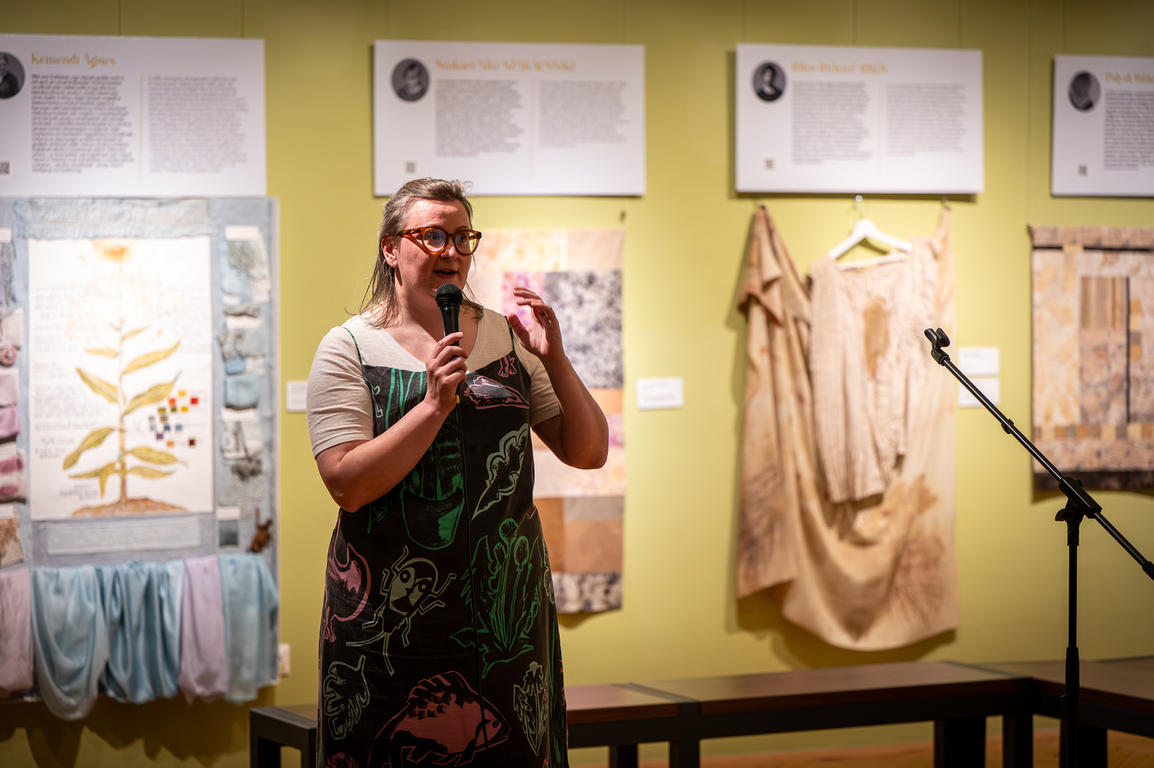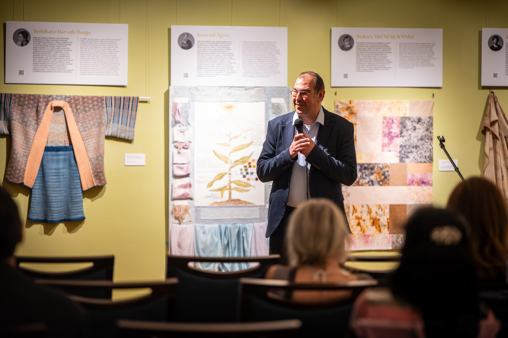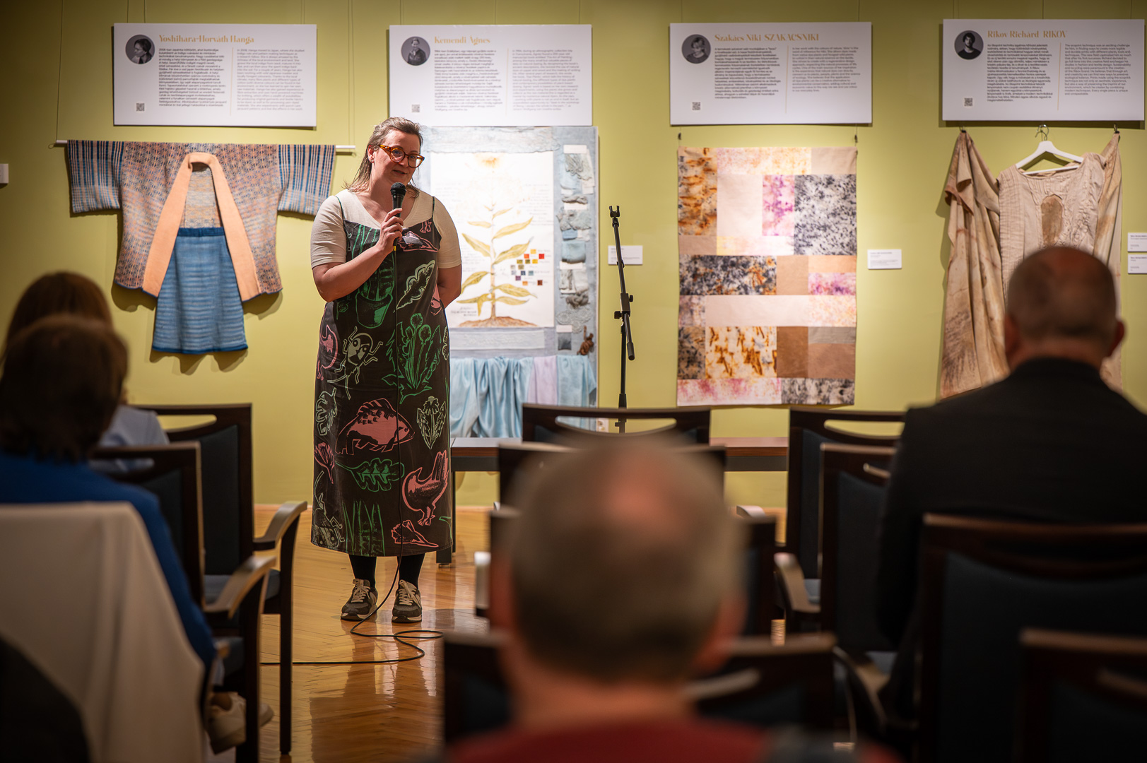 Fazekas Ildikó dizájnmenedzser, Békés megyei származású szakember megnyitó beszédében személyes emlékeken, gyermekkori kertélményeken és irodalmi utalásokon keresztül világított rá a növények és a textíliák elválaszthatatlan kapcsolatára. Beszédében megidézte a „belezöldült nadrág” gyermeki báját és Michel Foucault kert-filozófiáját, rámutatva, hogy a természetes festés nem csupán technológia, hanem rítus és történetmesélés is.