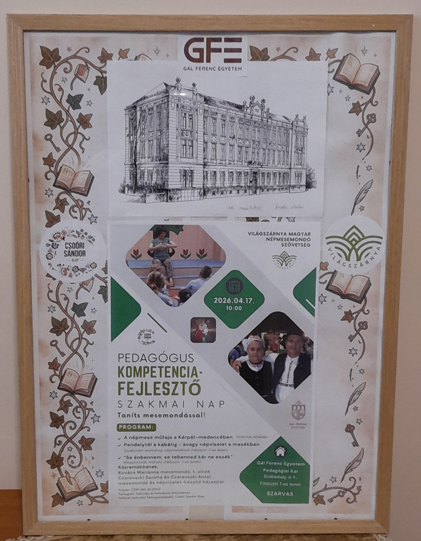 2026. április 17-én a Gál Ferenc Egyetem Pedagógiai Karán „Taníts mesemondással” címmel került megrendezésre a népmesék világát fókuszba helyező kompetencia-fejlesztő szakmai nap az érdeklődő hallgatók és pedagógusok számára.