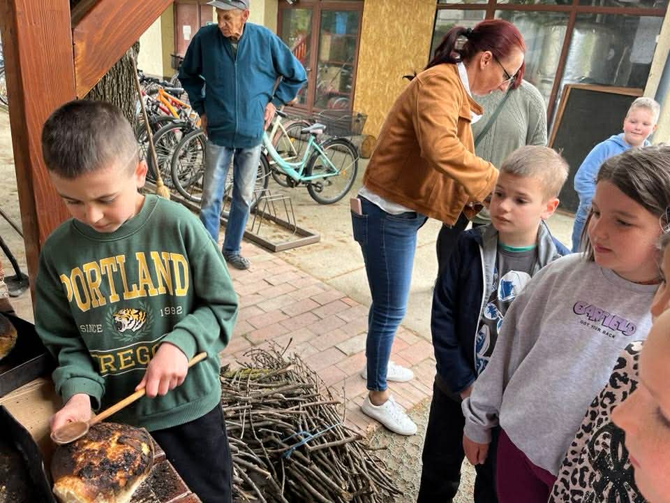 A gasztronómiai élmények itt nem értek véget: Skorka Jani bácsi és felesége Edit néni, nagyszülői szeretettel segítették a gyerekeket abban, hogy bográcsban paprikáskrumplit készítsenek. Ez az alkalom nemcsak a főzésről szólt, hanem a közösségi élményről, az együttműködésről és a hagyományos ételek megbecsüléséről is.