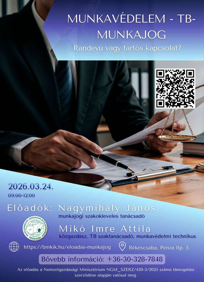 A Békés Vármegyei Kereskedelmi és Iparkamara konzultációval egybekötött ingyenes előadást szervez a Békés vármegyei vállalkozások részére MUNKAVÉDELEM – TB – MUNKAJOGRANDEVÚ