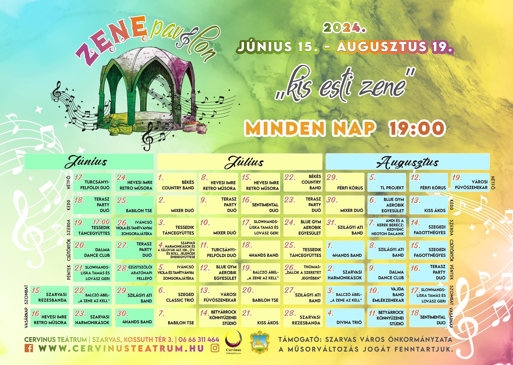 Zenepavilon 2024szo15jún(jún 15)19:00hé19aug(aug 19)19:00(június 15) 19:00 - (augusztus 19) 19:00 Zenepavilon, Kossuth térCompleted