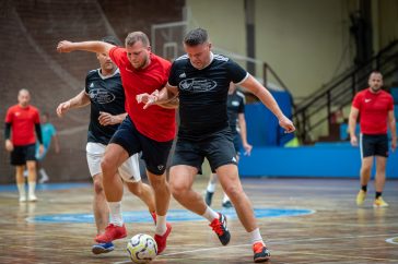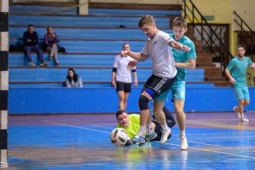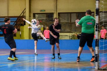 • Barta Gábor és Seres Viktor (pirosban, Gólgyártók) igyekszik megakadályozni Kozák Balázst (türkizben, ProGym) a kapuralövésben.