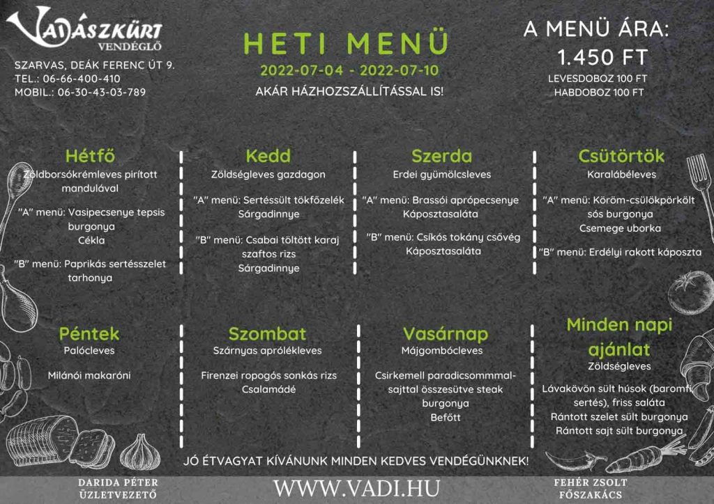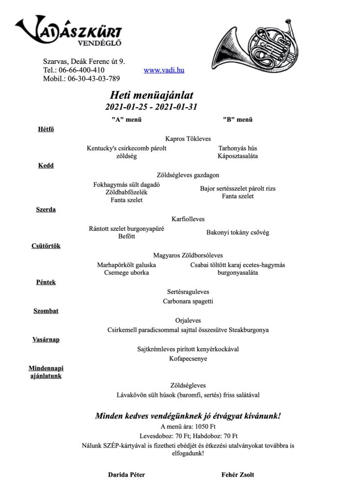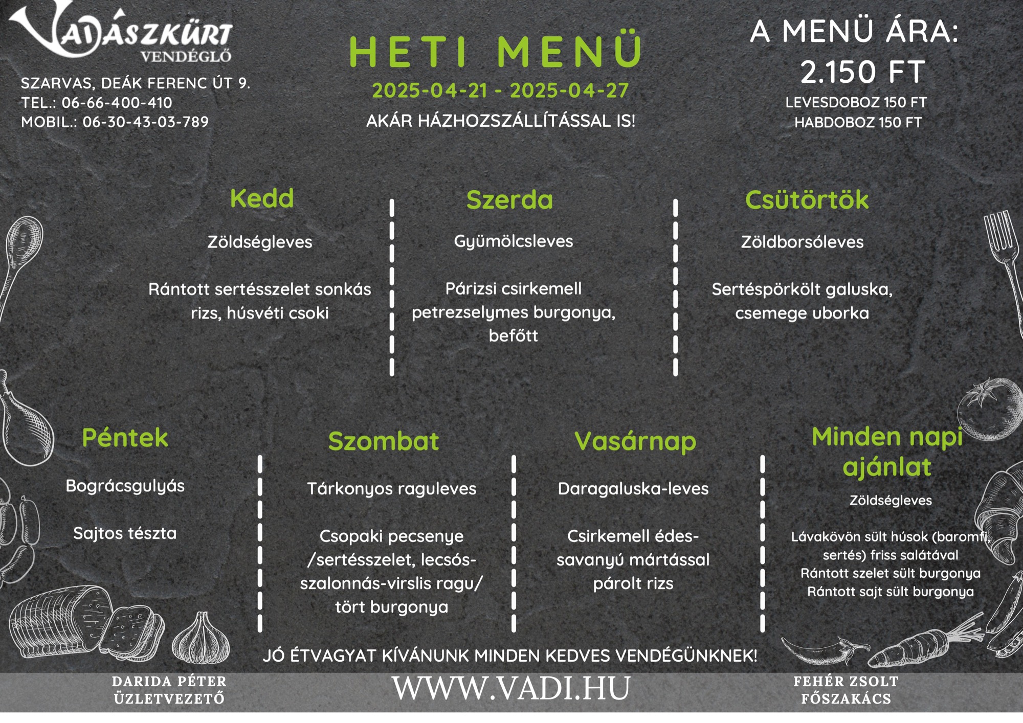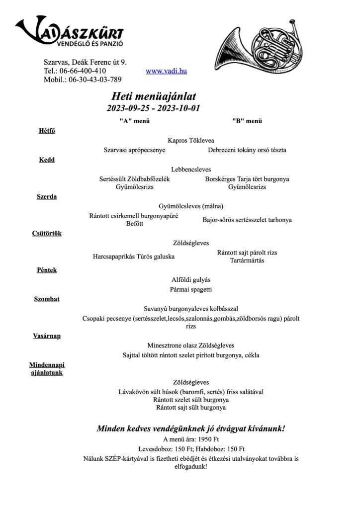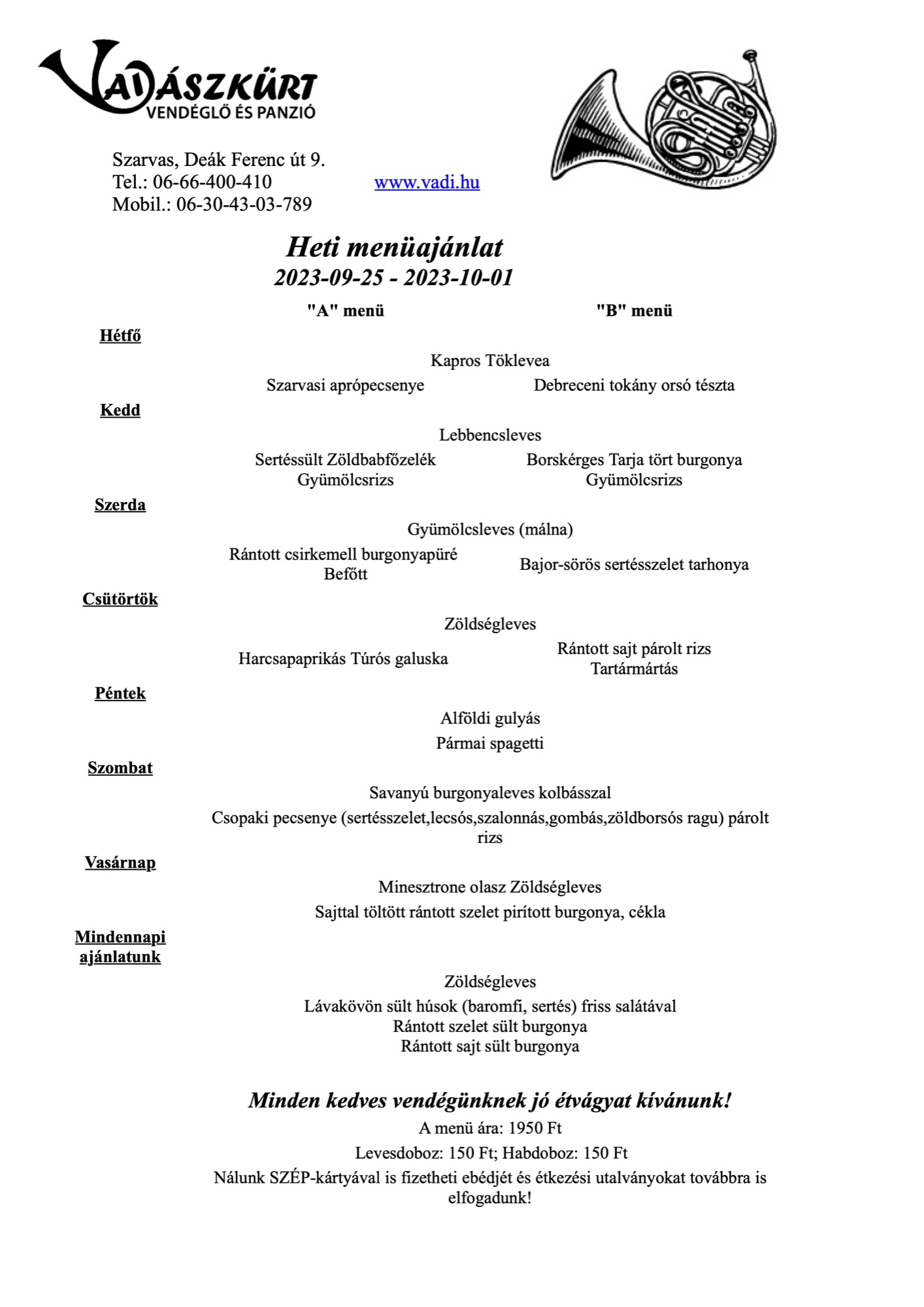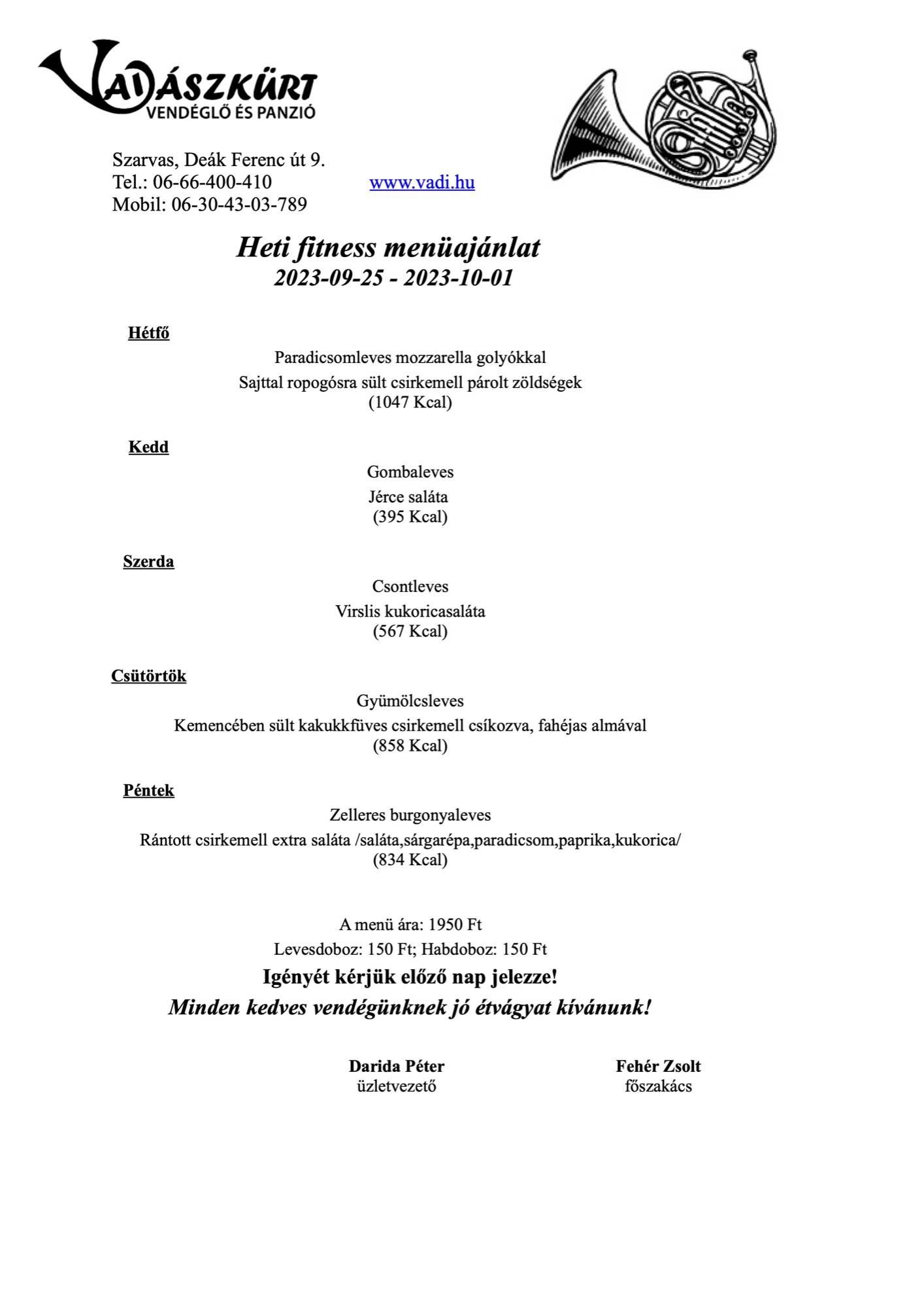 in Menü Vadászkürt Vendéglő menüje by Babák Z 2008-04-19, 21:24 61k Views 33megosztás Facebook Vadászkürt Vendéglő Szarvas, Deák Ferenc u.9.Tel:.06/66-400-410 Szeretettel várjuk kedves Vendégeinket! Darida Péter Fehér Zsoltüzletvezető főszakács menü33megosztás Facebook See more Previous article Szentandrás kikapott sajátmagától Next article Korona Gyorsétterem menüje Next post