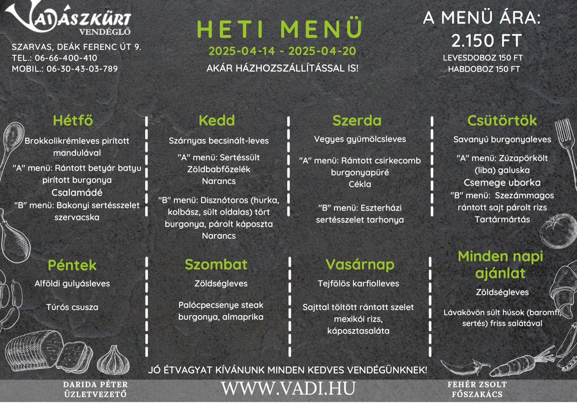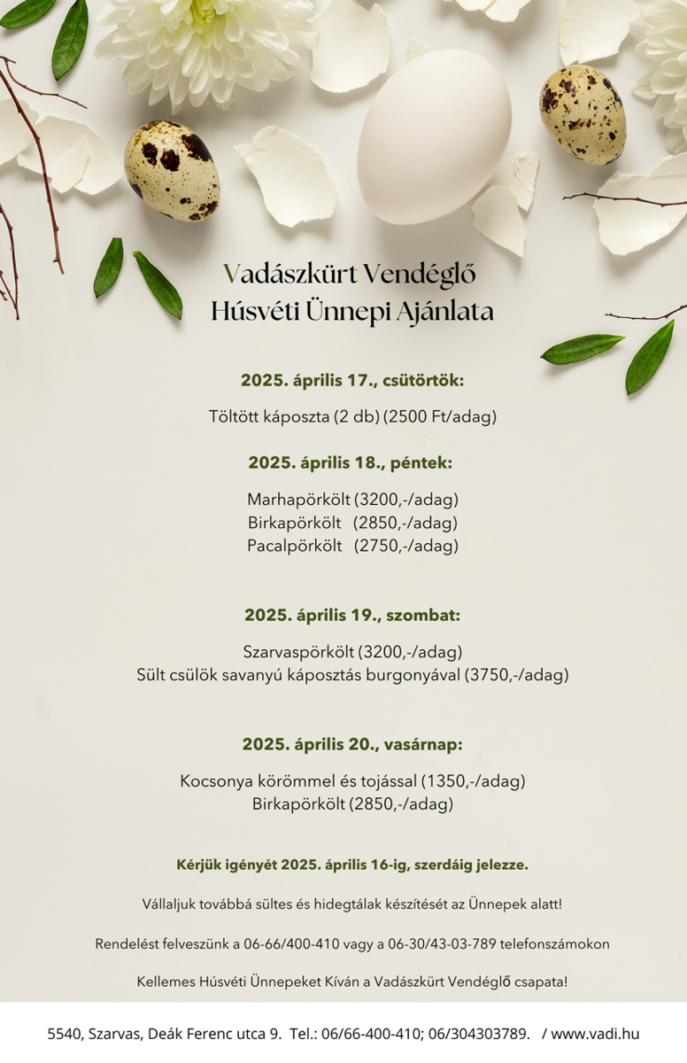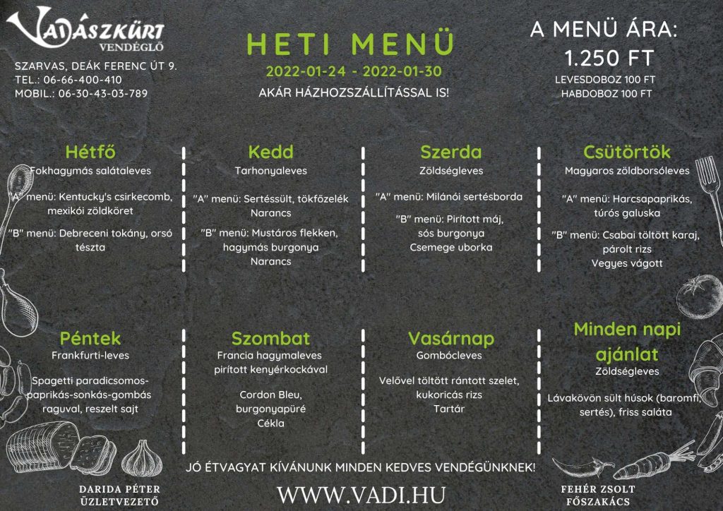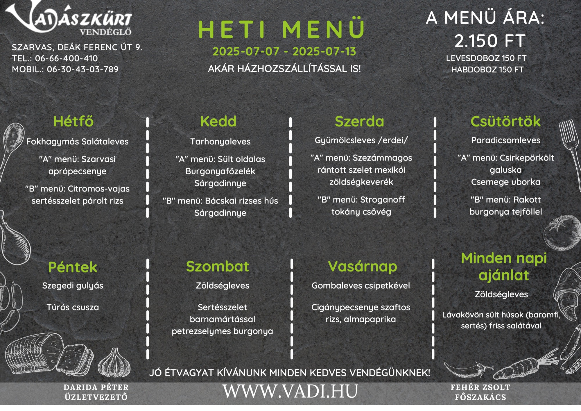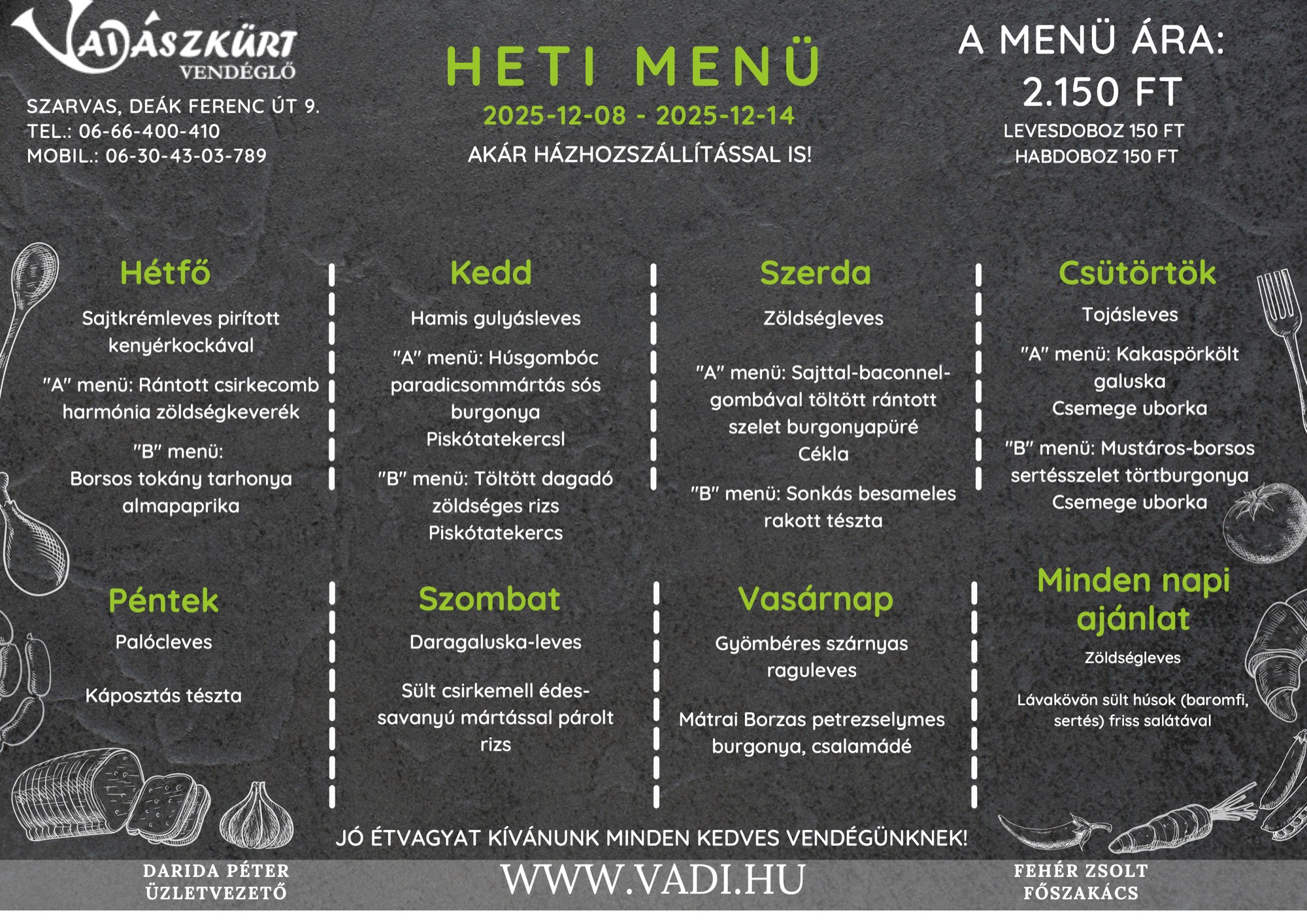 in Menü Vadászkürt Vendéglő menüje by Babák Z 2008-04-19, 21:24 61k Views 33megosztás Facebook Vadászkürt Vendéglő Szarvas, Deák Ferenc u.9.Tel:.06/66-400-410 Szeretettel várjuk kedves Vendégeinket! Darida Péter Fehér Zsoltüzletvezető főszakács menü33megosztás Facebook See more Previous article Szentandrás kikapott sajátmagától Next article Korona Gyorsétterem menüje Next post