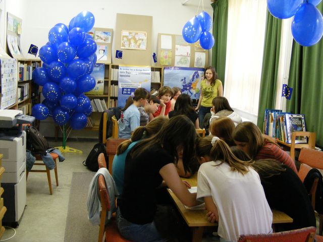 Ennek keretében vetélkedőt szerveztünk általános iskolások részére az Európai Unióról Európa Napja és az uniós csatlakozás napja alkalmából a Városi Könyvtár gyermek részlegében.
