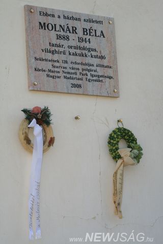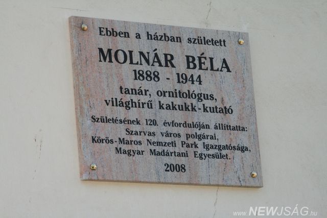 A szarvasi származású ornitológus, Molnár Béla emléktáblájának avatása volt ma szülőházánál, a Rákóczi u. 13-nál. Az eseményen részt vett a Molnár család, a város vezetősége, a város jelene és múltja iránt érdeklődő szarvasiak, valamint Halmos Gergő, a Magyar Madártani és Természetvédelmi Egyesület ügyvezetője, aki elmondta, hogy városunk szülötte olyan, referencia értékűnek tekintett munkát végzett, amit máig rendszeresen citálnak a kakukk furcsa viselkedésének kutatása során.
