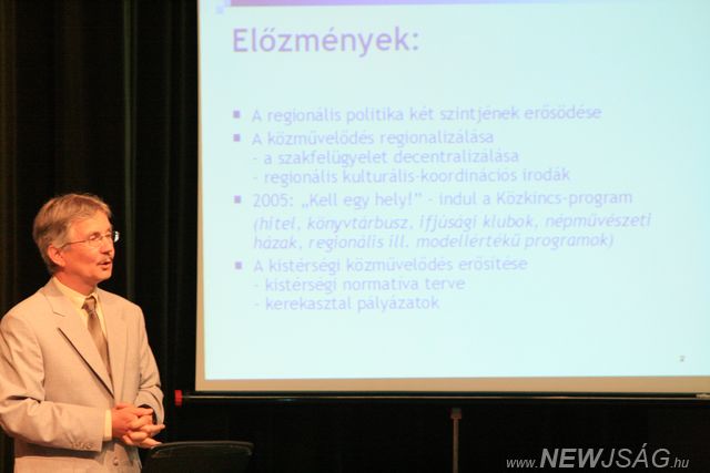 A Polgármester megnyitója után három előadás követte egymást. Török József (Dél-alföldi Régió) Gábor Klára (Komárom) és Csasztvan András (Szarvas) az alapítványok helyzetéről, működésének sikereiről és nehézségeiről beszélt. A példákat és a háttéranyagot ki-ki a saját területéről hozta. „Lazításul” a Zeneiskola tanulóiból szervezett kamaraegyüttesek szórakoztatták a megjelenteket. (A Vass testvérek, Darida Katka és Szklenár Roberta, ill a Soós család három tagja és Zleszik Pál).