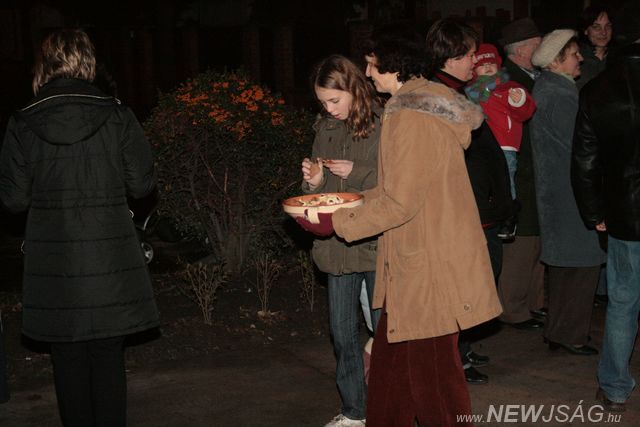 Meggyújtásra került a harmadik gyertya is a Napra-Forgó Galéria udvarán felállított jászol előtt elhelyezett adventi koszorún. A főszerepet ezúttal a harmonika játszotta, de volt ének gitárkísérettel és trombitaszó is. Az áldást Pentaller Attila református lelkész mondta, majd ő is gyújtotta meg a harmadik gyertyát. A gyertyagyújtás kis happeningbe torkollott, a galériások forralt borral, forró teával és sütivel kedveskedtek az érdeklődőknek, akik szemlátomást szívesen vették, mert a tömeg csak nem akart eloszlani.