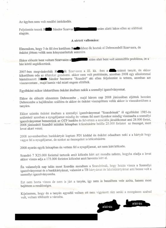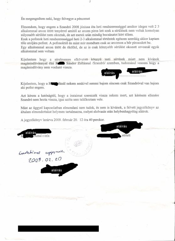 A jegyzőkönyvből látszik, hogy a fogvatartók cselekményei a sértett elmondása szerint éppen csak súrolják a törvénytelenség határát. Egyértelmű, hogy a névtelenségbe burkolózó sértett nem önként adta oda rendszeresen a pénzét és személyi okmányait, valamint hogy a bántalmazása általában túllépte a „súlyos testi sértés” határát. Ezt minden helybeli tanúsítani tudja.
