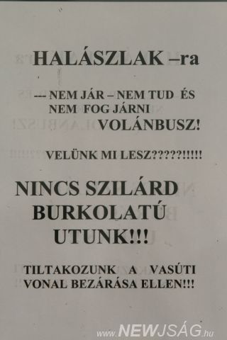 Táblájukon egyszerűen érzékeltették, hogy mi lesz Halászlak vasút nélkül: Halál-lak. Számukra kicsit megnyugtató lehet Polgármesterünk – aki most nem tudott jelen lenni – korábbi kijelentése, hogy valamilyen formában fenn fogják tartani az érintett települések, igaz még a formáját nem tudja, és azért a város lakosságát ennyire érzékenyen érintő témában nem szokott felelőtlenül ígérgetni. Ha ezzel a demonstrációval csak egy évet kap a vasút, attól kezdve a Fidesz-kormány felelőssége lesz betartani ígéretét.