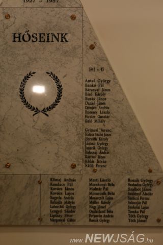 A II. világháborúban elesett hősök névsora: Antal György, Bankó Pál, Baranyai János, Bíró Károly, Buzás János, Dankó János, Demjén András, Enessey László, Forster Gusztáv, Galó Mihály, Gyimesi Ferenc, Halász Szabó János, Horváth Károly, Jánosi György, Janurik György, Kalocsai András, Kálló Ferenc, Kádár István, Karcsai János, Klimaj András, Kondacs Pál, Kovács János, Kovács Lajos, Kugyela András, Kuhajda Mátyás, Laborcfõi György, Lengyel Sándor, Lipthay Péter, Margonyai Gábor, Marti László, Mocskonyi Béla, Molnár Pál, Moravcsik Béla, Moravcsik Lajos, Müller Károly, Nagy József, Oszterland Béla, Petyován András, Roszik György, Roszik György, Szabados György, Szalbot János, Szelényi Aladár, Szenczi Ferenc, Szloszjár Pál, Szokolai Lajos, Tomka Pál, Tóth György, Tóth József