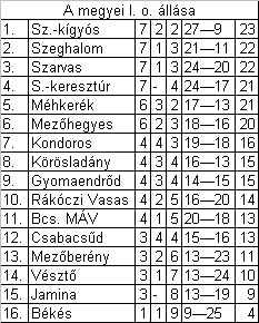 A megyei I. osztályú labdarúgó bajnokság hétvégi fordulóján, a Szarvas FC a bajnoki tabella első helyén tanyázó Szeghalom csapatát fogadta. A szarvasi csapat óriási lelkesedéssel kezdte a mérkőzést, amelynek hamar meg is lett az eredménye, hiszen fiatal játékosuk Becsei már a 7. percben az ellenfél kapujába talált. A szarvas ezután is folyamatosan rohamozott és sorra dolgozta ki a helyzeteket, amelyek sajnos rendre kimaradtak. Majd a 28. percben egy pontos átadás után Klimaj 20-22 méterről, kapásból, óriási gólt lőtt. Bár a forduló többi gólját nem láthattuk, de valószínűleg ez volt a legszebb talált a hétvégén. Ki kell még emelnünk a rendkívül sportszerű játékot, minkét fél részéről és a rendkívül korrekt, precíz, részrehajlástól mentes játékvezetést, amit ritkán tapasztalhatunk megyei szinten. A második félidőben a Szarvas magabiztosan tartotta az eredményt, rendkívül összeszedet volt a csapat, szépen játszottak. Erről mind a nézők, mind a szakvezetők is elismerően nyilatkoztak. A végére maradt az eredmény Szarvas—Szeghalom 2—0 (2—0).