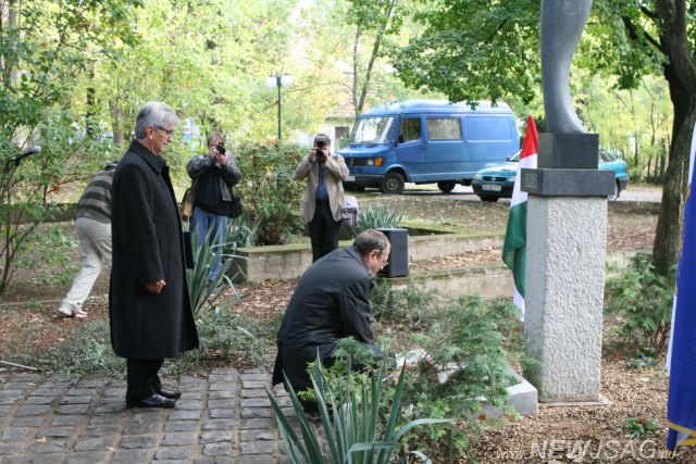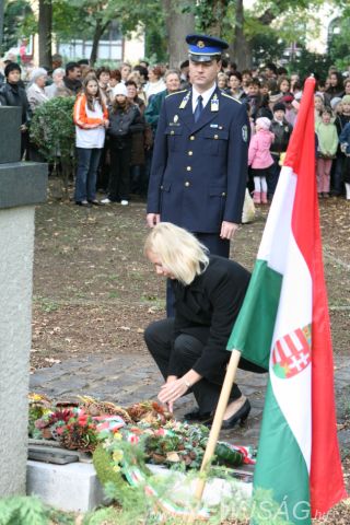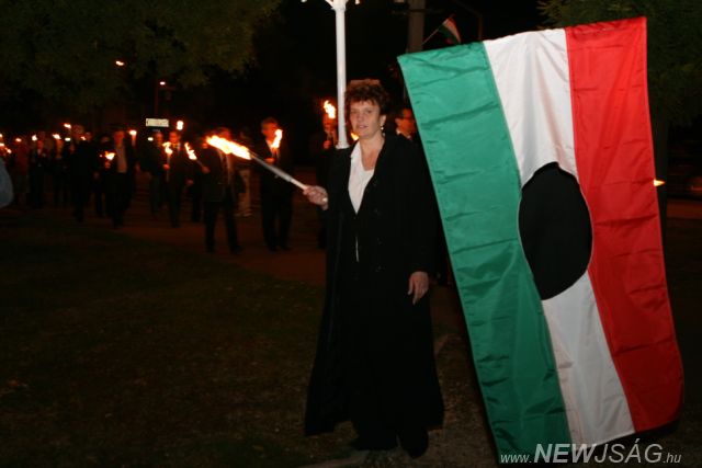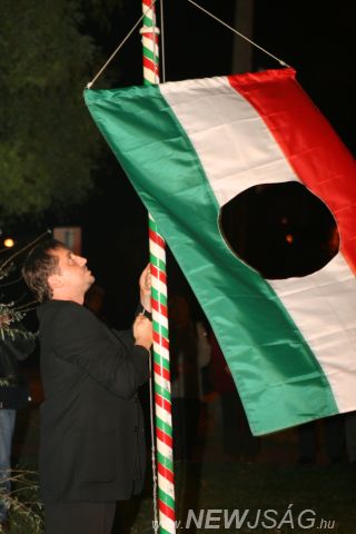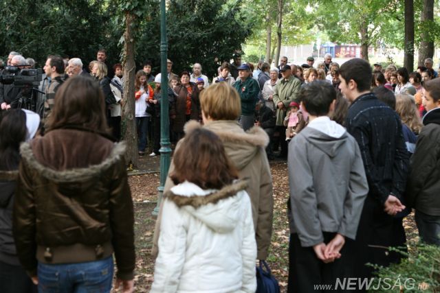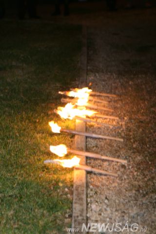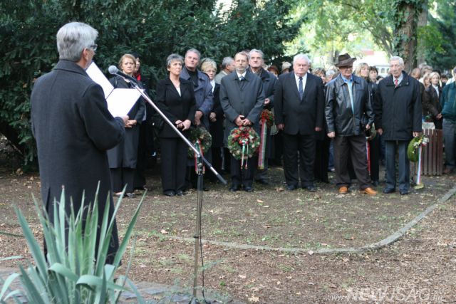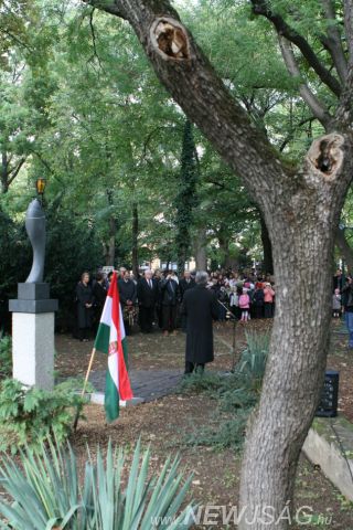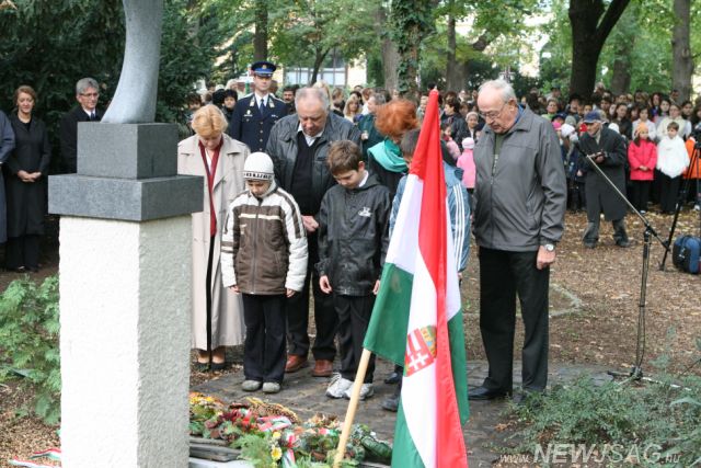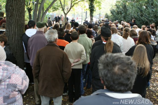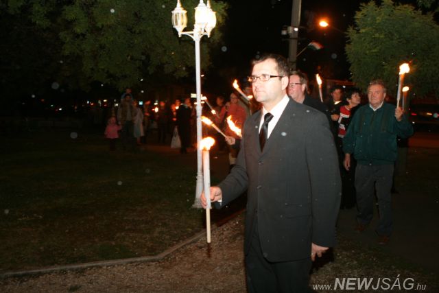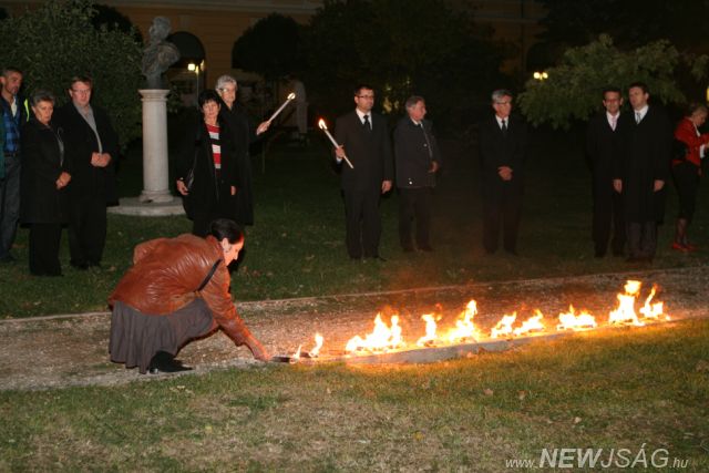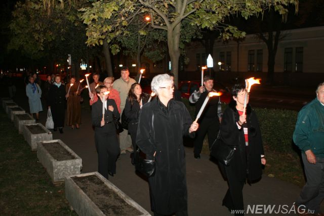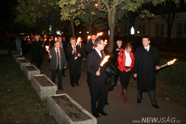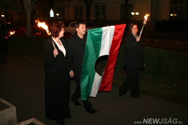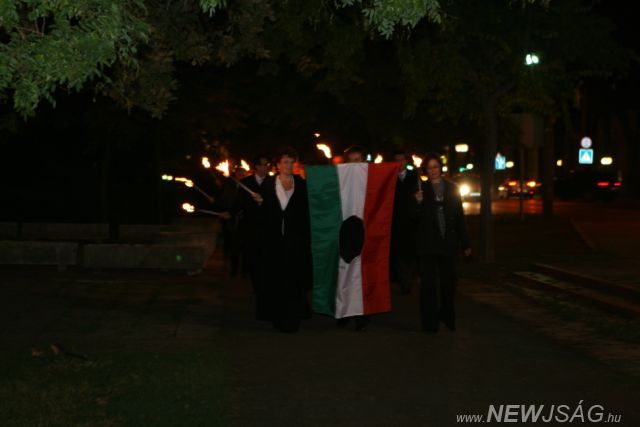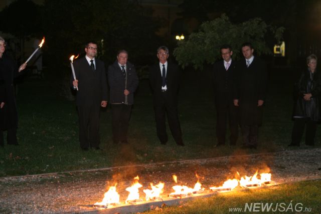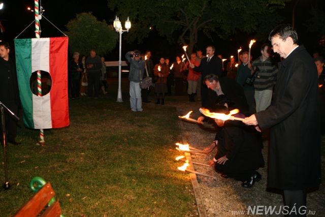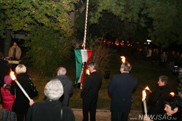 A csütörtök esti „Hungariana” című előadás után a közönség fáklyákkal a kézben a Kossuth térre vonult, ahol felvonásra került az 56-os lobogó. Illyés Gyula „Egy mondat a zsarnokságról” című versét Benkő Géza tolmácsolásában hallhattuk. Innen a tömeg a Történelmi Emlékút 56-os állomásához ment, ahol Szenes János rövid emlékezését hallgathatták meg. Péntek délelőttjén ismét a Kossuth téren gyülekeztek az emlékezők, ezúttal a Szent Klára templom mögötti 56-os emlékműnél. Kiszely András alpolgármester rövid ünnepi beszédben emlékezett az 53 évvel ezelőtti eseményekre, majd a városi szervezetek és a civilek koszorúkat helyeztek el az oszlop alapzatán.