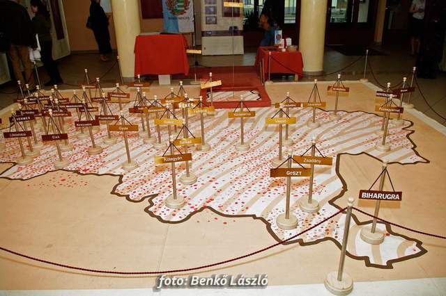A művelődési ház aulájában leterített térképen kis helységnévtáblákkal jelezték hol járt már a kiállítás, s a korábbi helyszíneket bemutató táblák az egész galériát elborították.