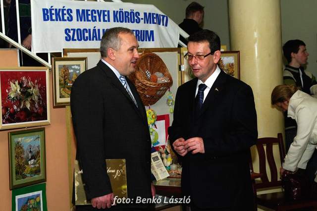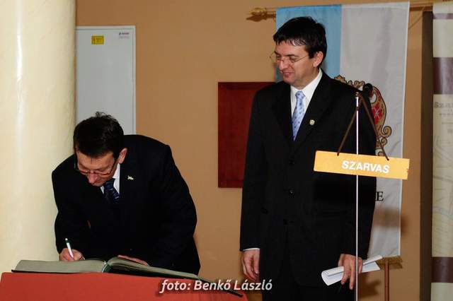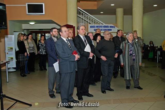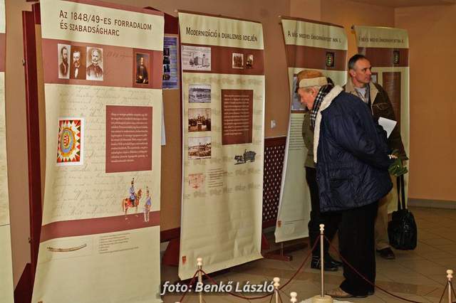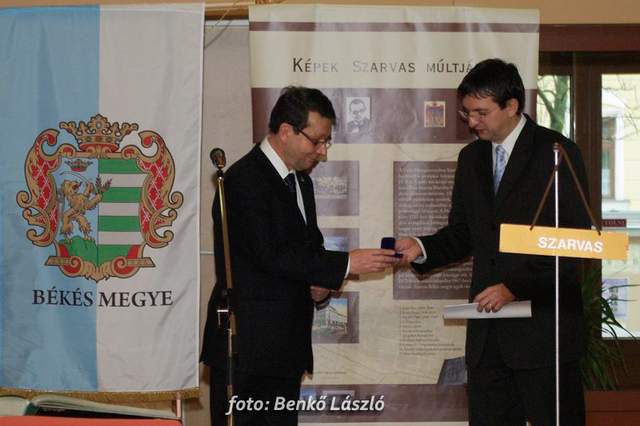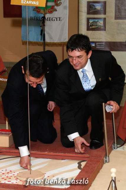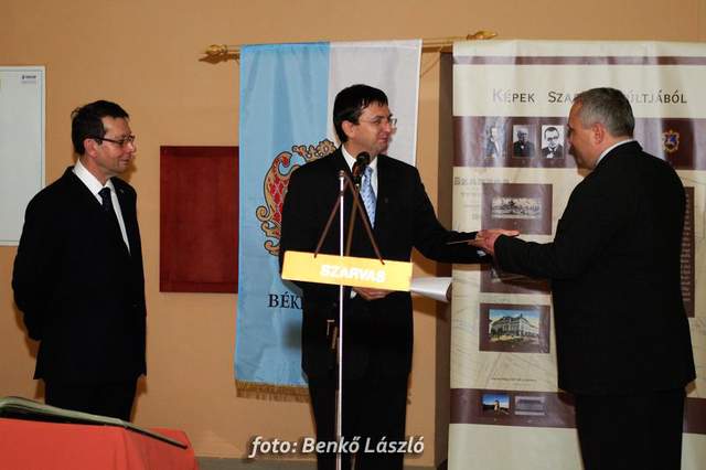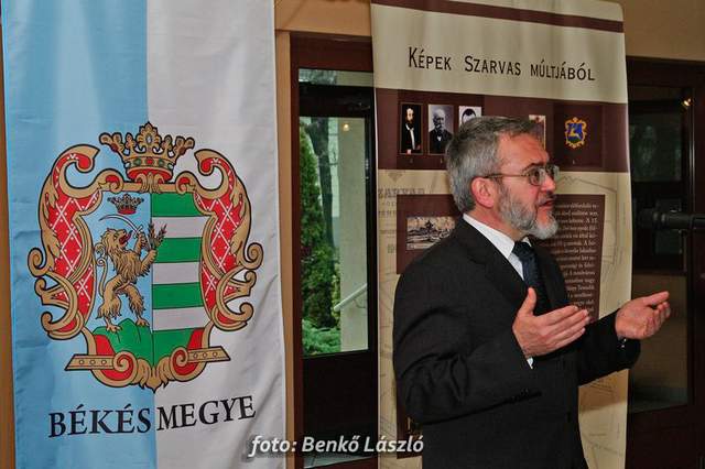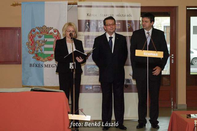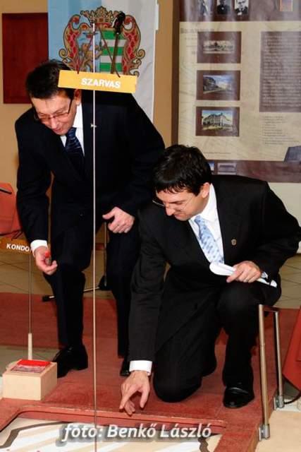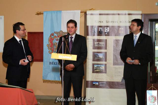 Domokos László a Békés Megyei Közgyűlés elnöke és Babák Mihály polgármester egyszerre helyezték el újlenyomatukat a térkép szarvasi részénél, majd ugyanezt tették a kiállítás megnyitóján megjelentek is, miközben Erdész Ádám a Békés Megyei Levéltár igazgatója tartott izgalmas és érdekes előadást megyénk történetéről.
